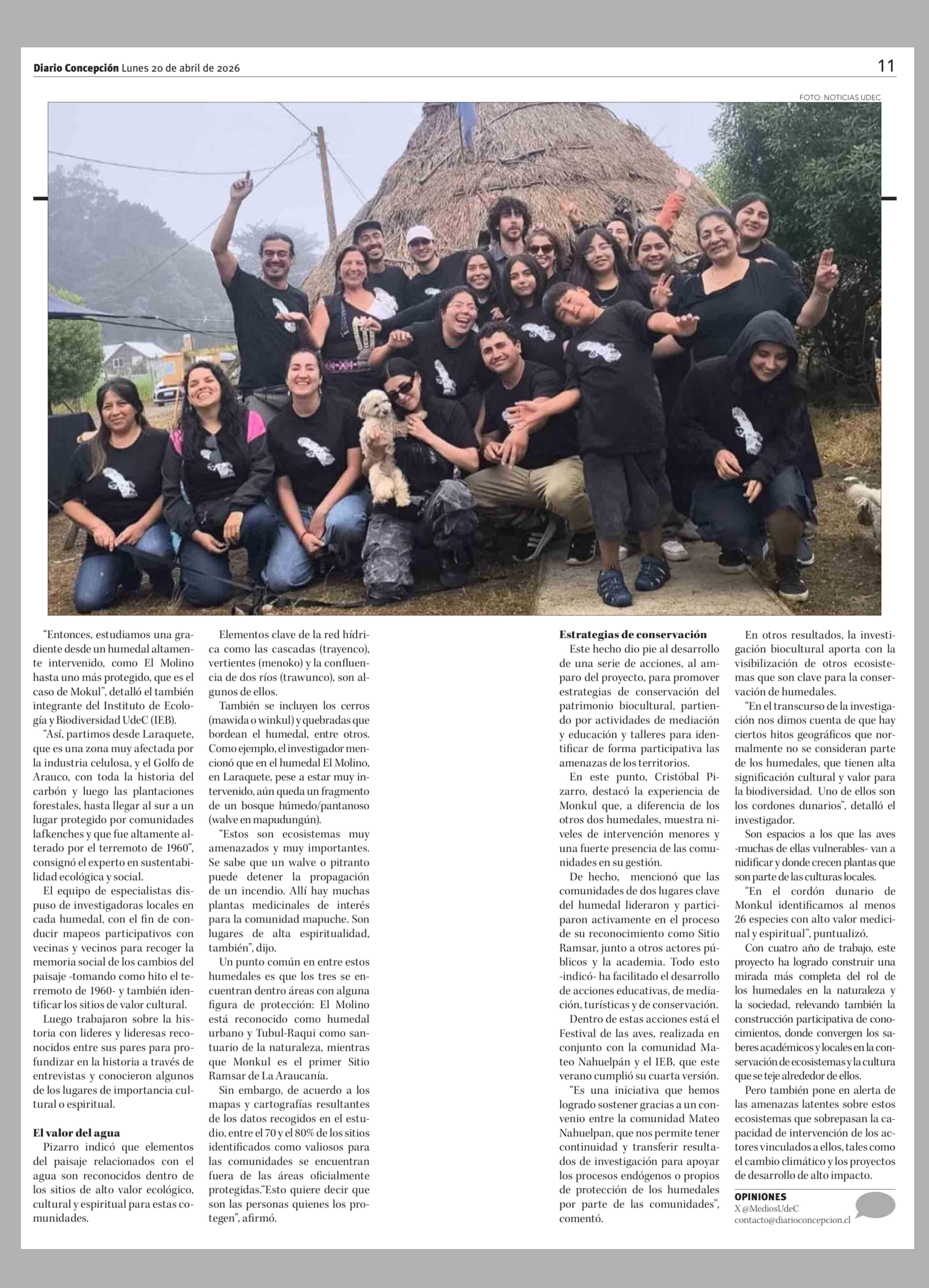 Investigación de la UdeC destaca el valor biocultural de los humedales y rol de las comunidades en su protección 20-04-2026 Diario Concepción |