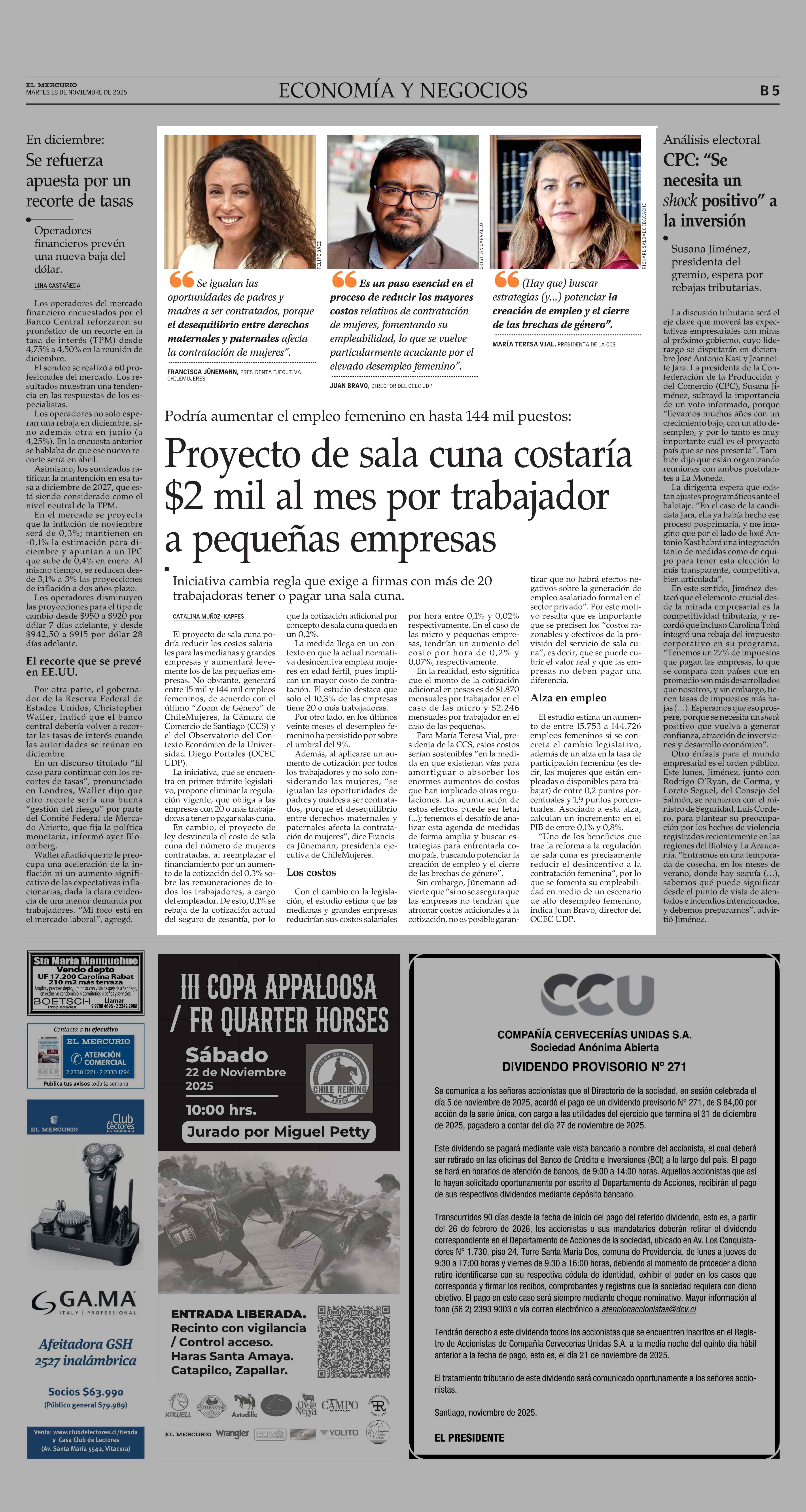 Proyecto de sala cuna costaría $2 mil al mes por trabajador a pequeñas empresas 18-11-2025 El Mercurio |