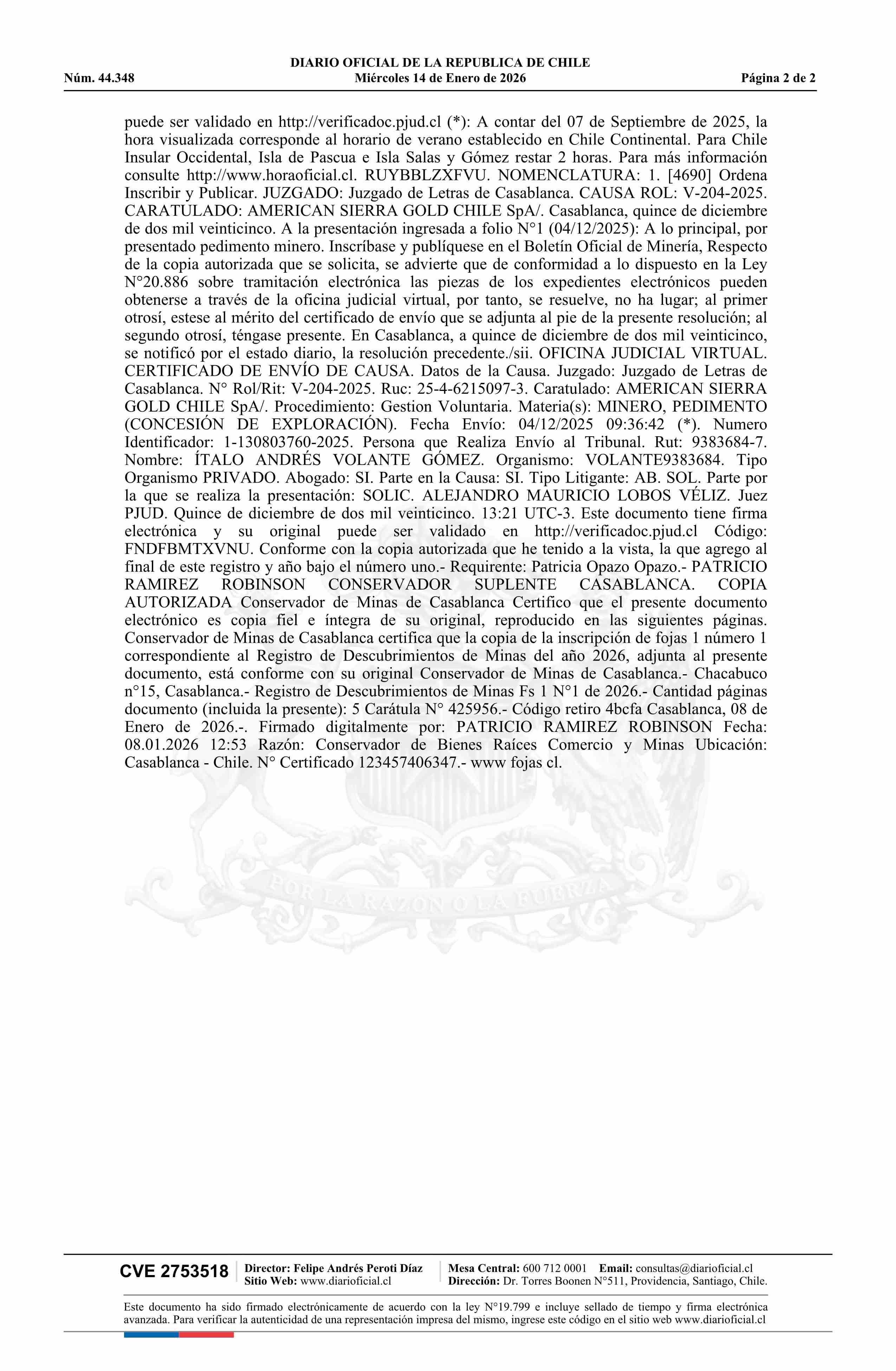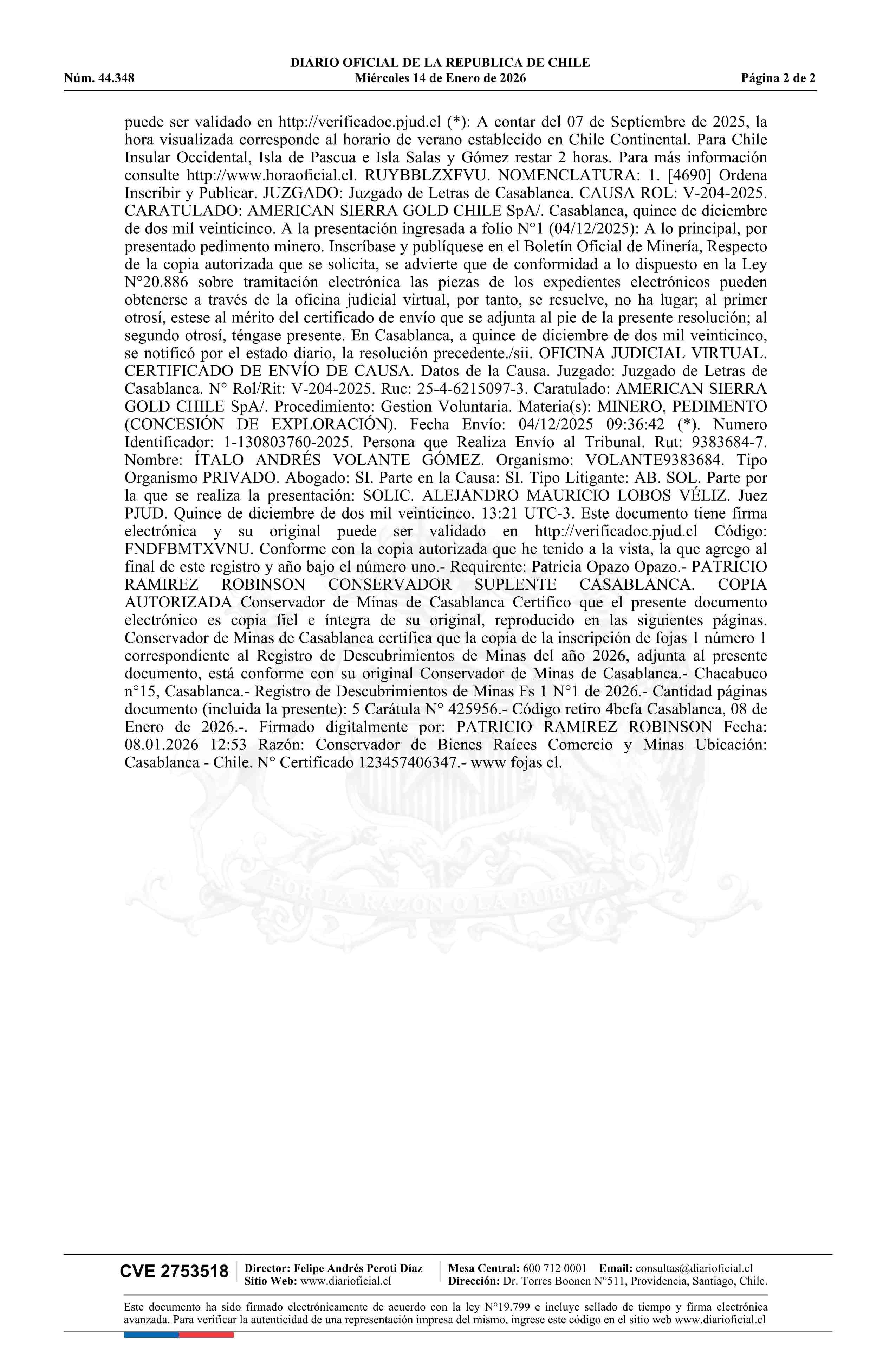 CHANCHO DE ORO 6 / American Sierra Gold Chile SpA 14-01-2026 DIARIO OFICIAL CHILE - BOLETÍN OFICIAL DE MINERÍA |