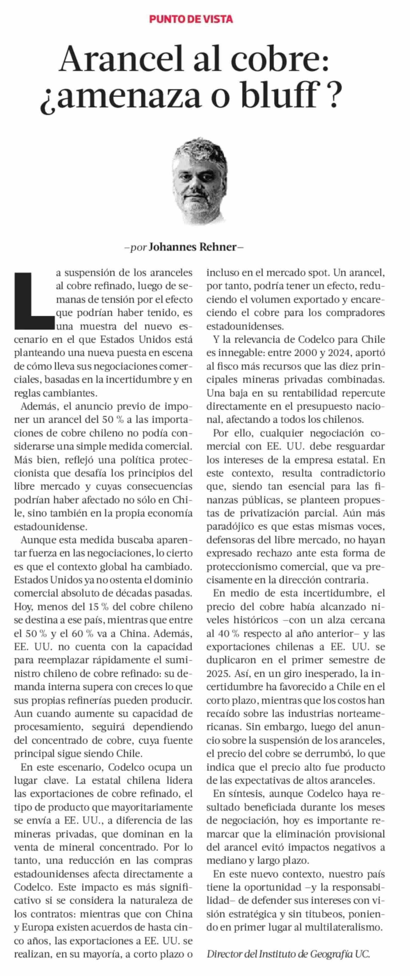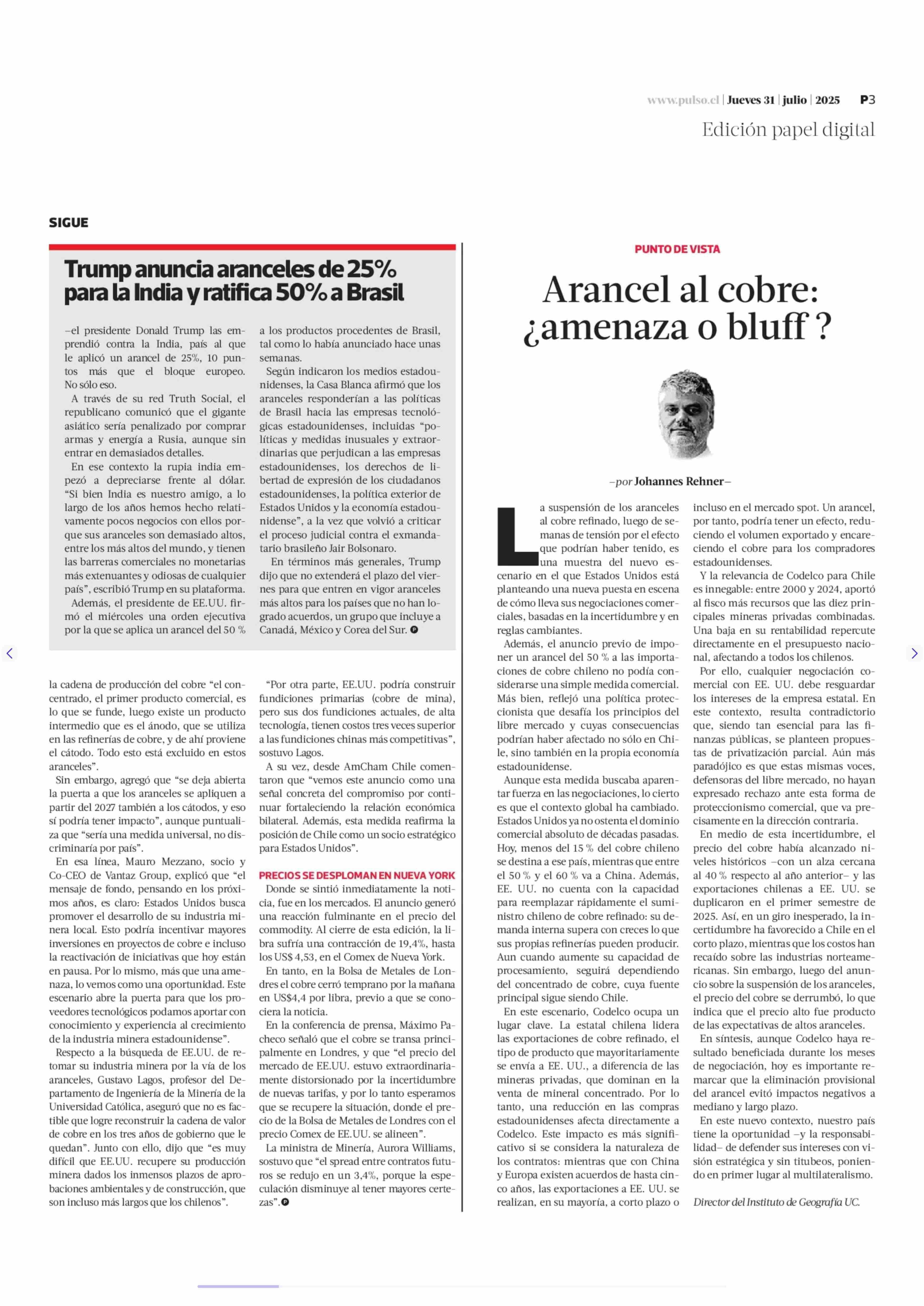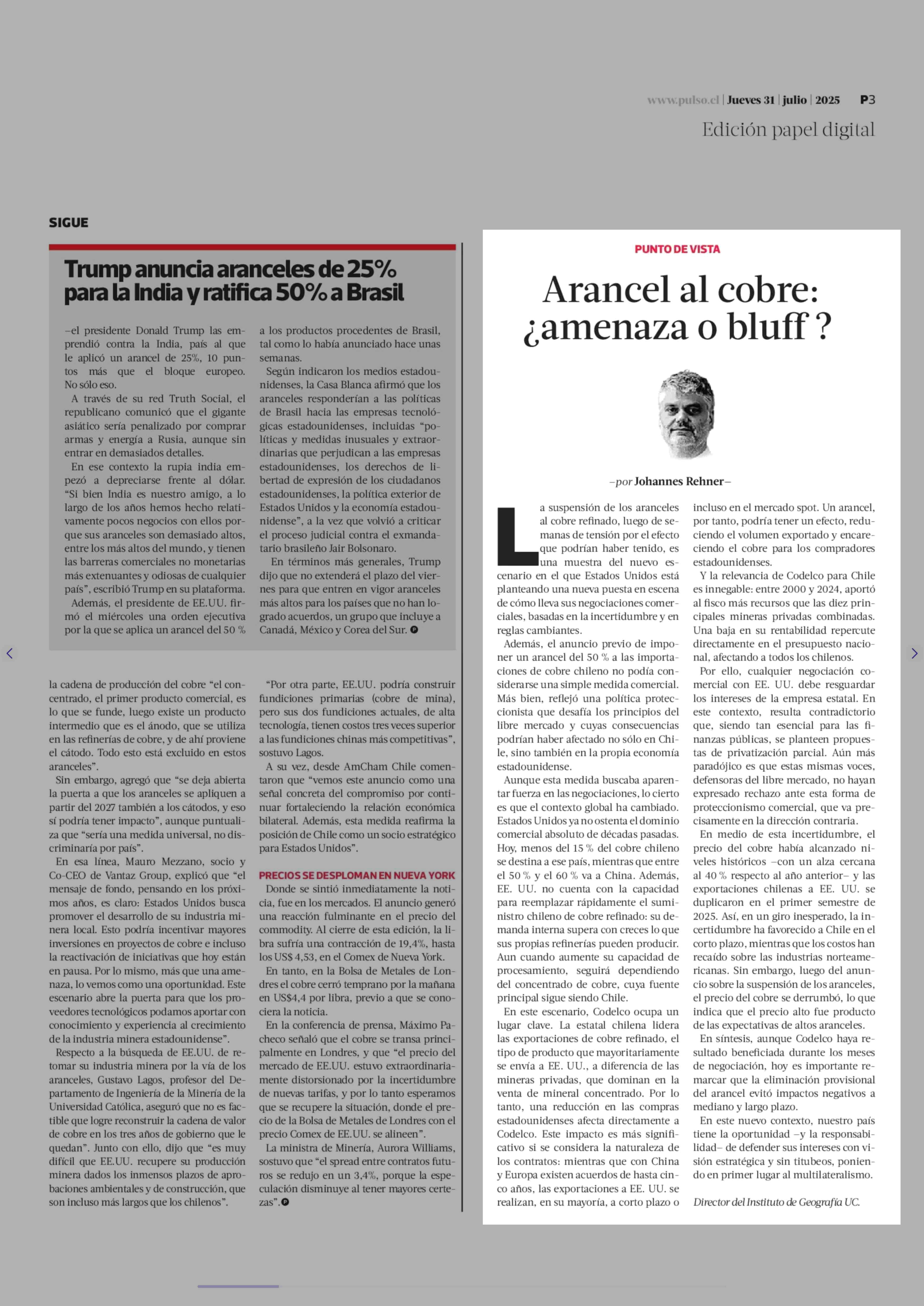COLUMNAS DE OPINIÓN: Arancel al cobre: ¿amenaza o bluff ? 31-07-2025 La Tercera |