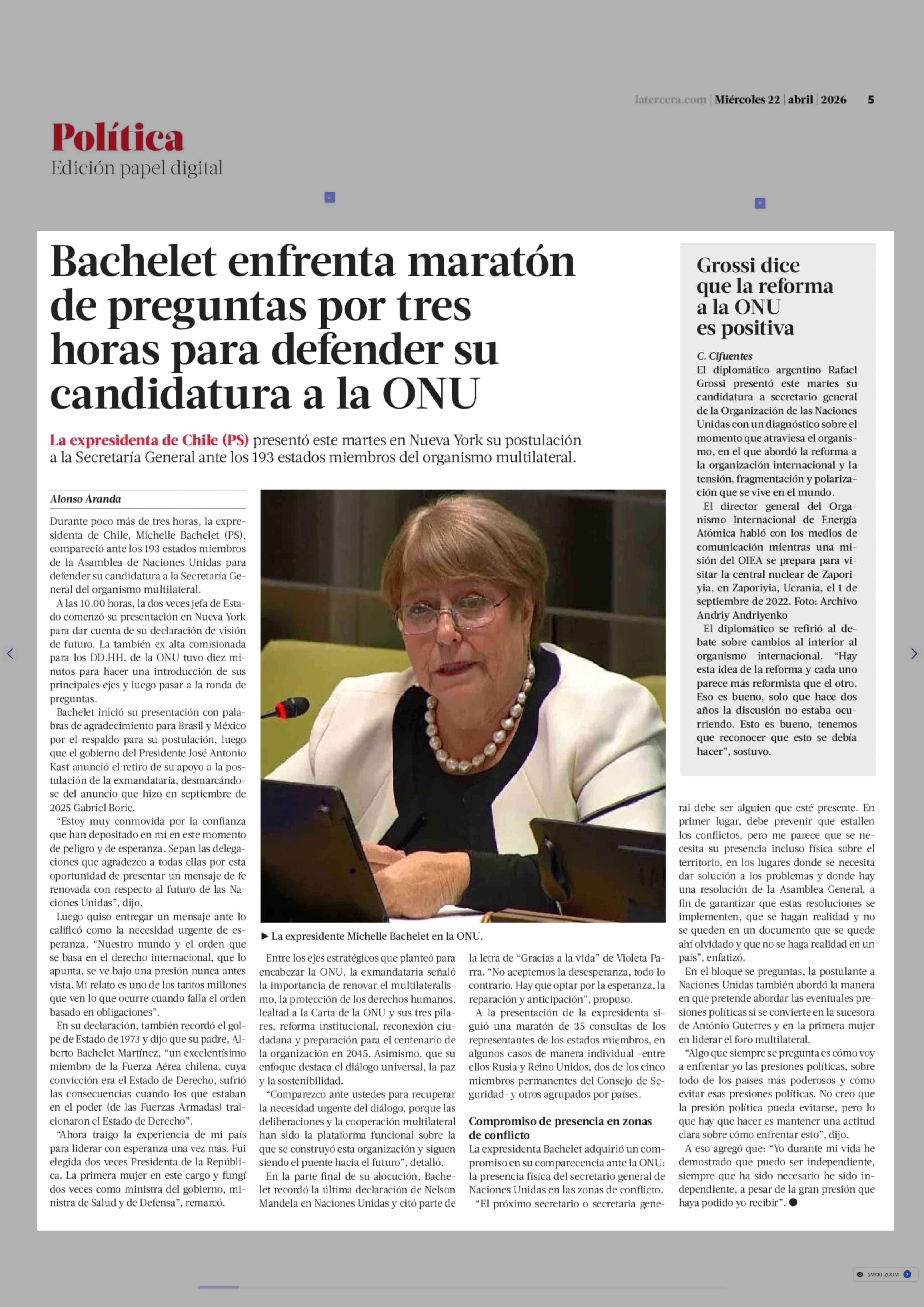 Bachelet enfrenta maratón de preguntas por tres horas para defender su candidatura a la ONU 22-04-2026 La Tercera |