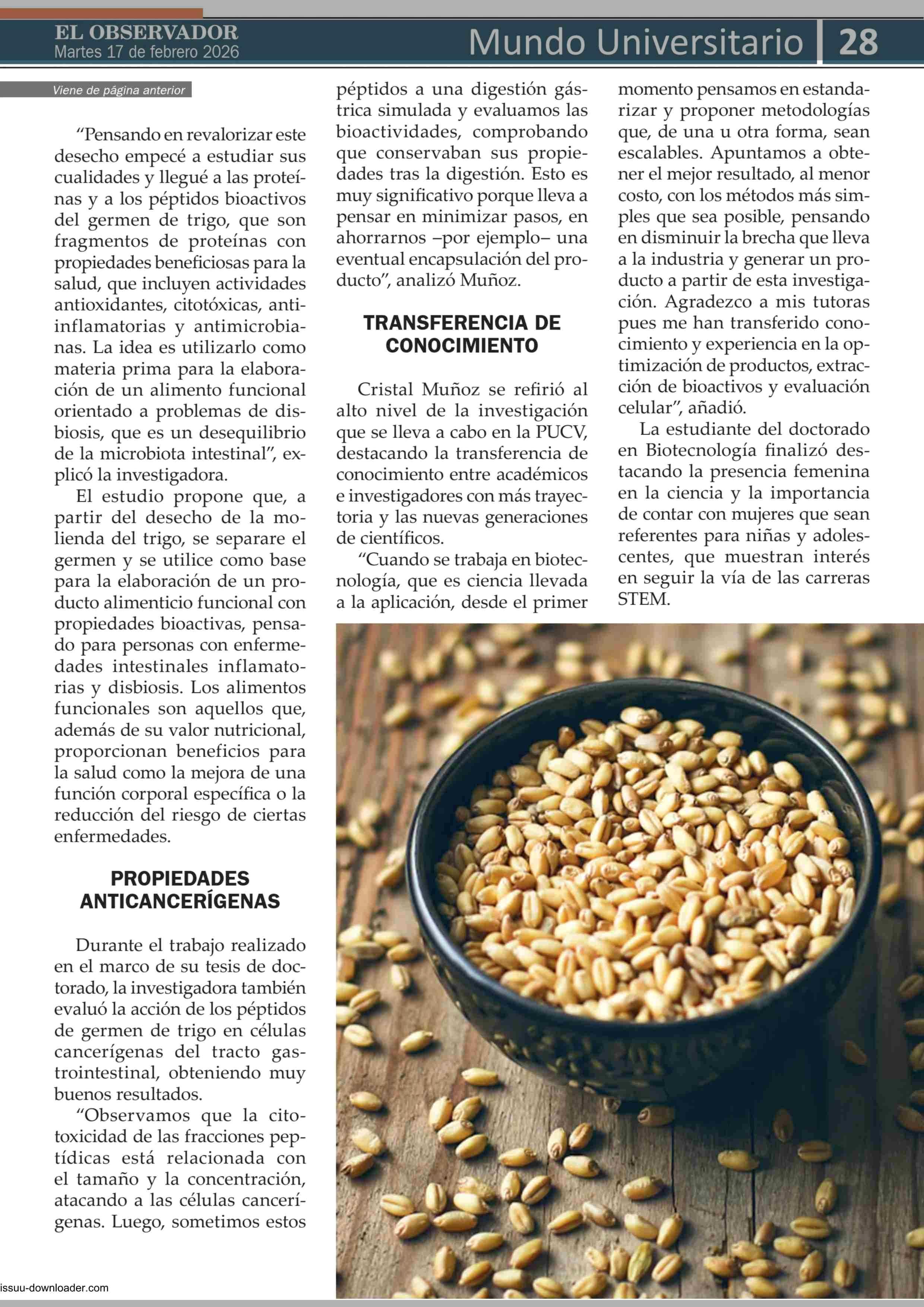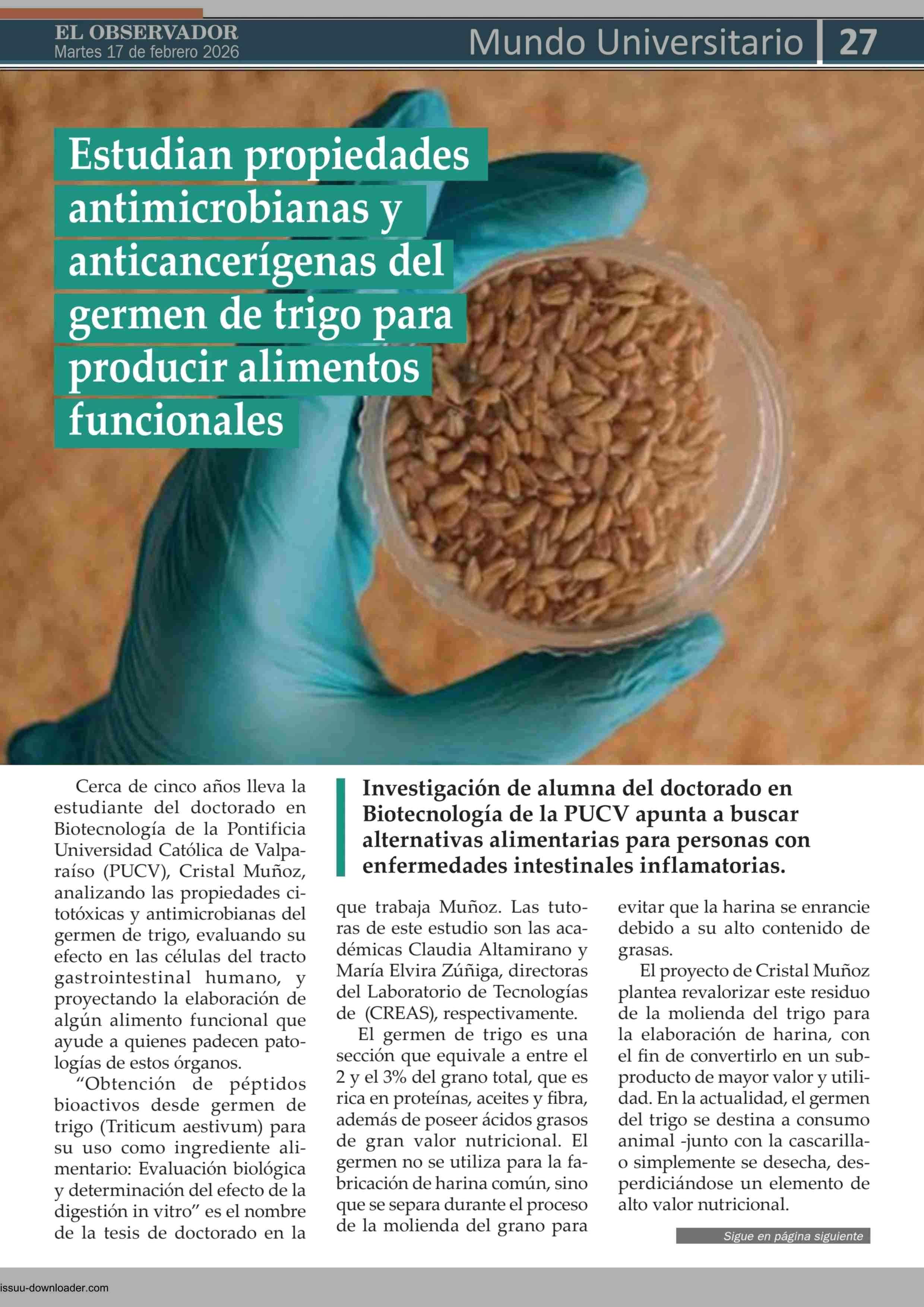Estudian propiedades antimicrobianas y anticancerígenas del germen de trigo para producir alimentos funcionales 17-02-2026 El Observador Vespertino |