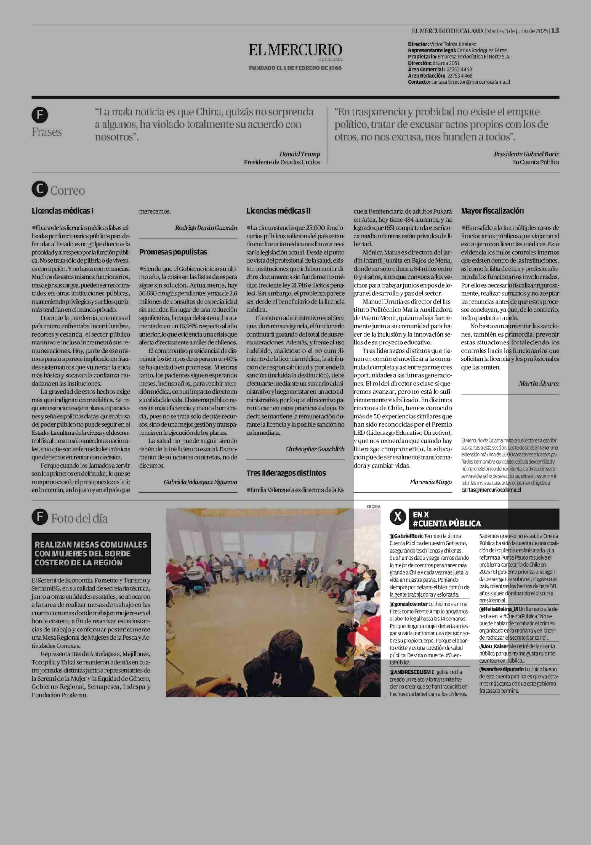 CARTAS: Licencias médicas II 03-06-2025 El Mercurio de Calama |