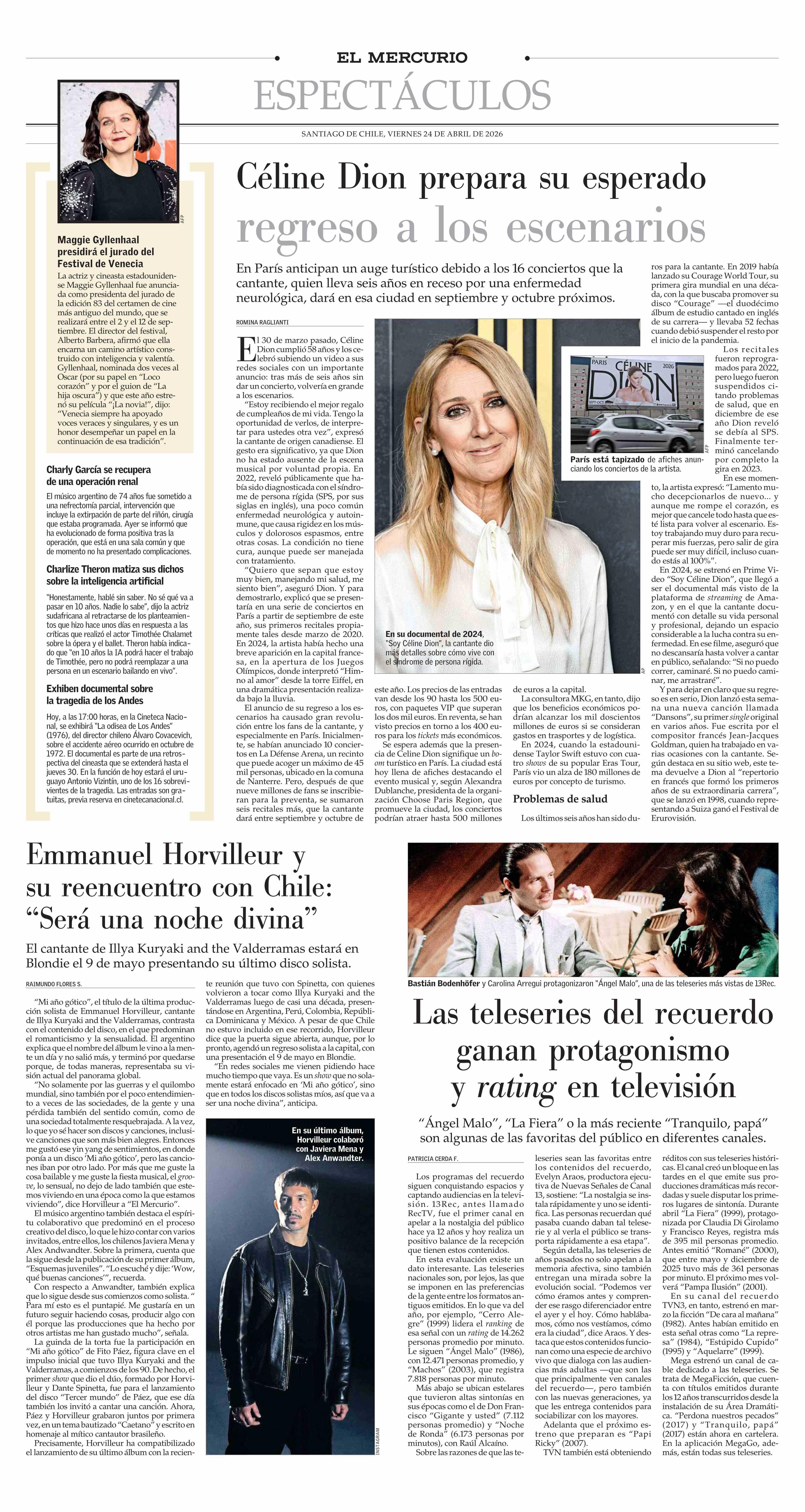 Céline Dion prepara su esperado reoreso a los escenarios 24-04-2026 El Mercurio |