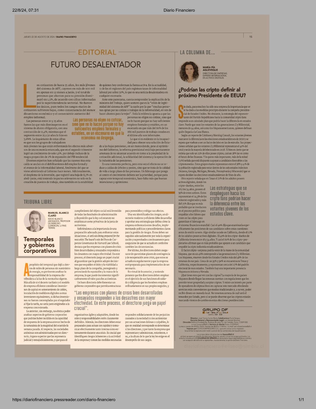 Temporales y gobiernos corporativos 22-08-2024 Diario Financiero |
