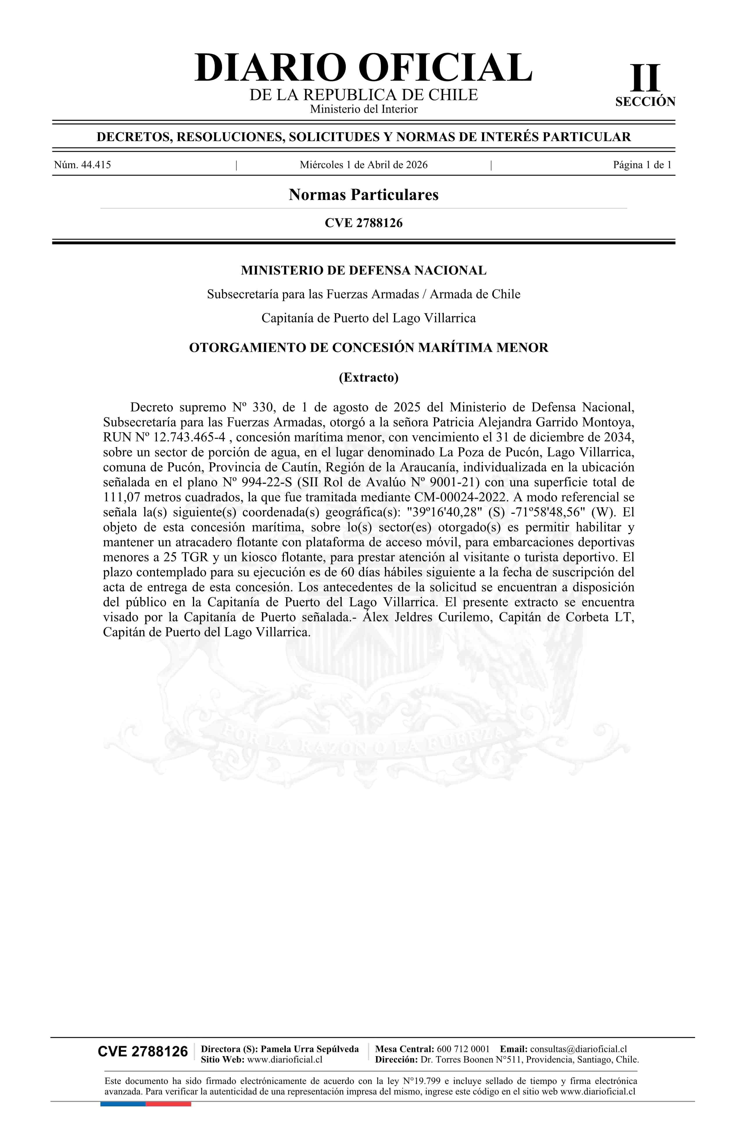 Extracto de decreto número 330, de 2025.- Otorgamiento de concesión marítima menor 01-04-2026 Diario Oficial Edición Electrónica |
