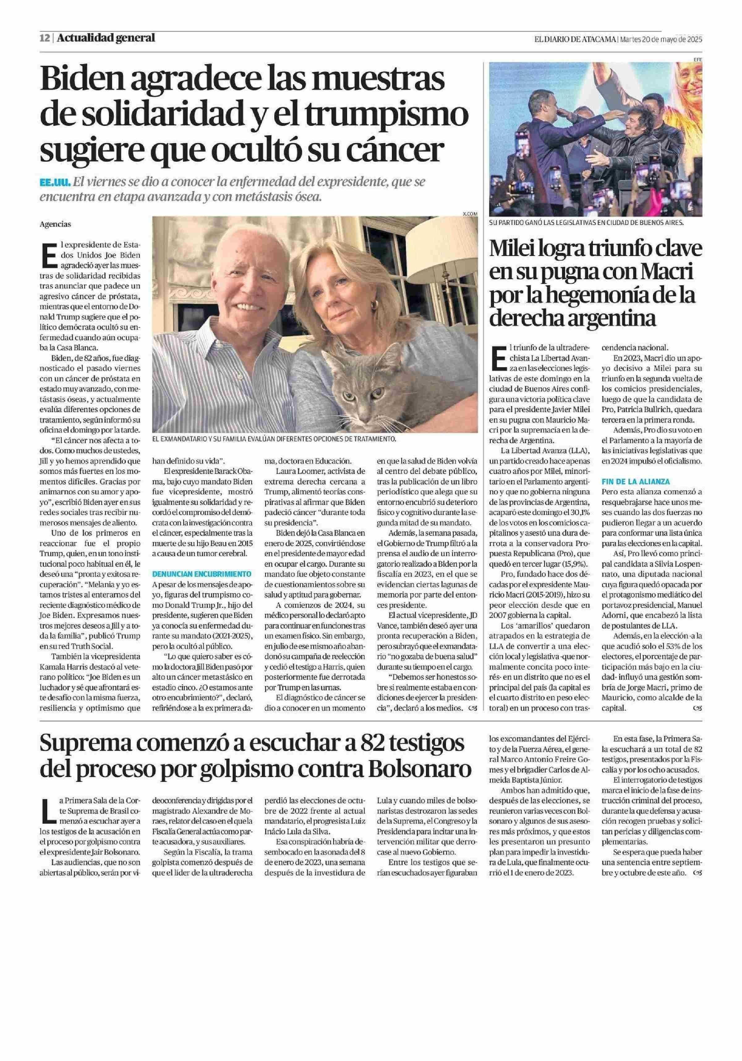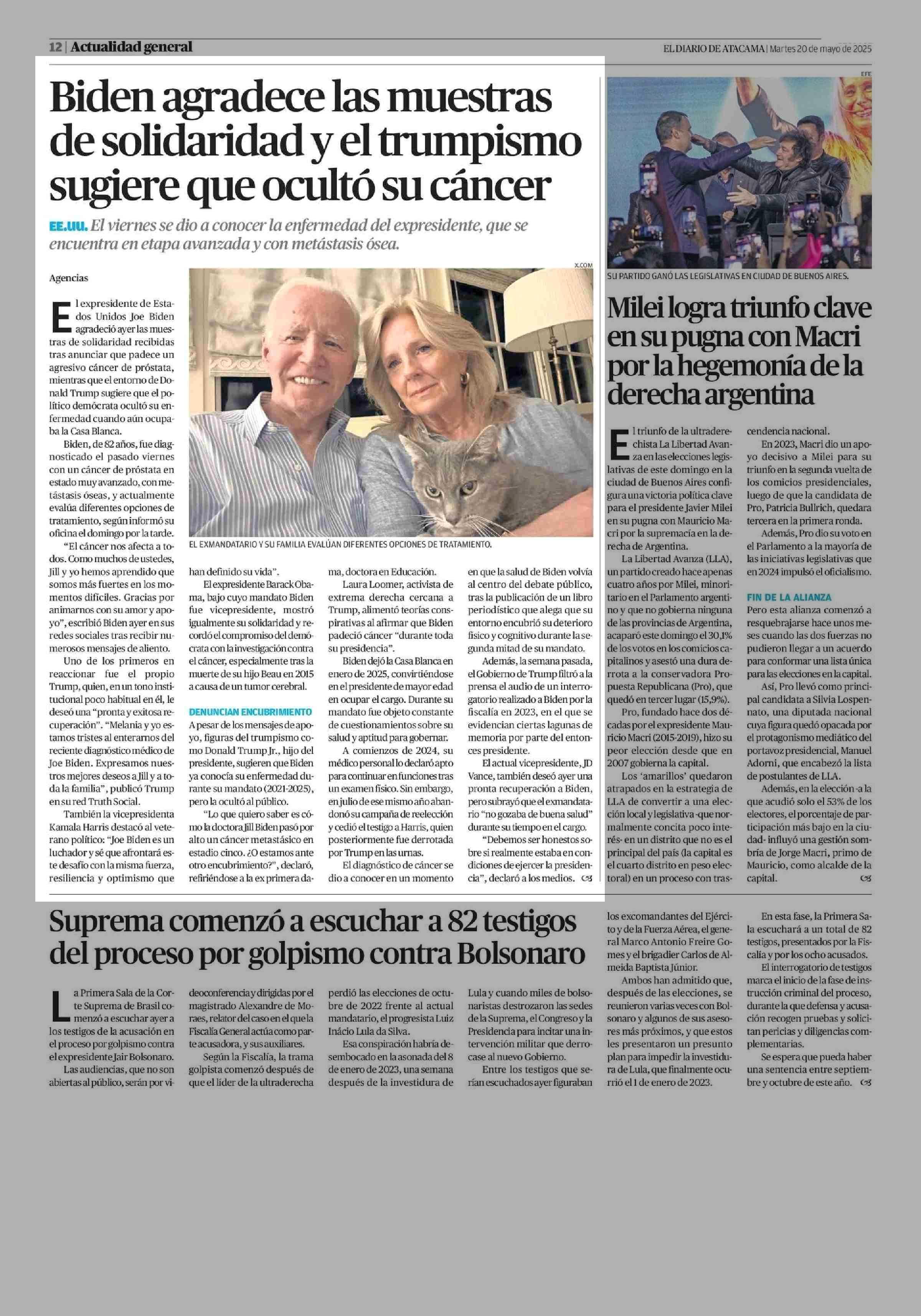 Biden agradece las muestras de solidaridad y el trumpismo sugiere que ocultó su cáncer 20-05-2025 El Diario de Atacama |