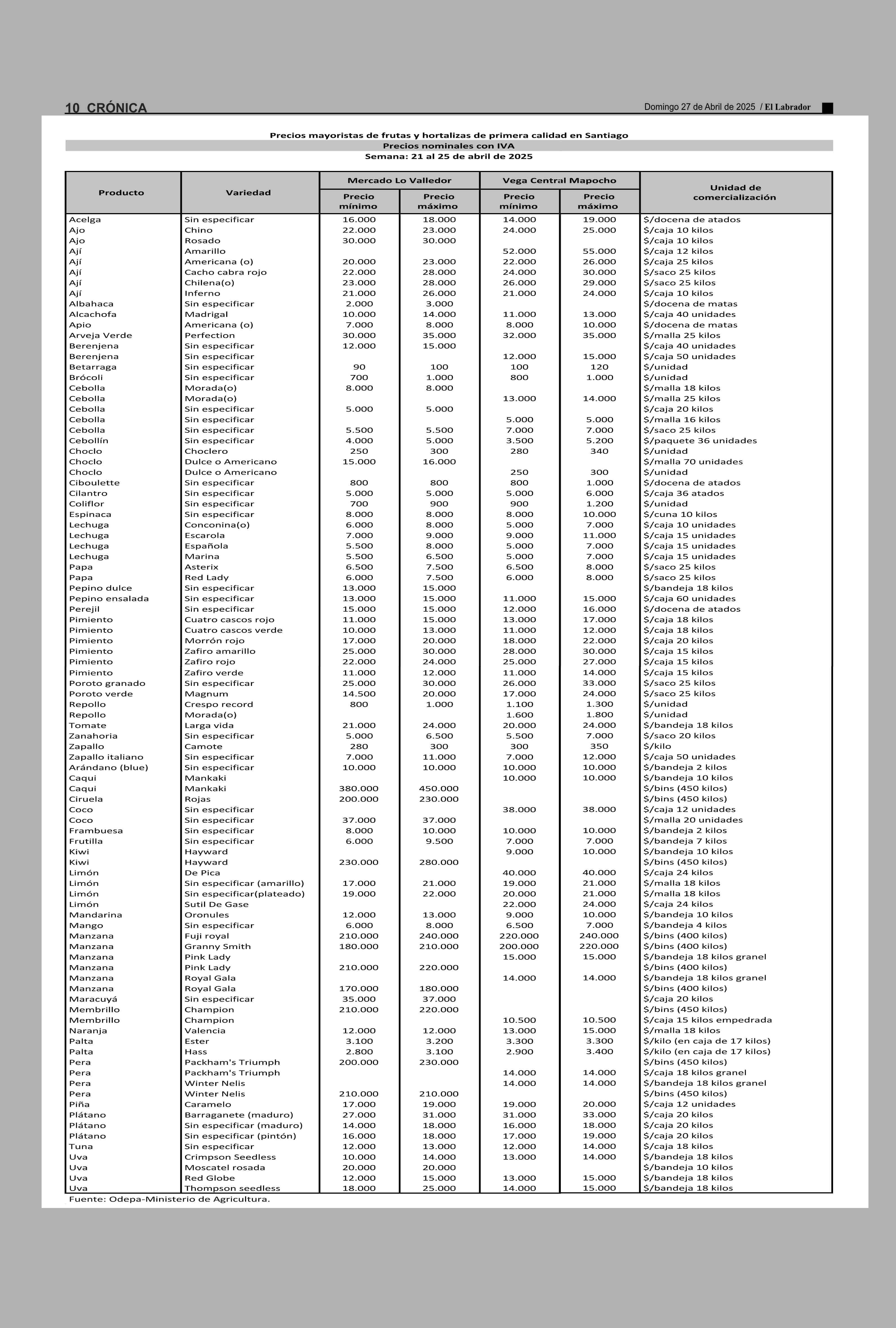 Precios mayoristas de frutas y hortalizas de primera calidad en Santiago Precios nominales con IVA Semana: 21 al 25 de abril de 2025 27-04-2025 El Labrador |