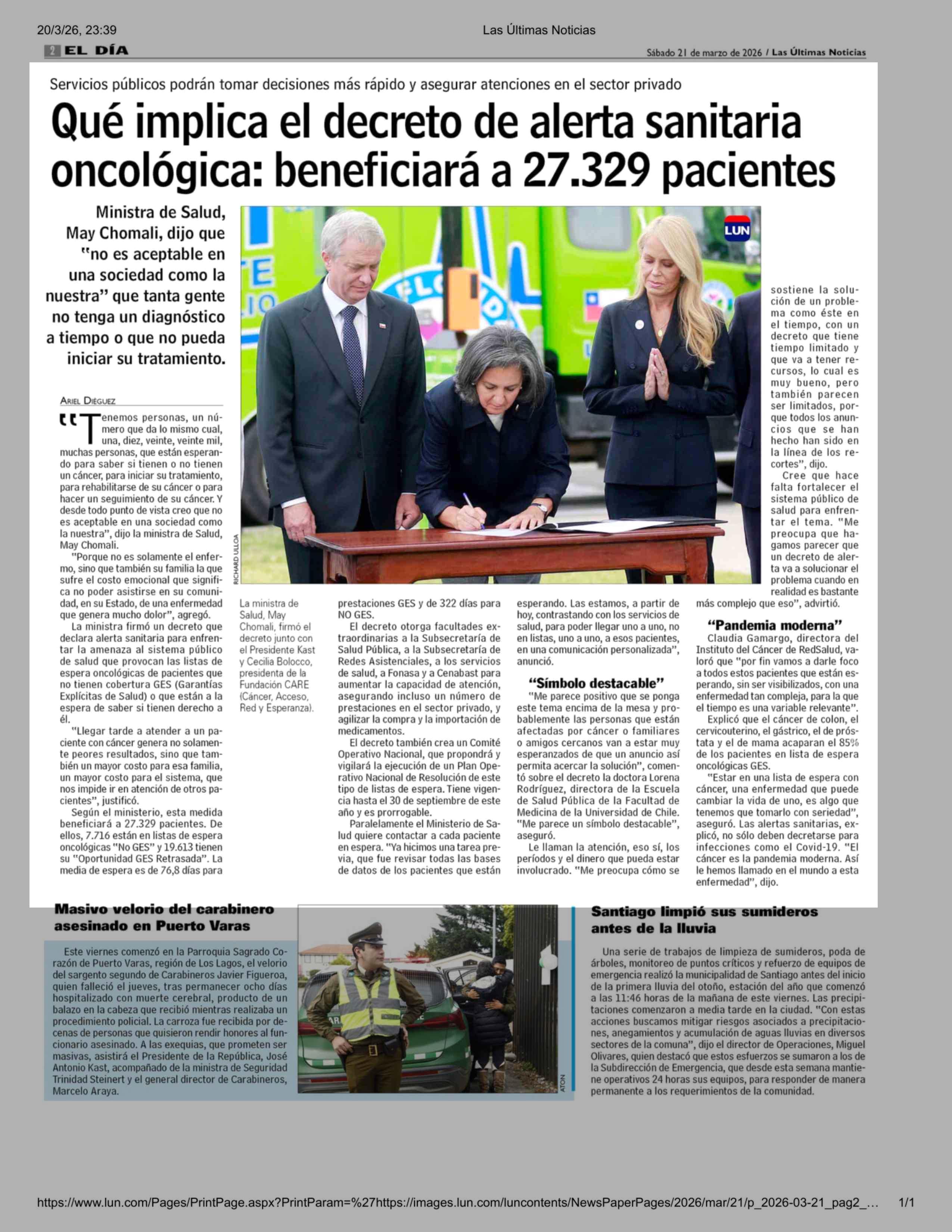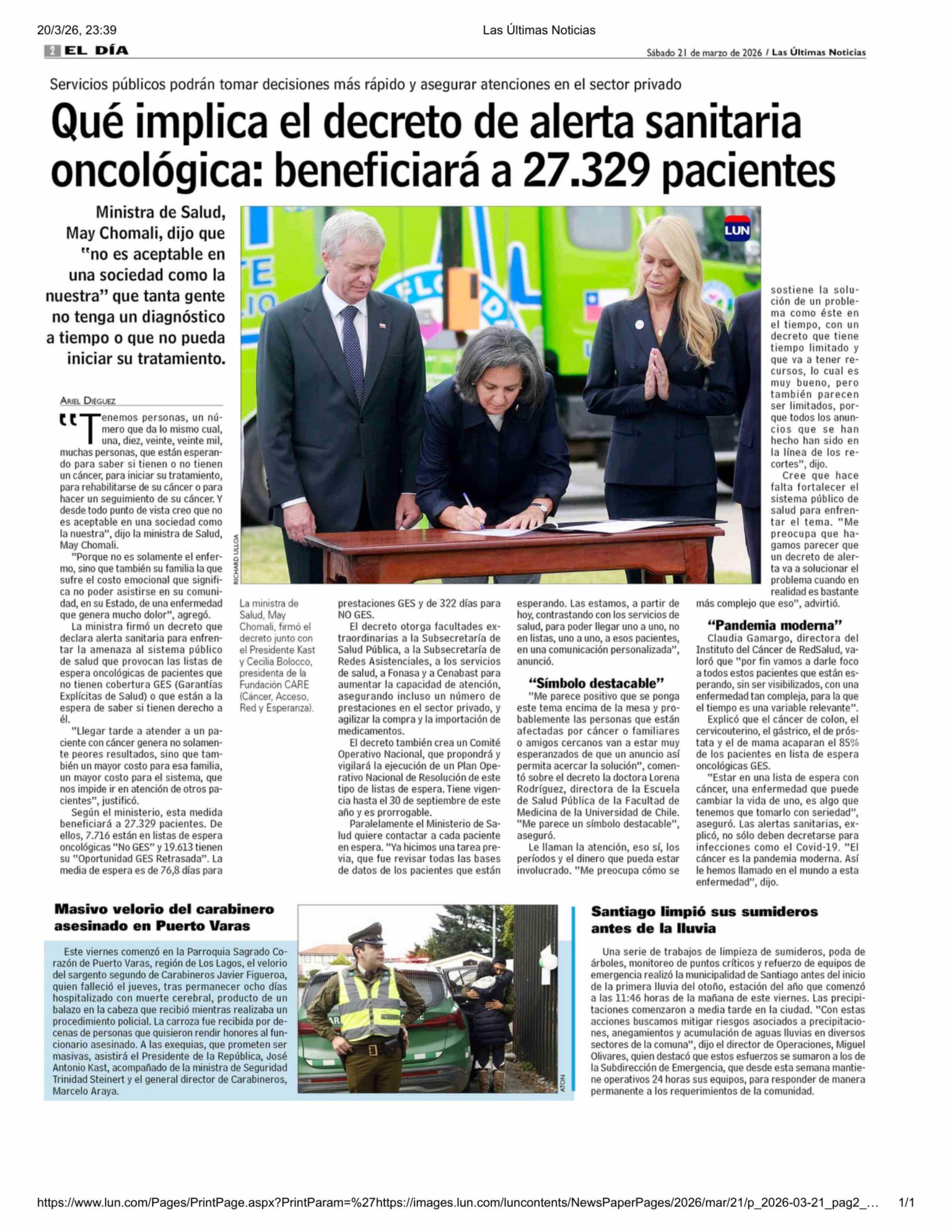 Qué implica el decreto de alerta sanitaria oncológica: beneficiará a 27.329 pacientes 21-03-2026 Las Últimas Noticias |