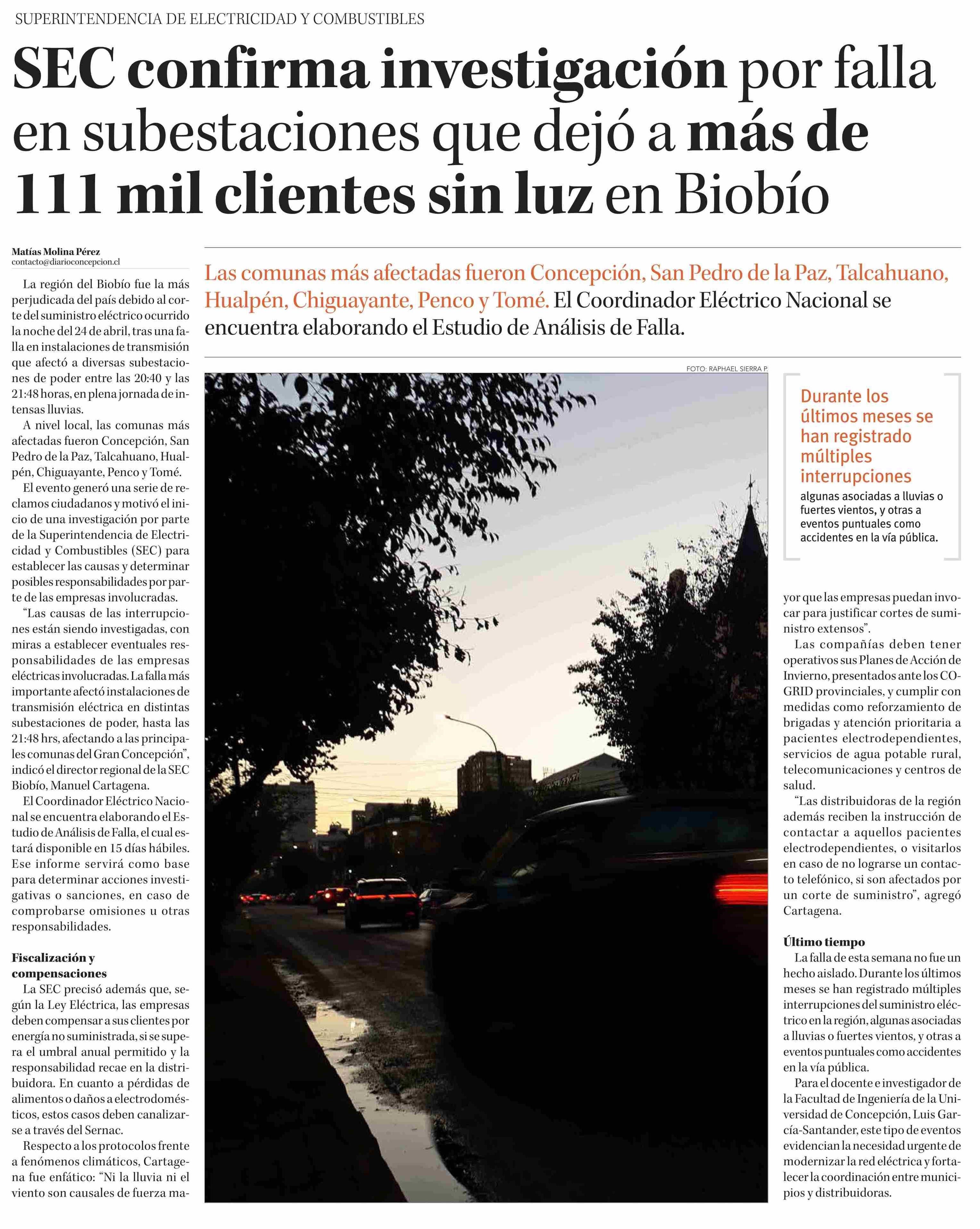 SEC confirma investigación por falla en subestaciones que dejó a más de 111 mil clientes sin luz en Biobío 26-04-2025 Diario Concepción |