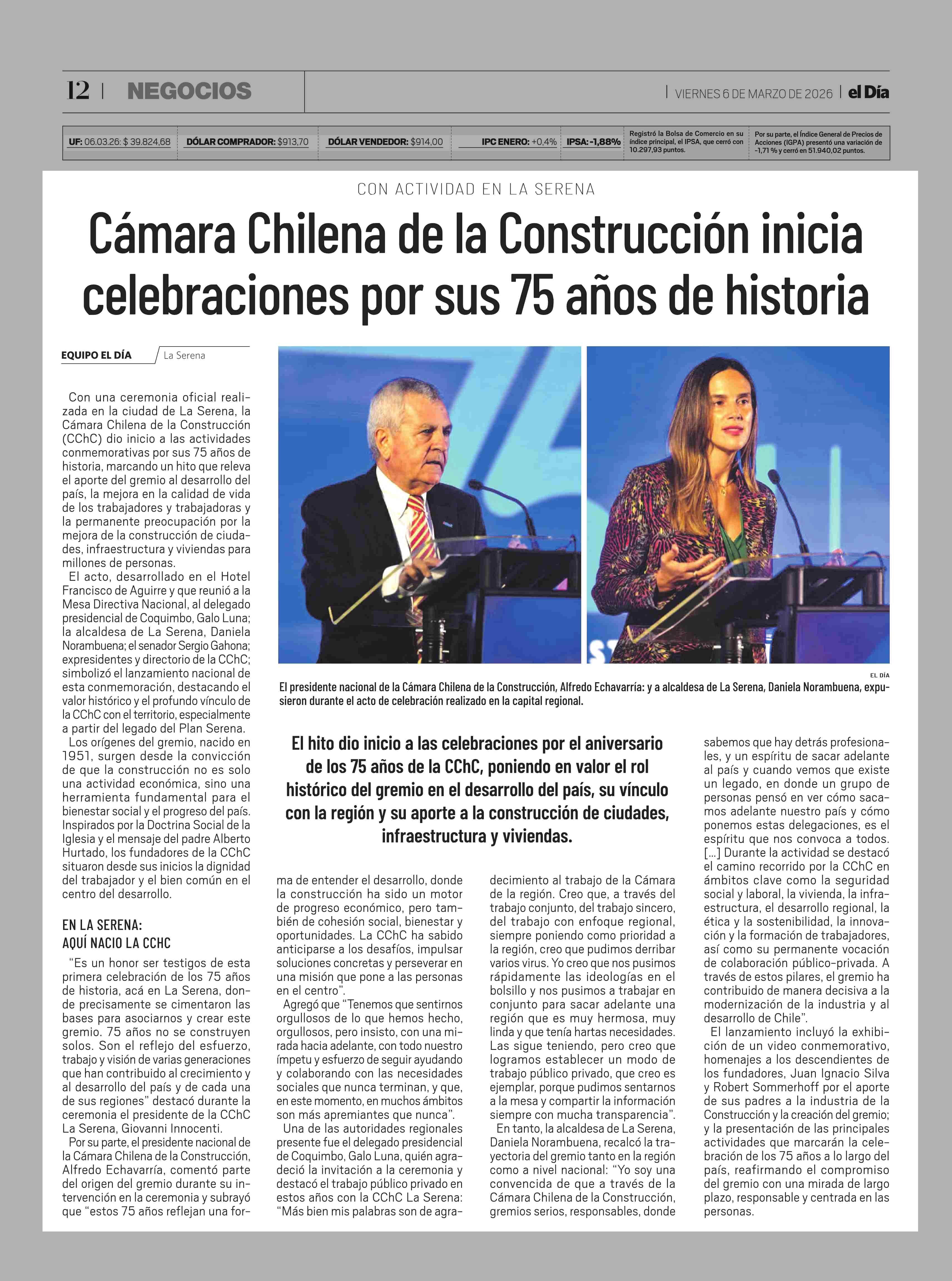 Cámara Chilena de la Construcción inicia celebraciones por sus 75 años de historia 06-03-2026 El Día |