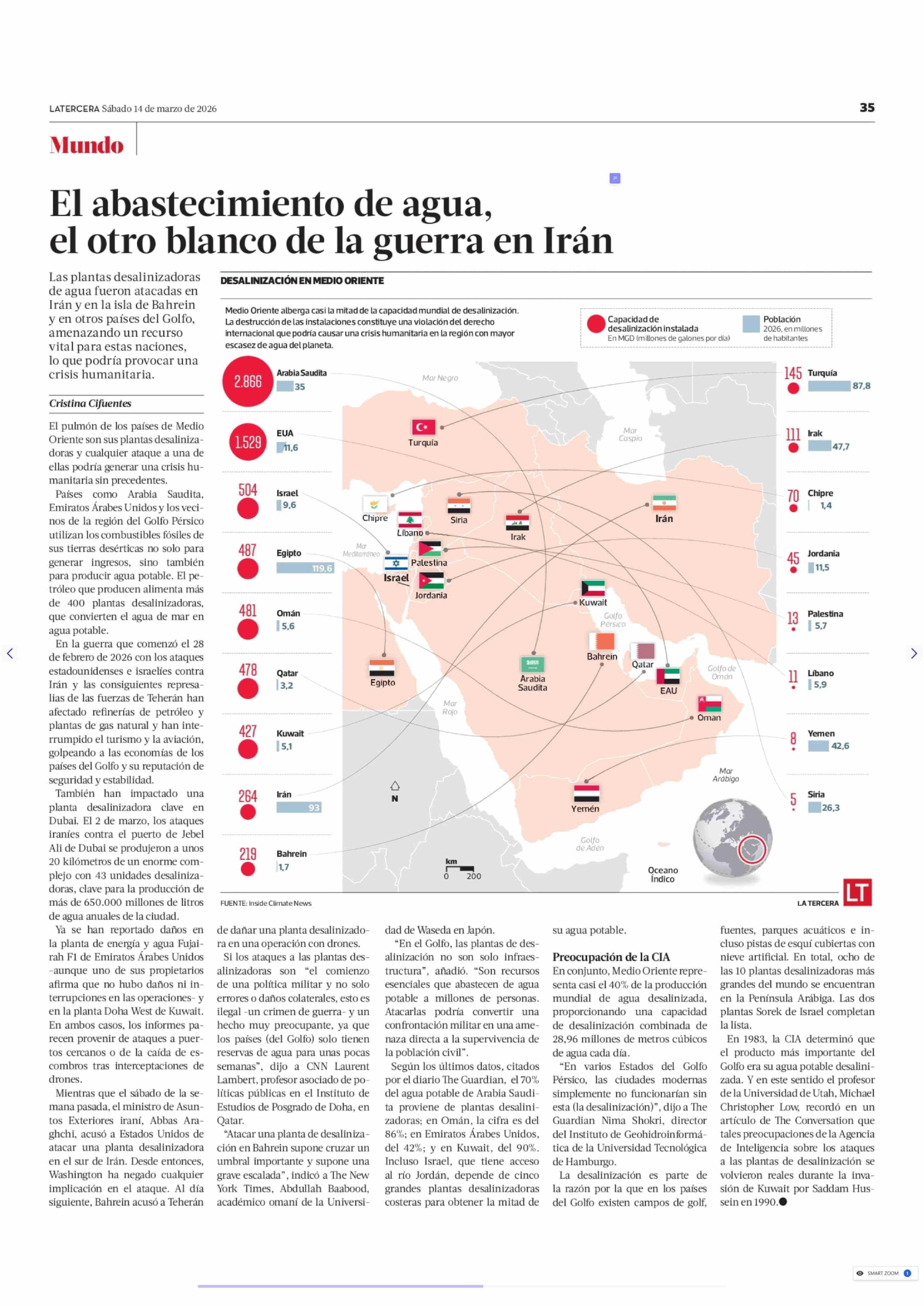 El abastecimiento de agua, el otro blanco de la guerra en Irán 14-03-2026 La Tercera |