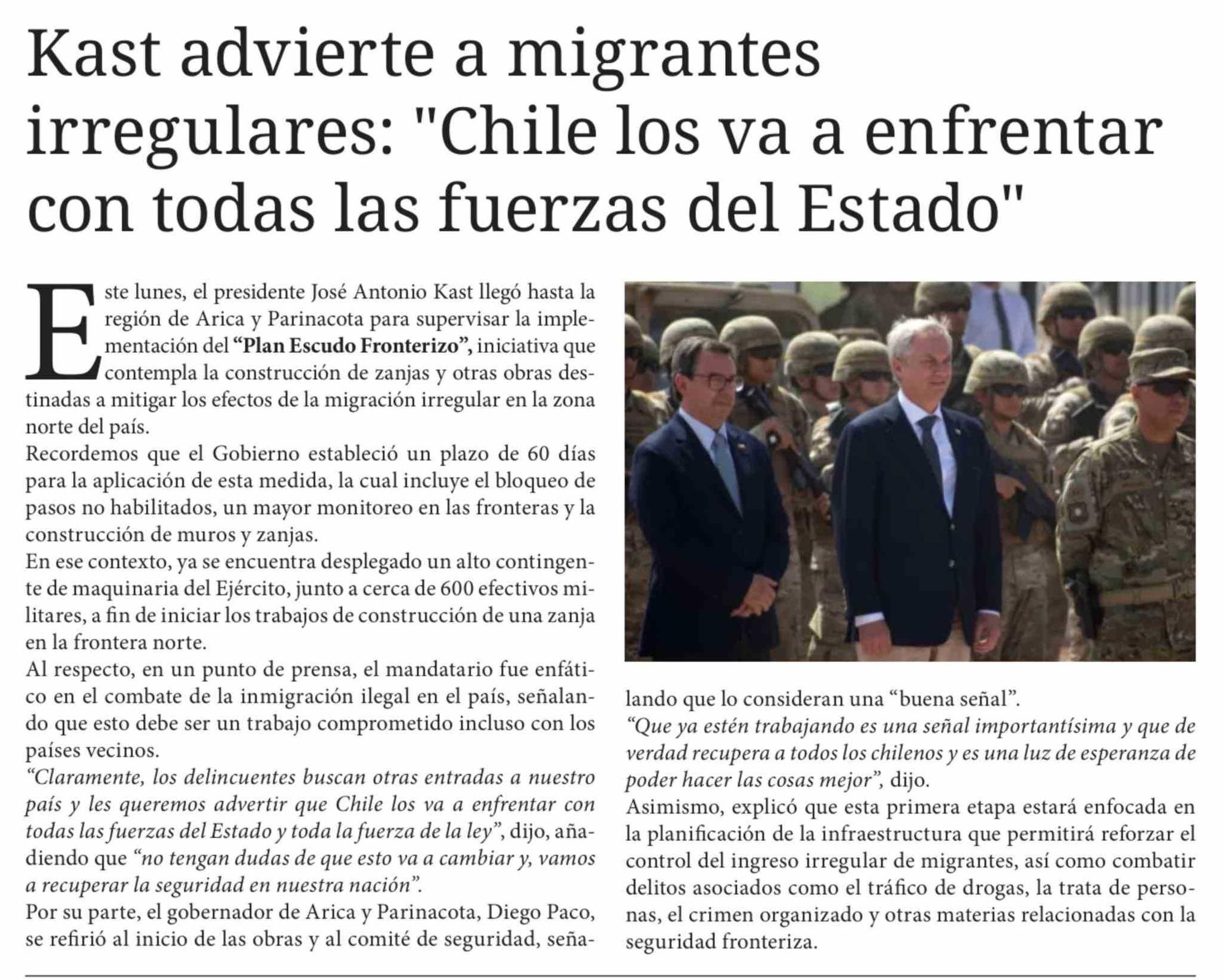 Título: Kast advierte a migrantes irregulares: "Chile los va a enfrentar con todas las fuerzas del Estado"