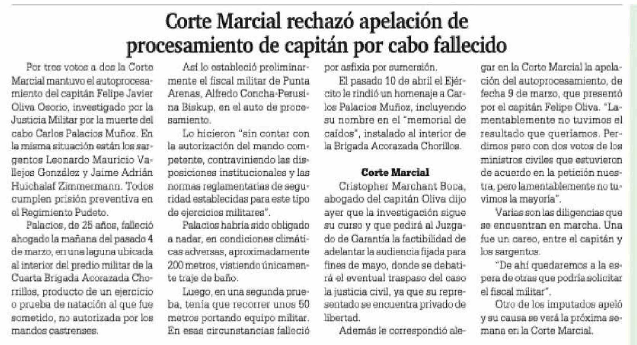 Corte Marcial rechazó apelación de procesamiento de capitán por cabo fallecido 16-04-2026 La Prensa Austral |