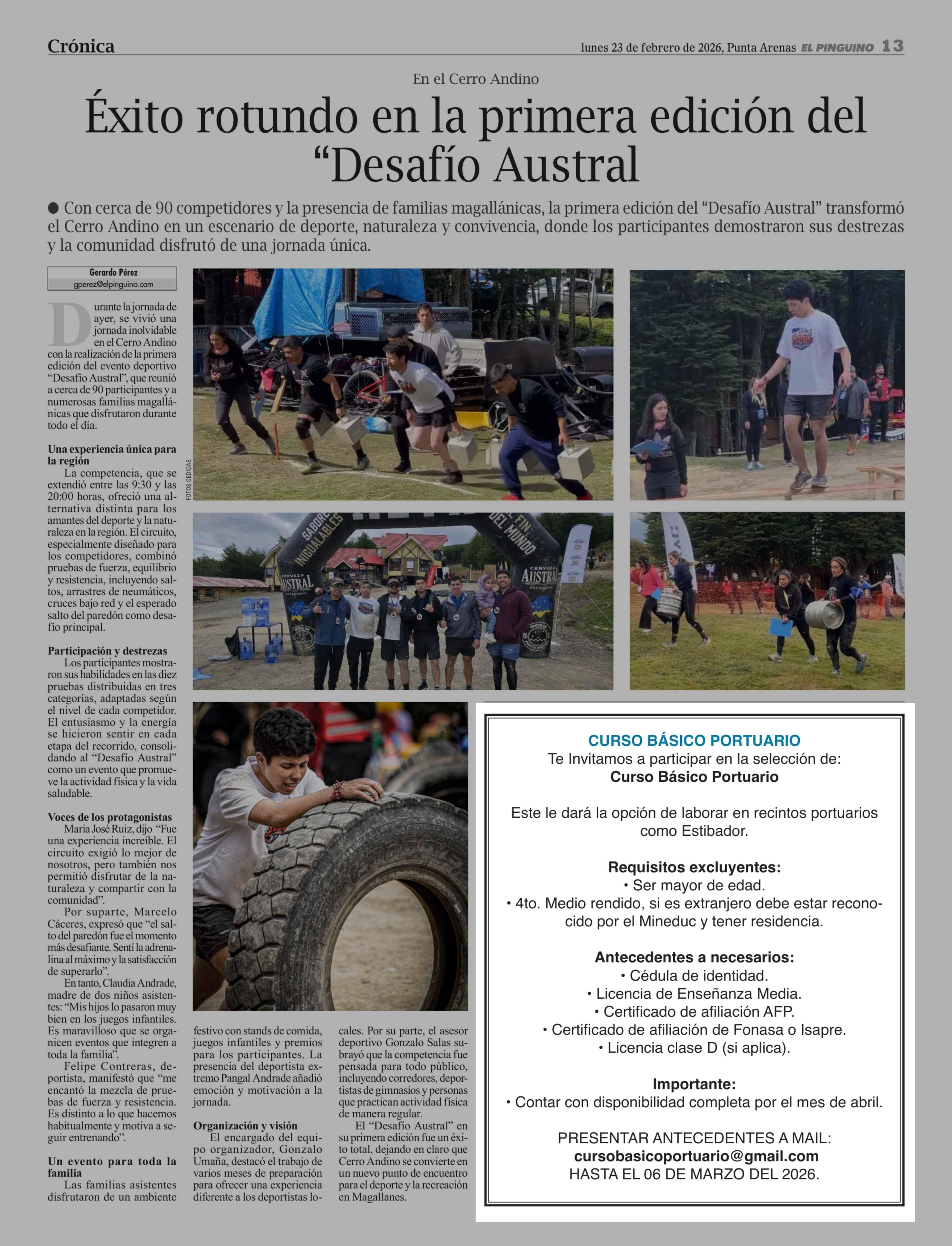 Aviso Publicitario: CURSO BÁSICO PORTUARIO Te Invitamos a participar en la selección de: Curso Básico Portuario 23-02-2026 El Pingüino |