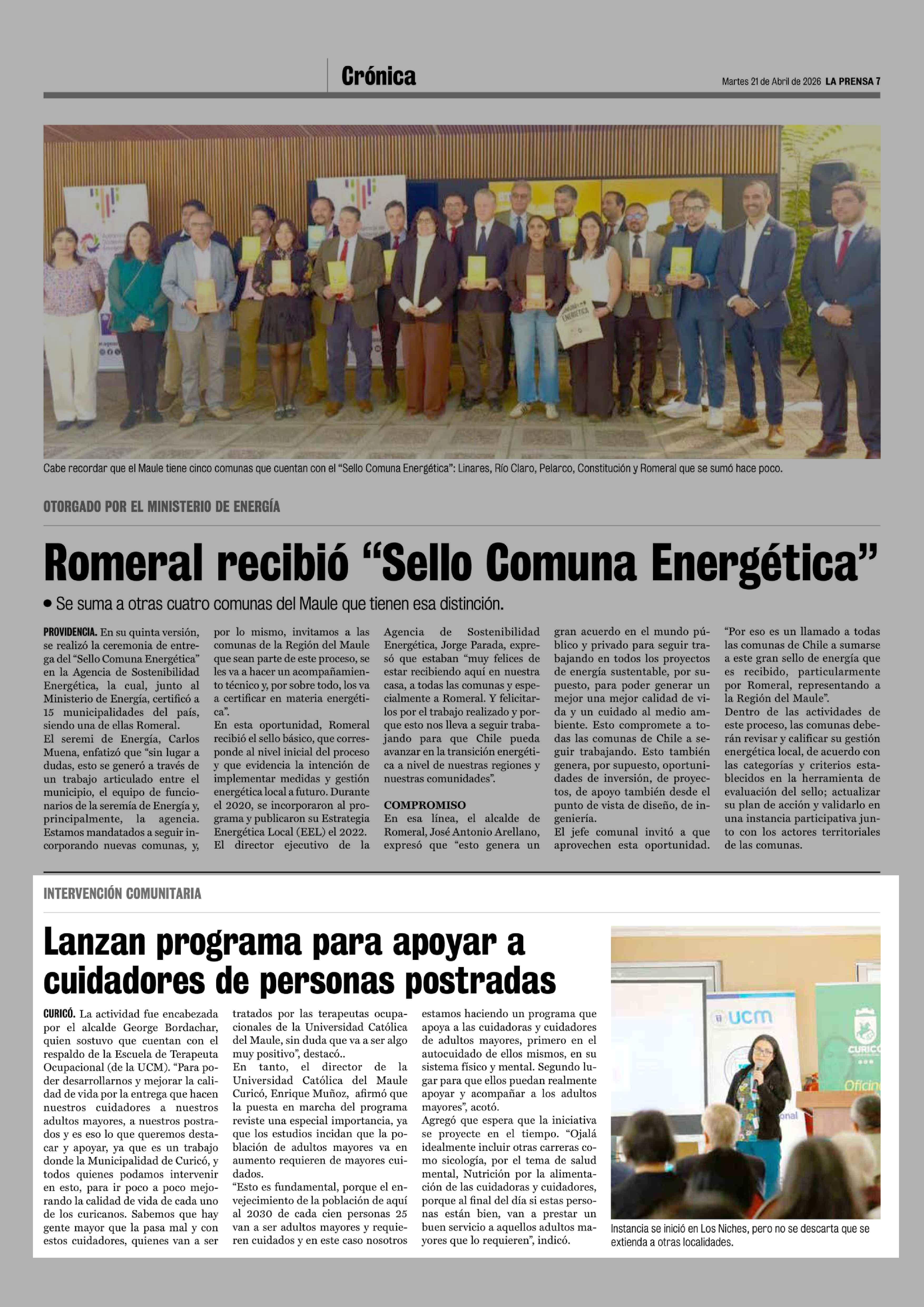 Lanzan programa para apoyar a cuidadores de personas postradas 21-04-2026 La Prensa de Curicó |