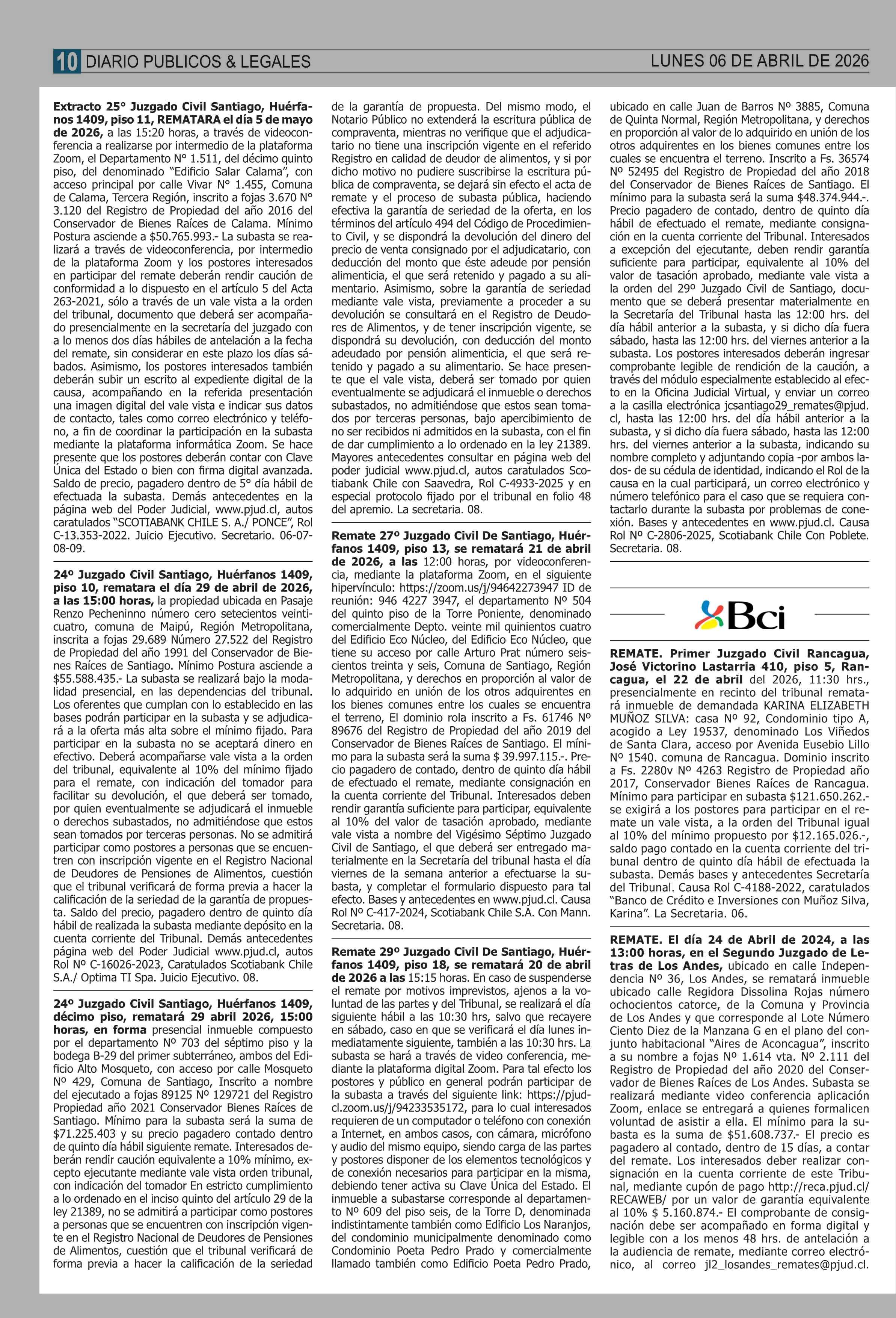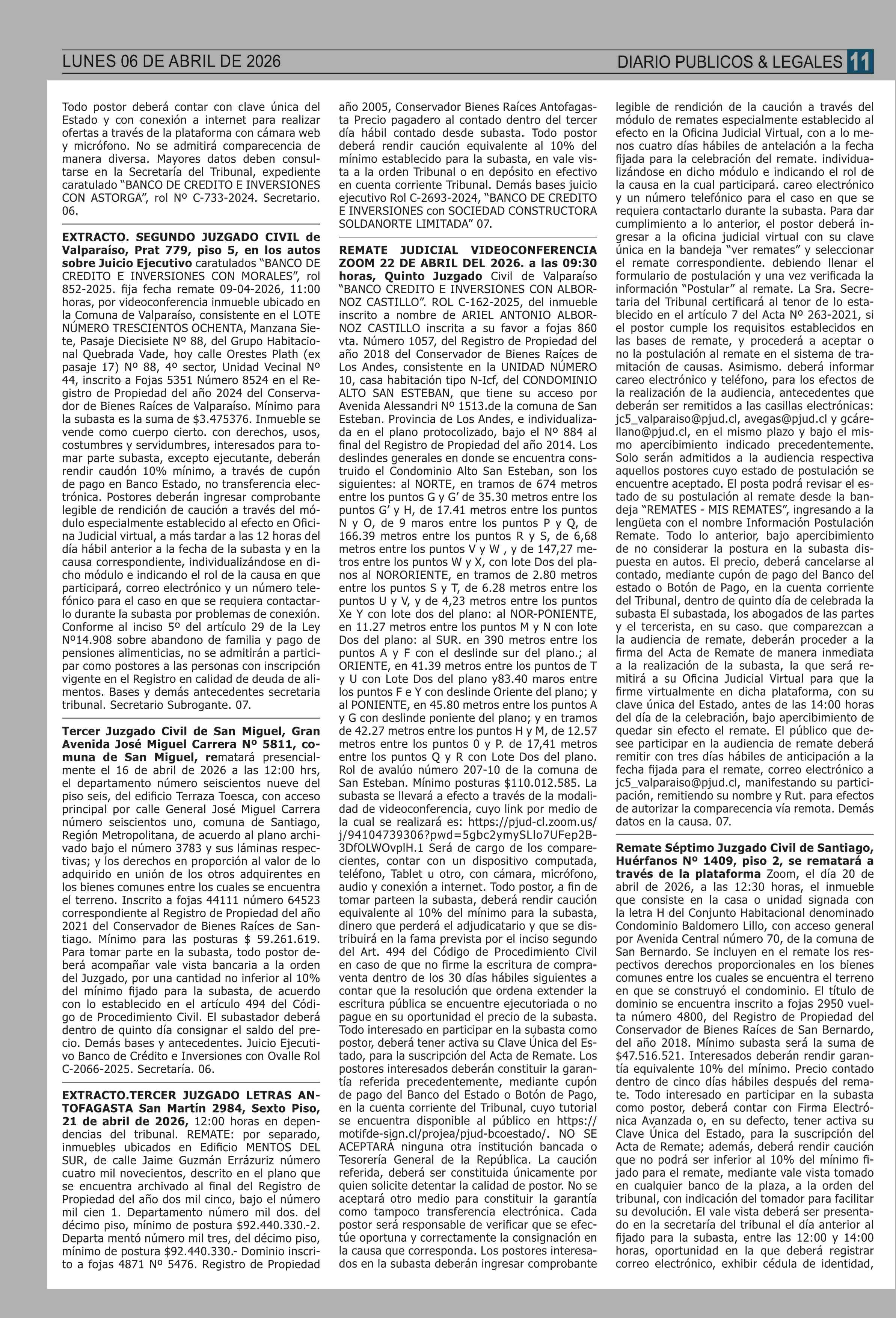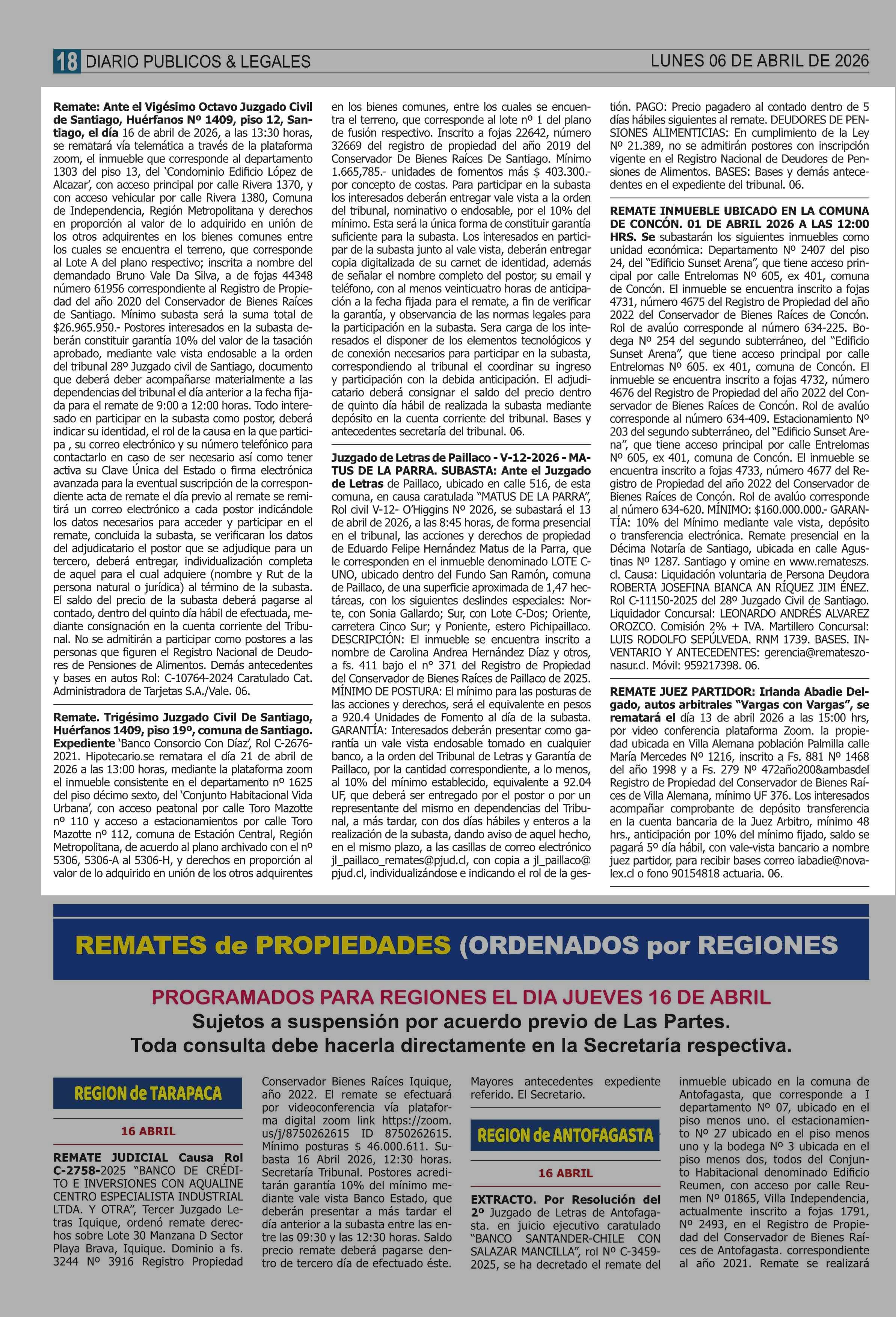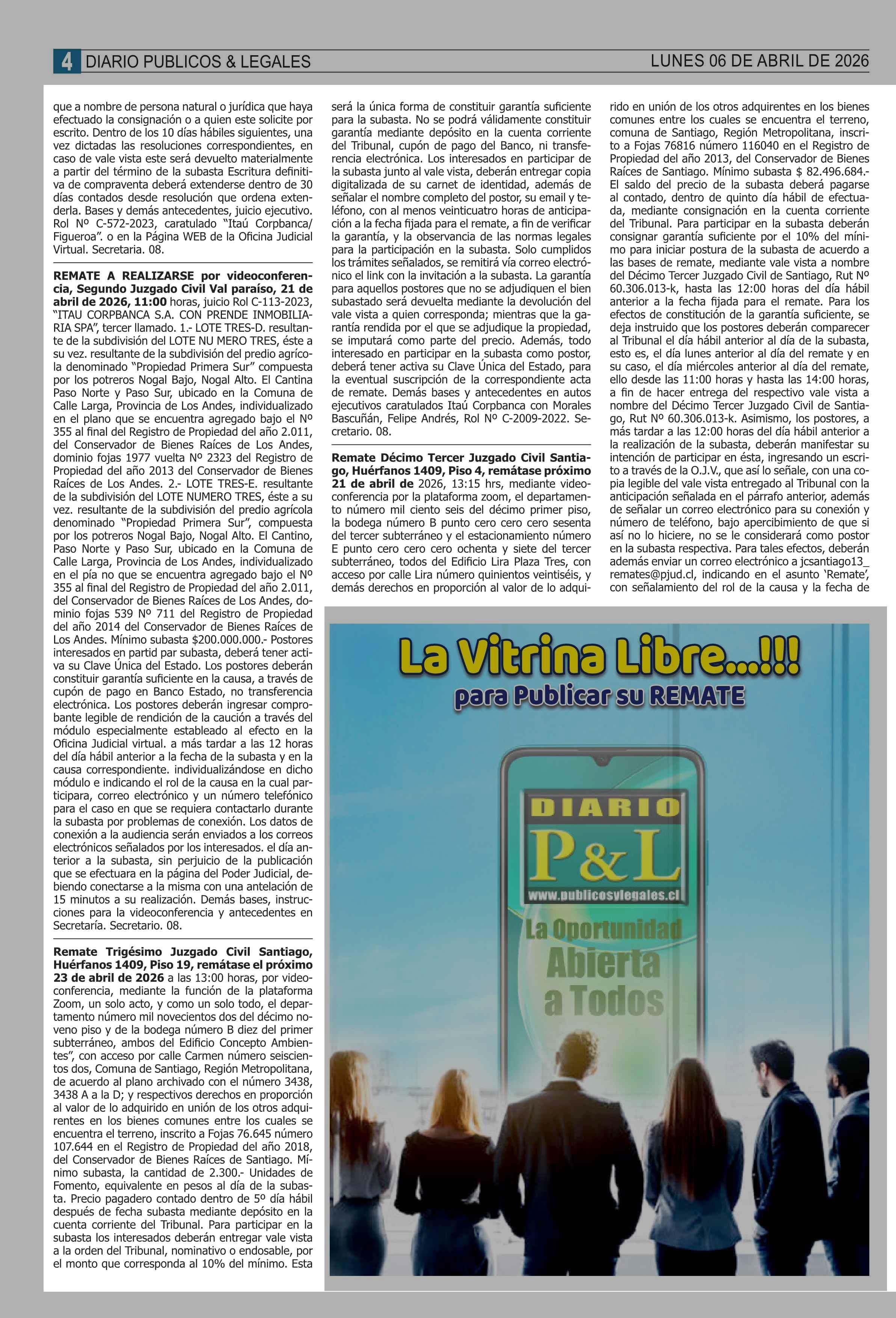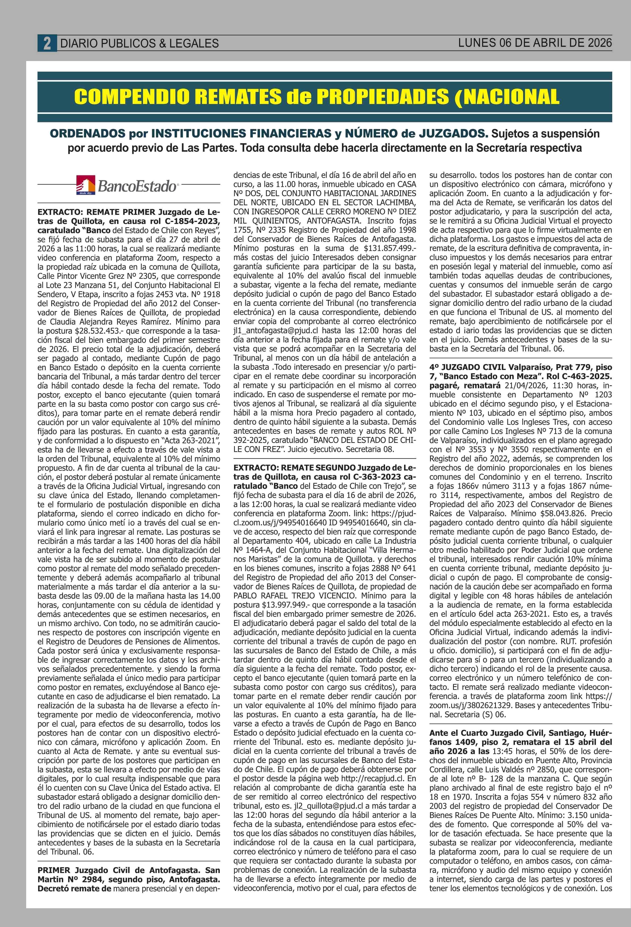 REMATES: COMPENDIO REMATES de PROPIEDADES (NACIONAL 06-04-2026 P&L Públicos y Legales |