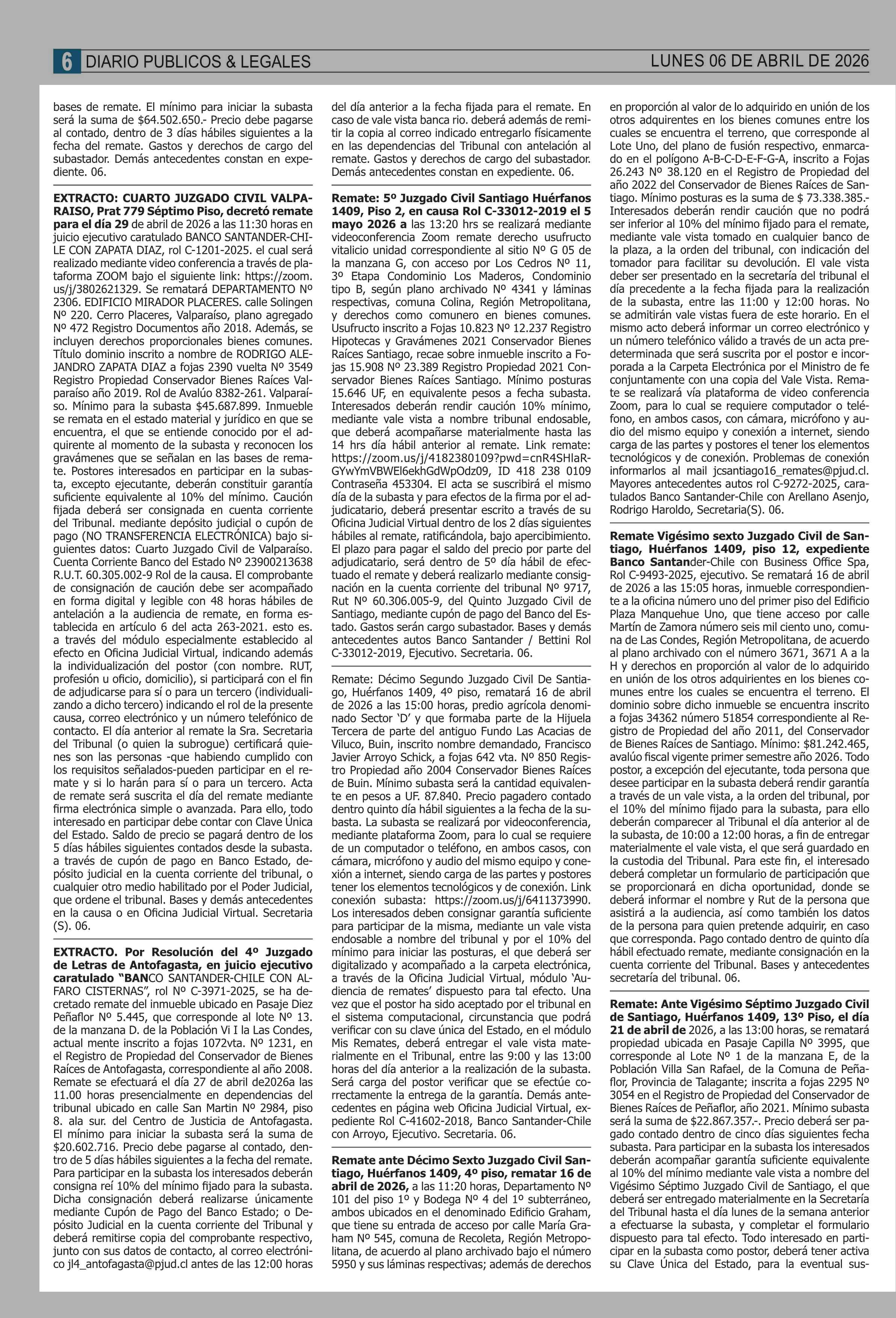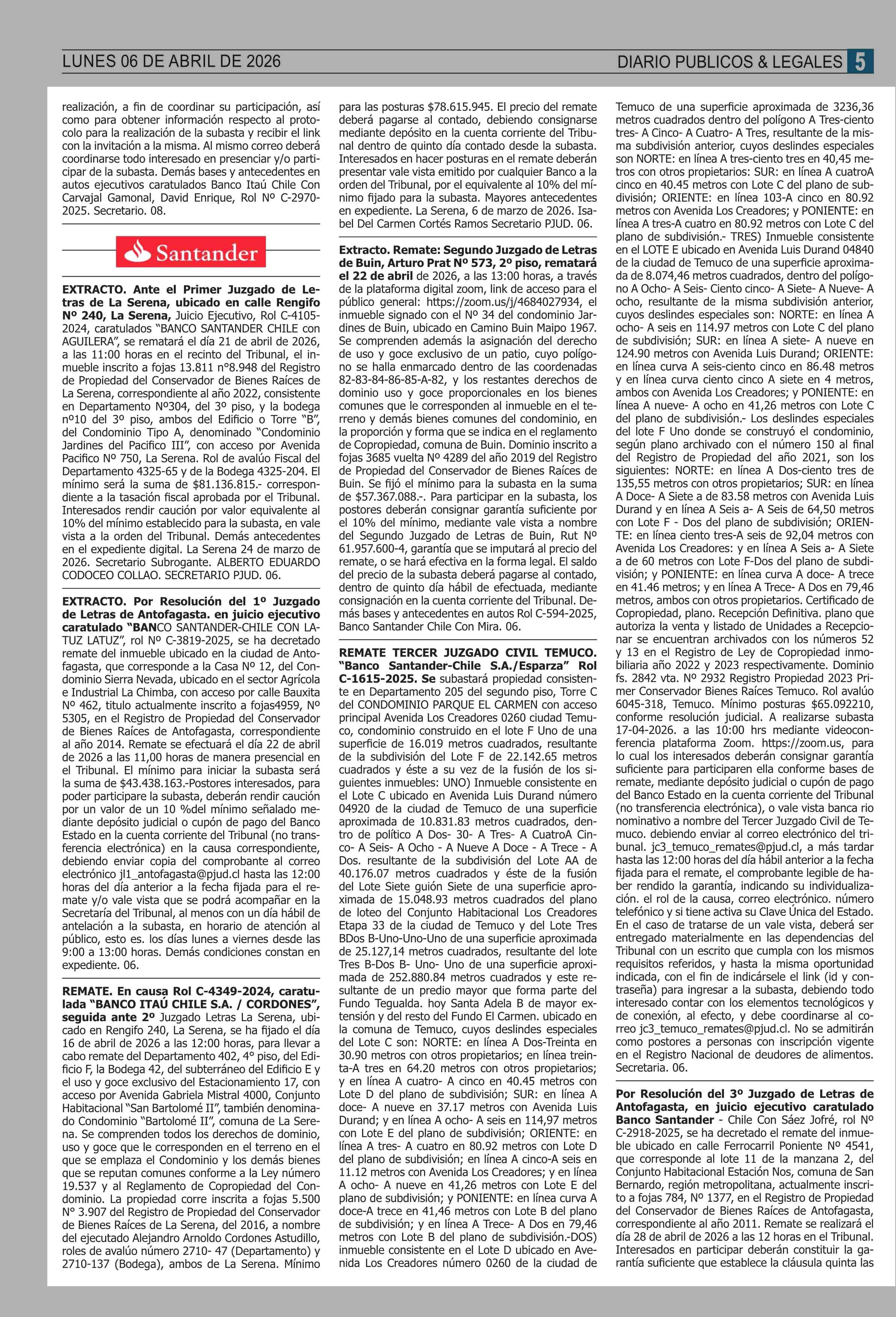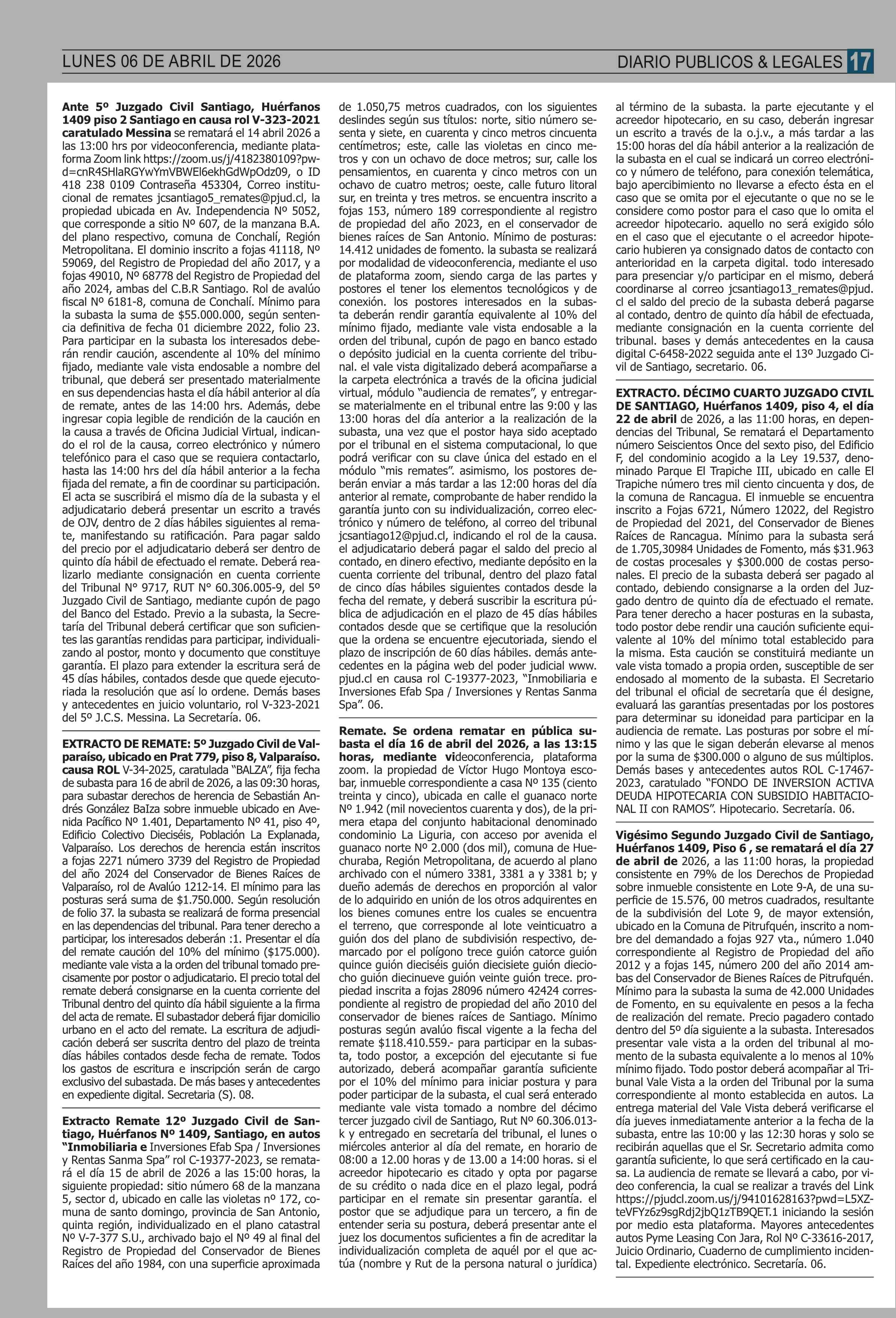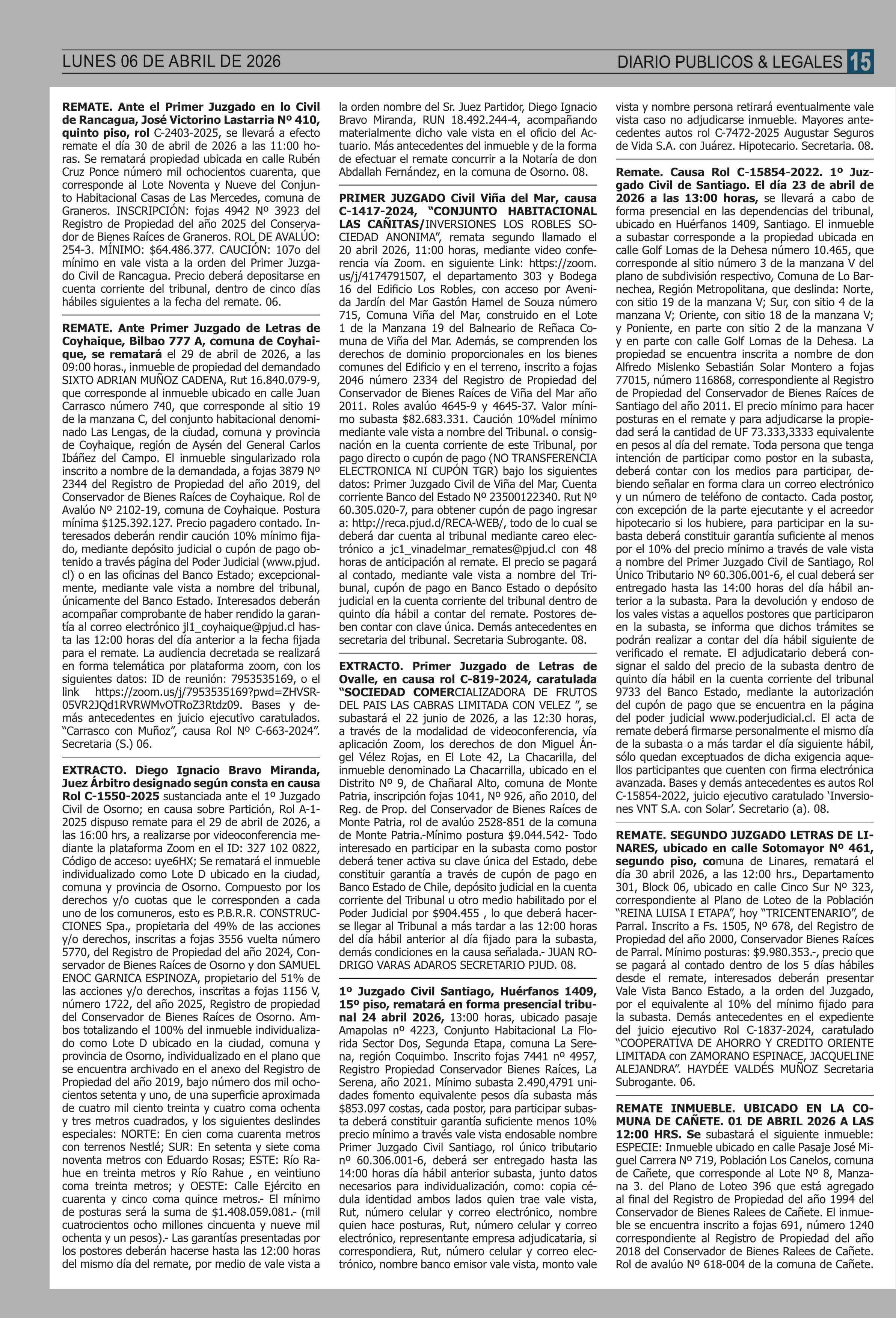 REMATES: COMPENDIO REMATES de PROPIEDADES (NACIONAL 06-04-2026 P&L Públicos y Legales |