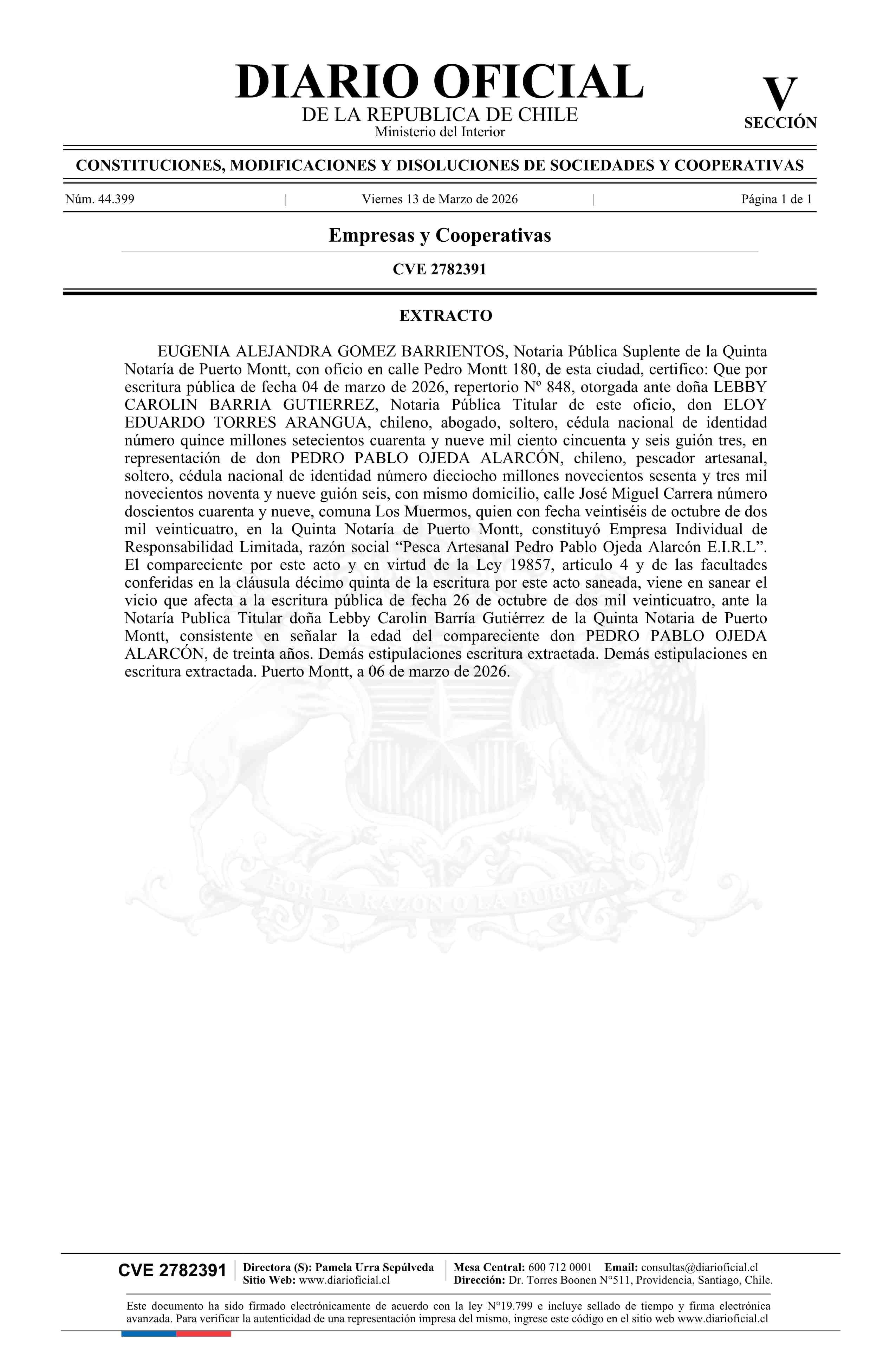 Pesca Artesanal Pedro Pablo Ojeda Alarcón E.I.R.L. 77.985.305-5* 13-03-2026 Diario Oficial Edición Electrónica |