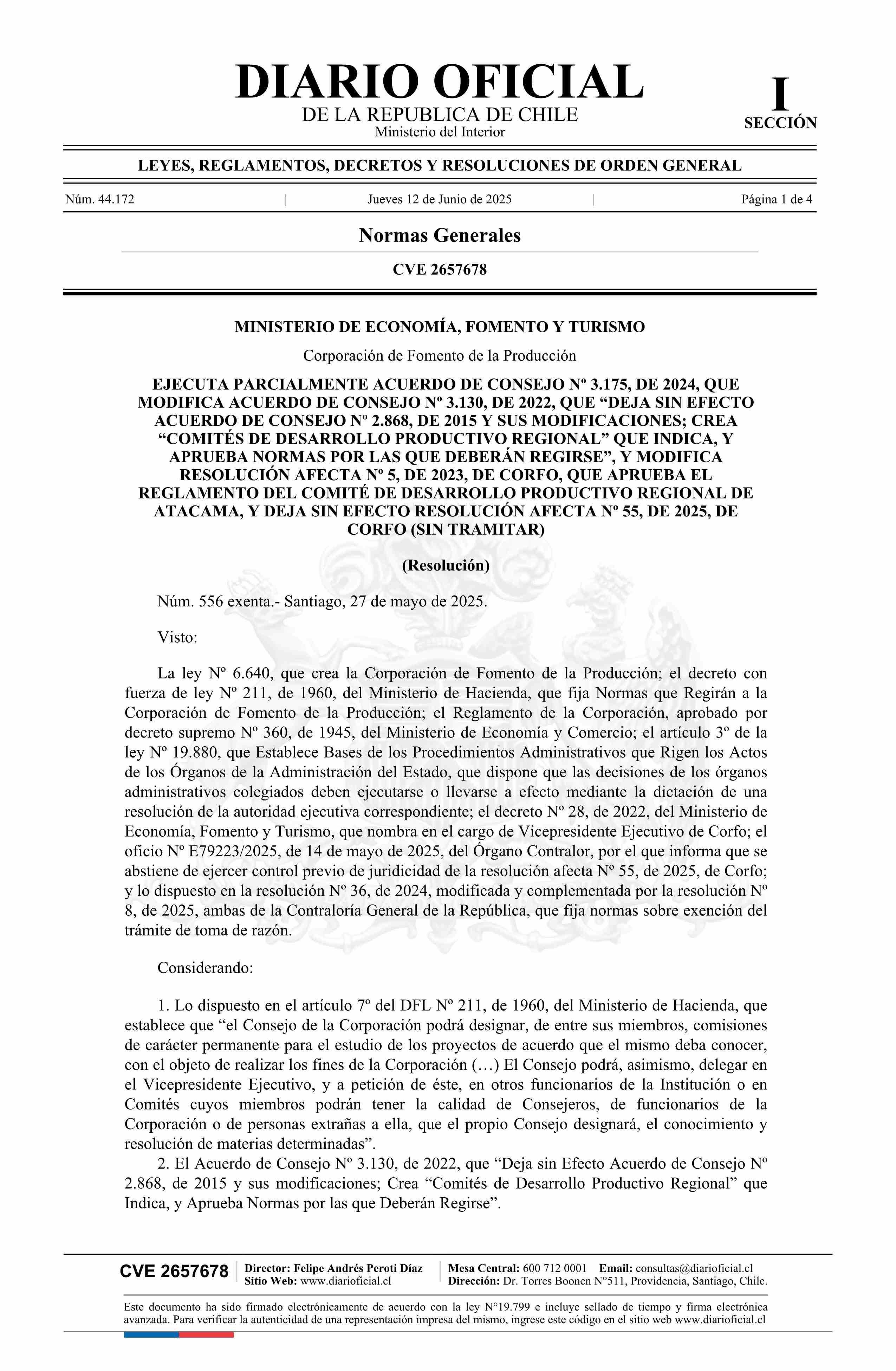 Título: Resolución exenta número 556, de 2025.- Ejecuta parcialmente Acuerdo de Consejo Nº 3.175, de 2024, que modifica Acuerdo de Consejo Nº 3.130, de 2022, que deja sin efecto Acuerdo de Consejo Nº 2.868, de 2015, y sus modificaciones; crea Comités de Desarrollo Productivo Regional que indica, y aprueba n