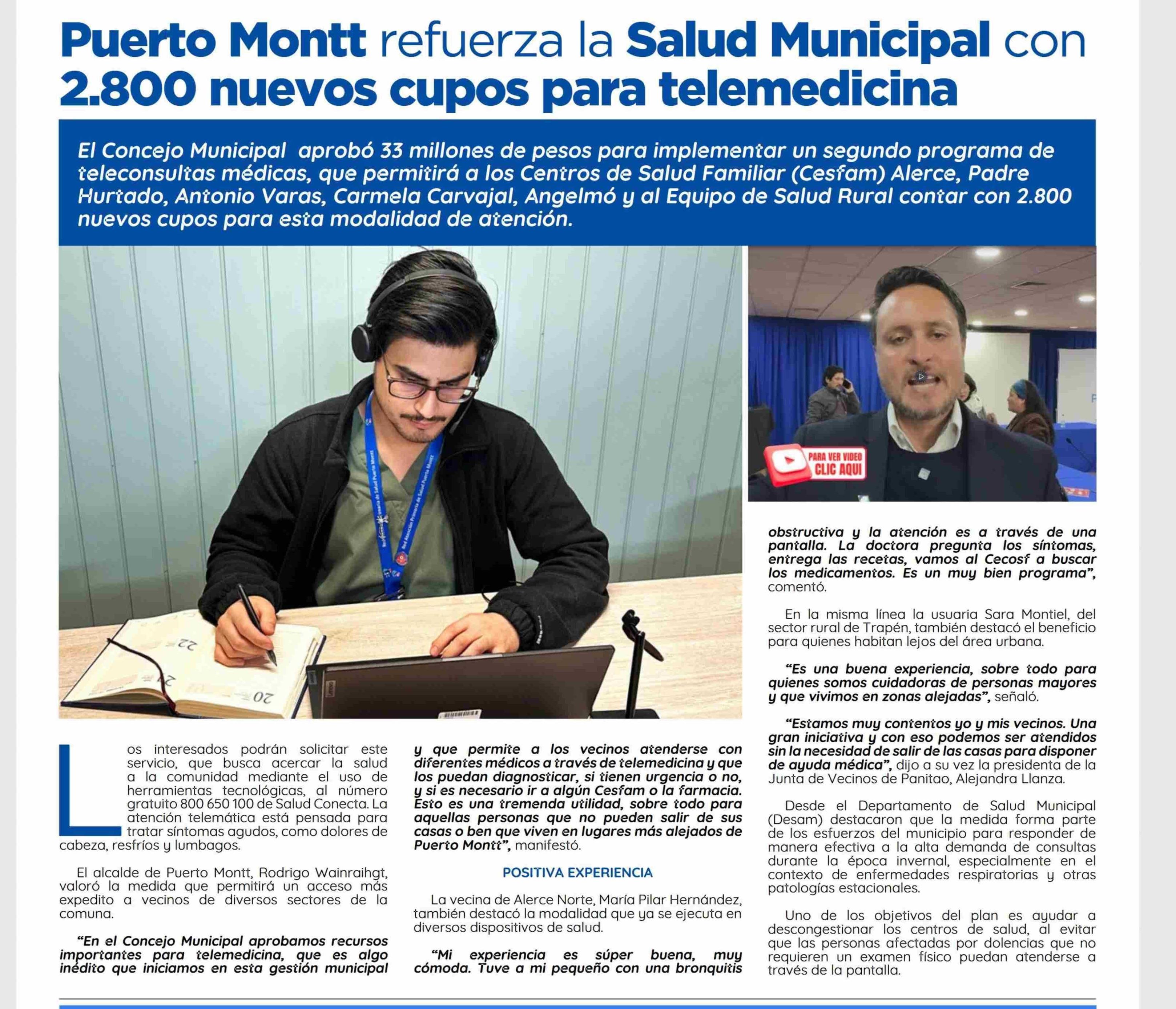 | Título: | Puerto Montt refuerza la Salud Municipal con 2.800 nuevos cupos para telemedicina |