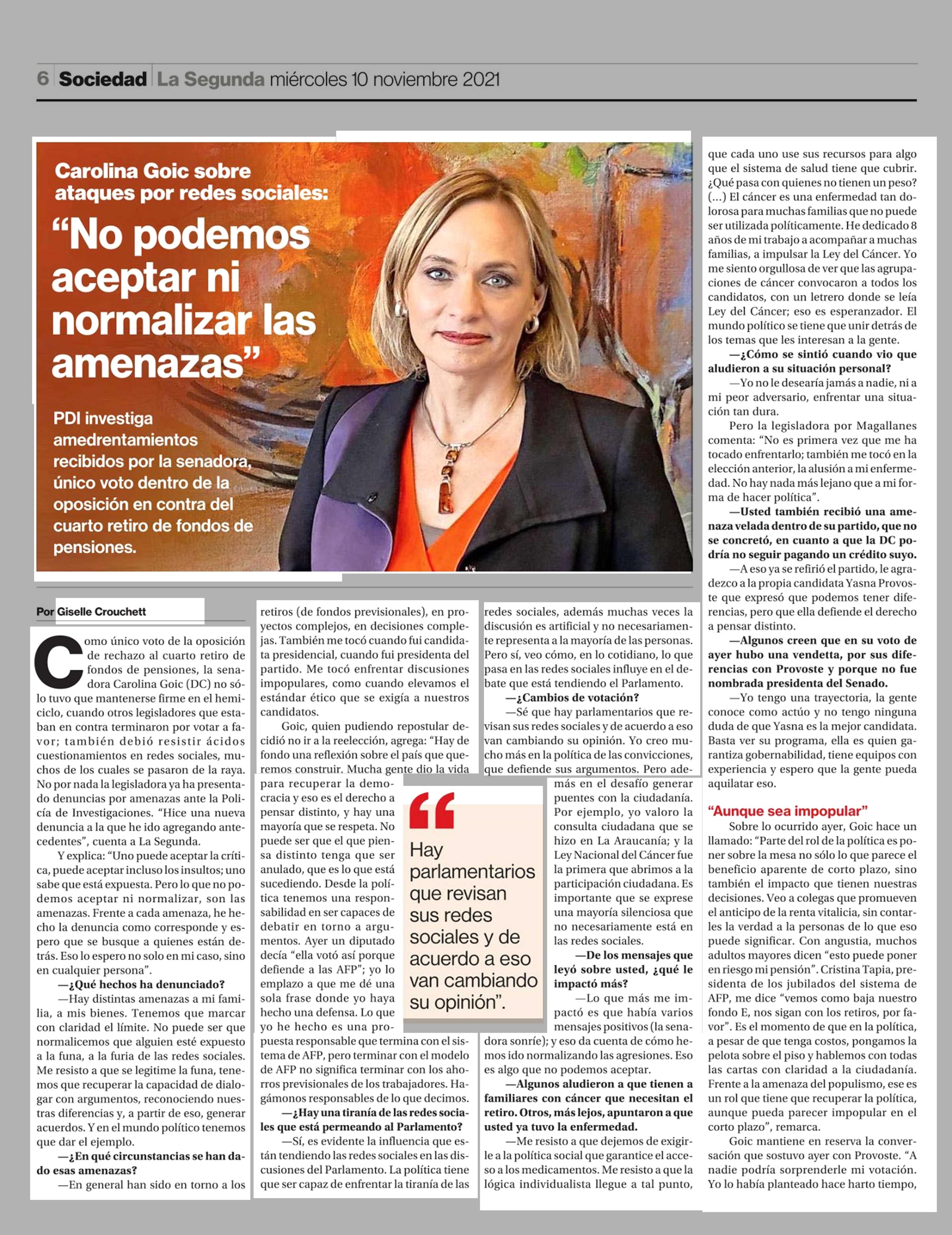 "No podemos aceptar ni normalizar las amenazas" 10-11-2021 La Segunda |