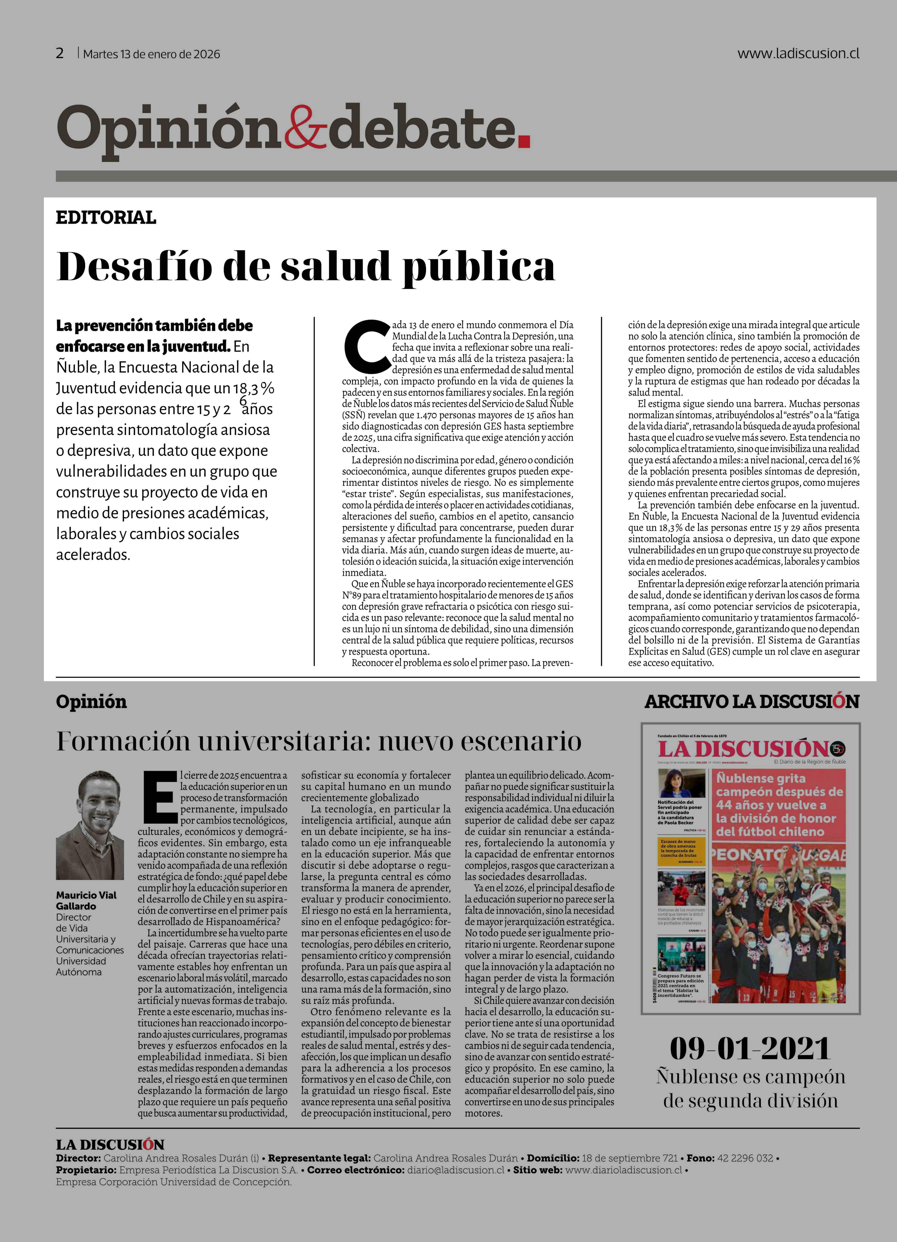 Editorial: Desafío de salud pública 13-01-2026 La Discusión |