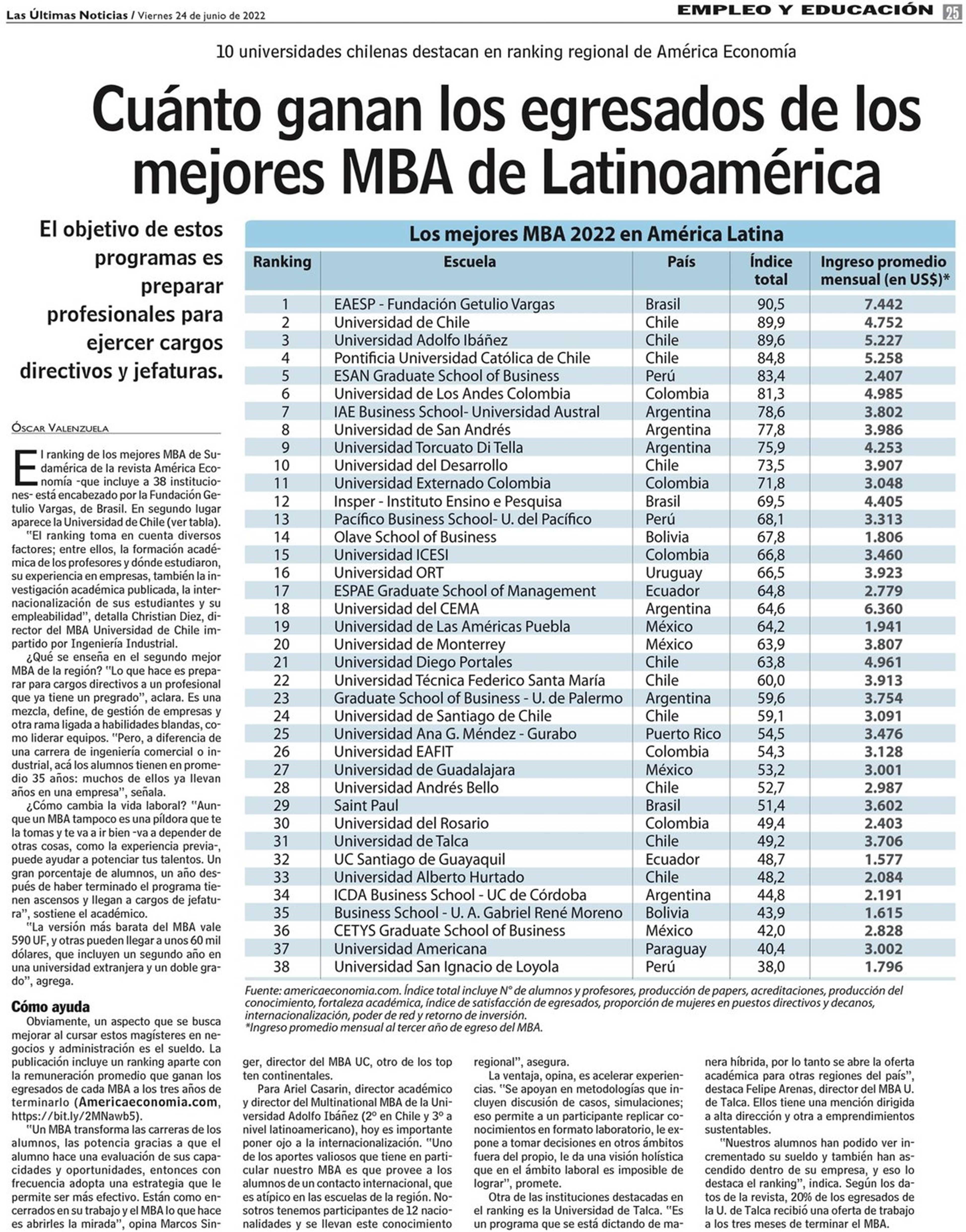 Cuánto ganan los egresados de los mejores MBA de Latinoamérica 24-06-2022 Las Últimas Noticias |