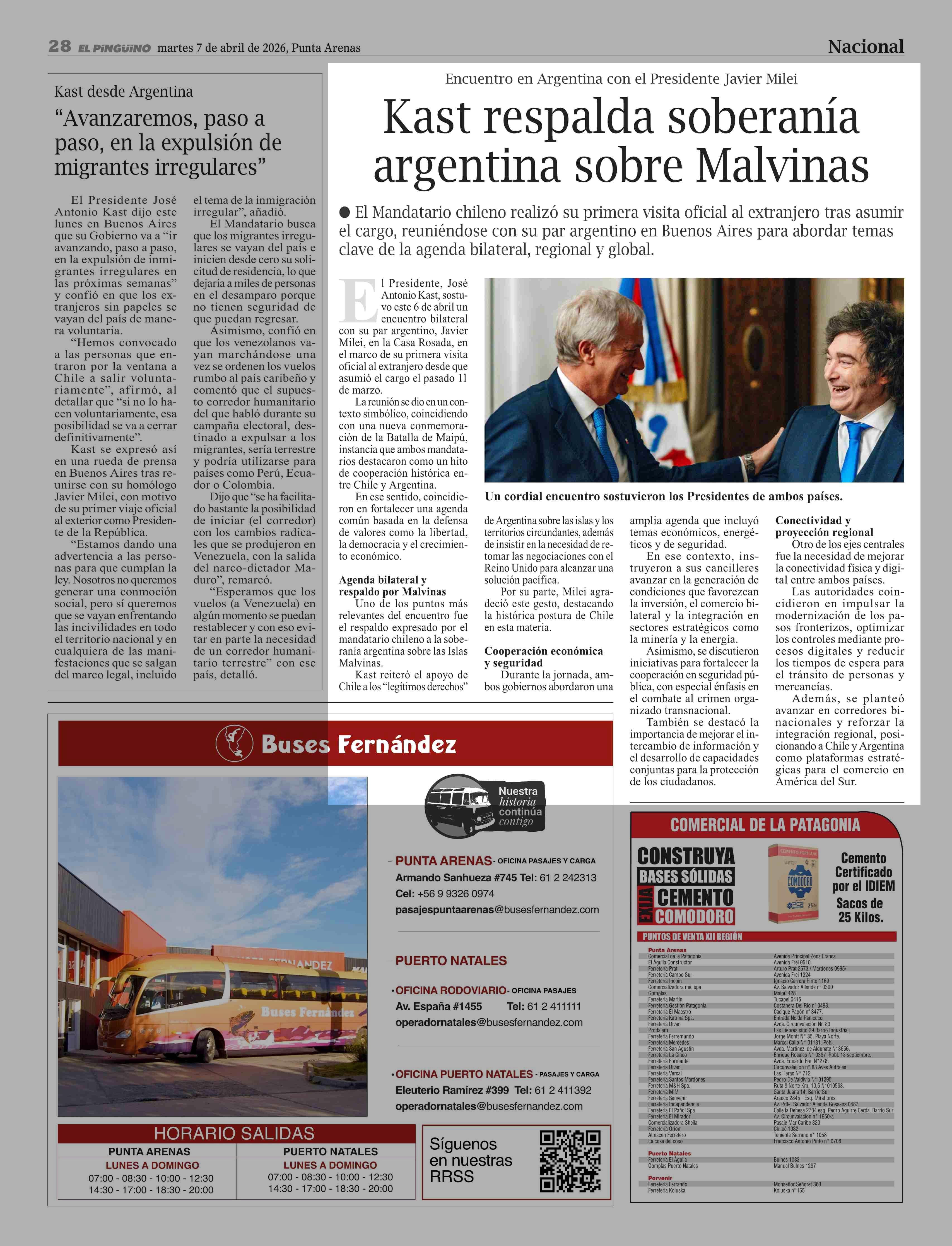 Kast respalda soberanía argentina sobre Malvinas 07-04-2026 El Pingüino |