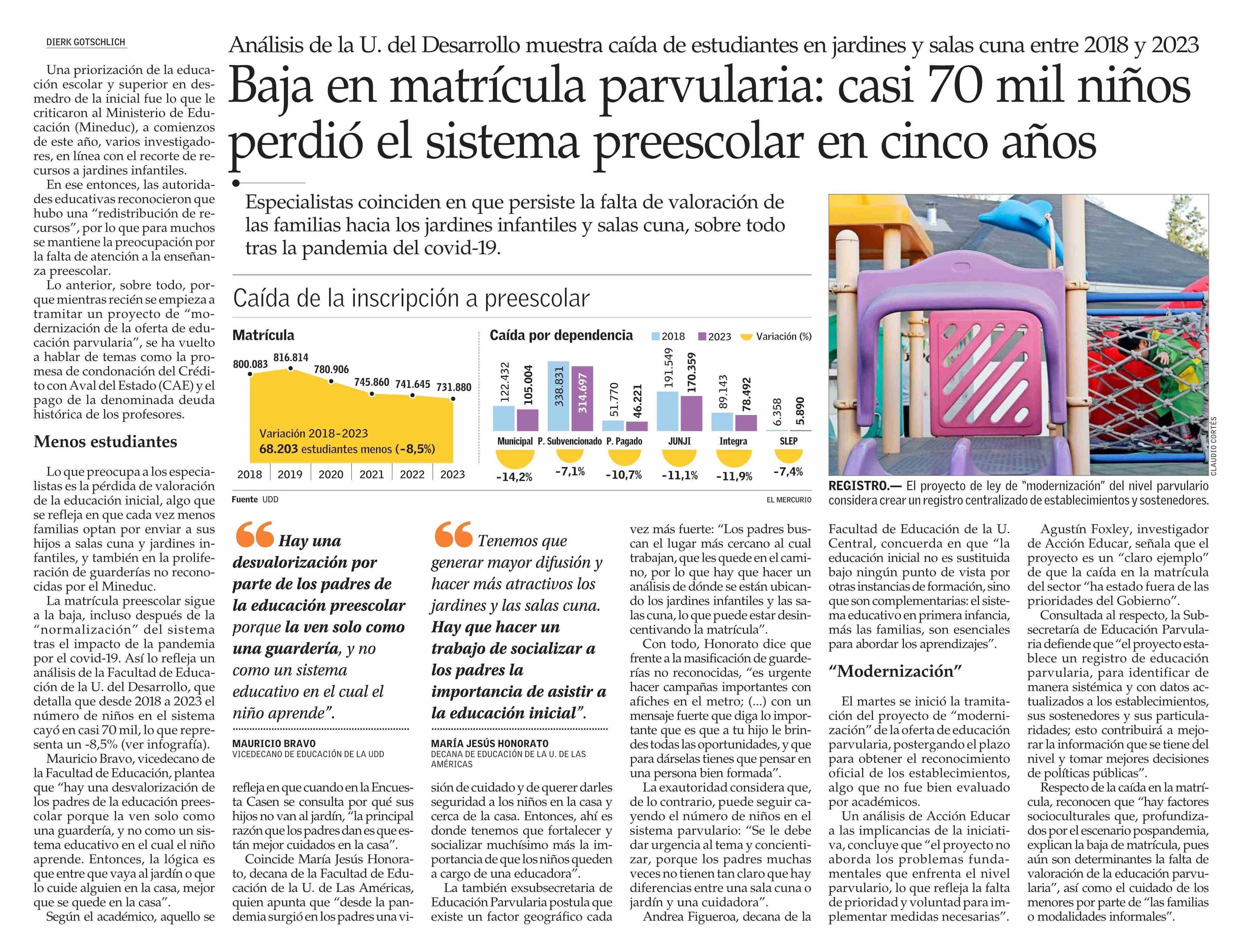 Baja en matrícula parvularia: casi 70 mil niños perdió el sistema preescolar en cinco años 19-05-2024 El Mercurio |