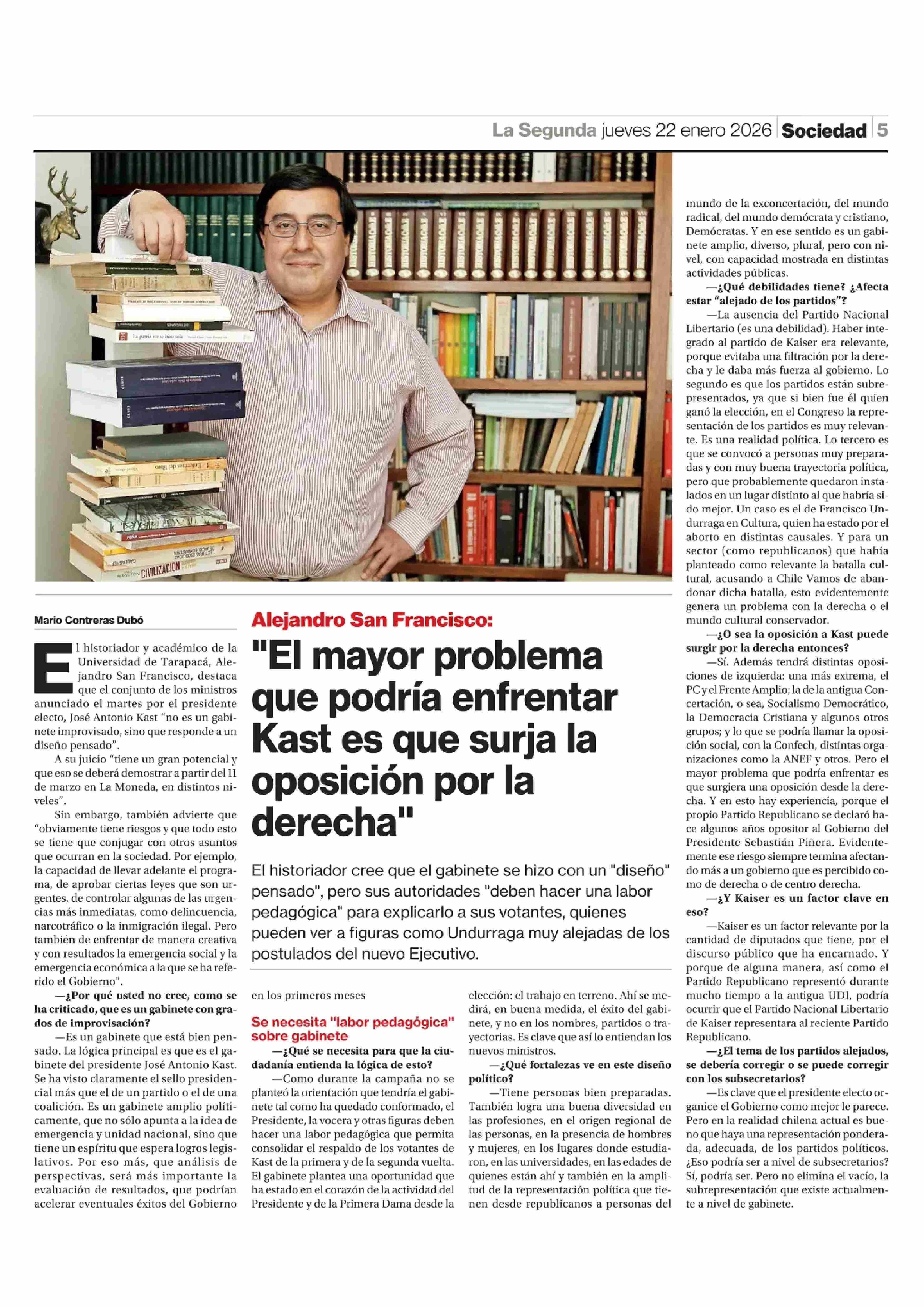 "El mayor problema que podría enfrentar Kast es que surja la oposición por la derecha" 22-01-2026 La Segunda |
