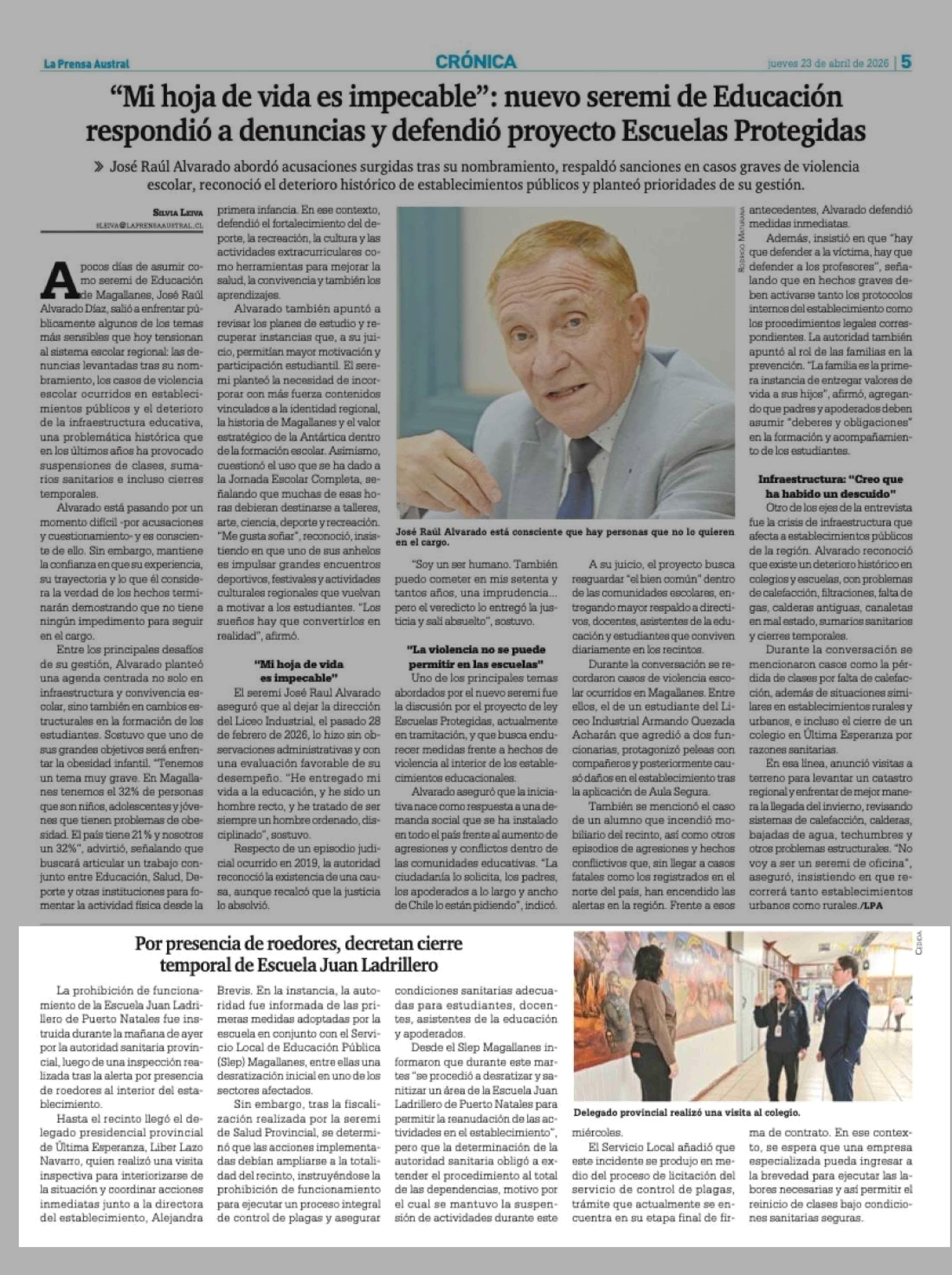 Por presencia de roedores, decretan cierre temporal de Escuela Juan Ladrillero 23-04-2026 La Prensa Austral |