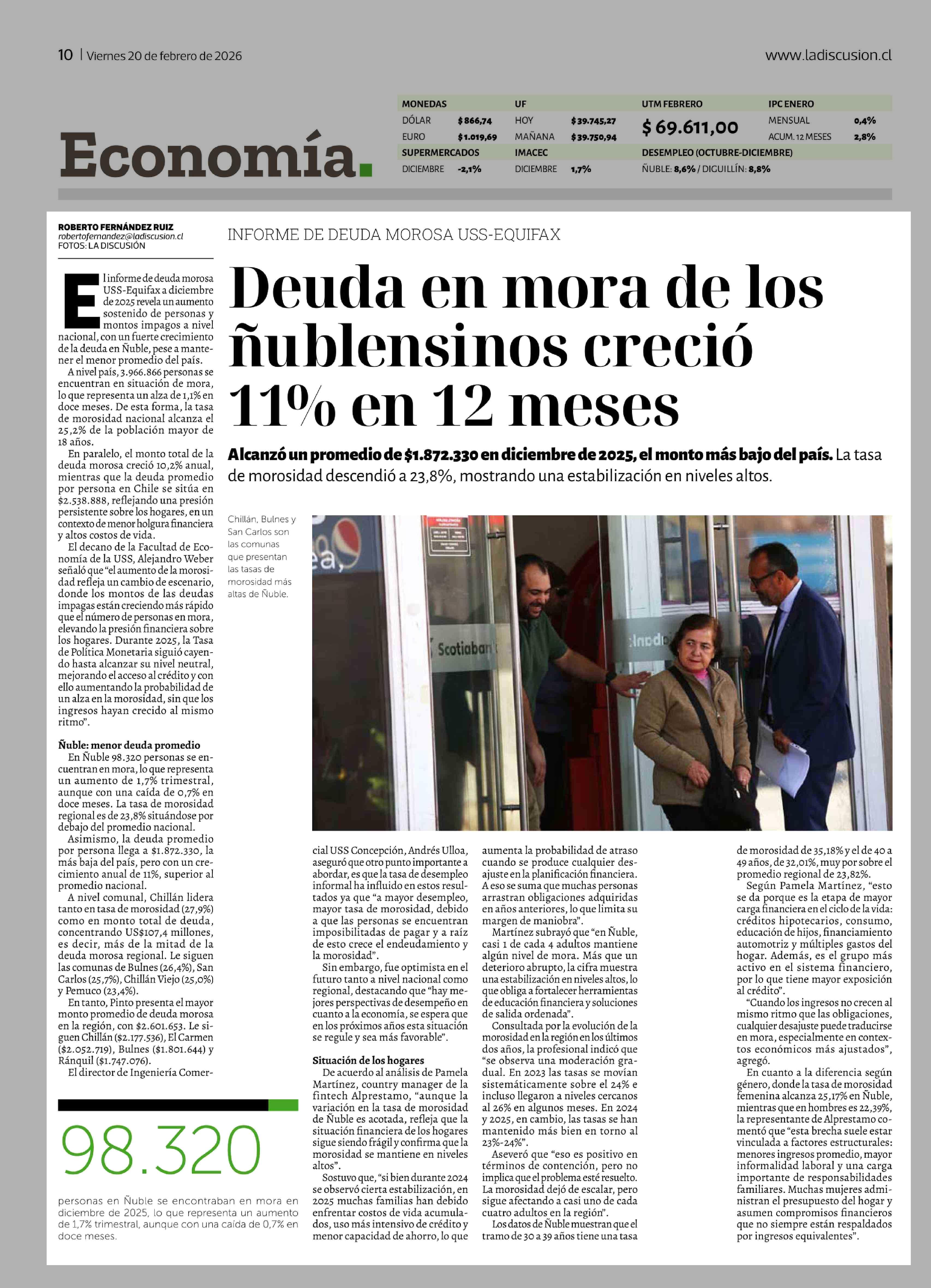 Deuda en mora de los ñublensinos creció 11% en 12 meses 20-02-2026 La Discusión |