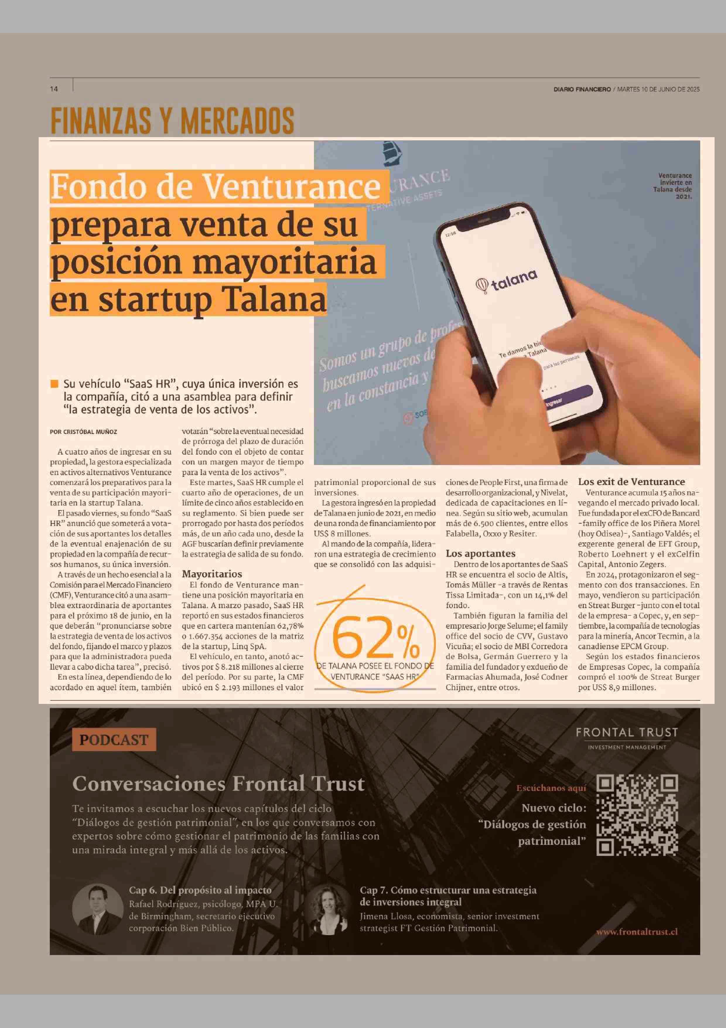 Fondo de Venturance prepara venta de su posición mayoritaria en startup Talana 10-06-2025 Diario Financiero |