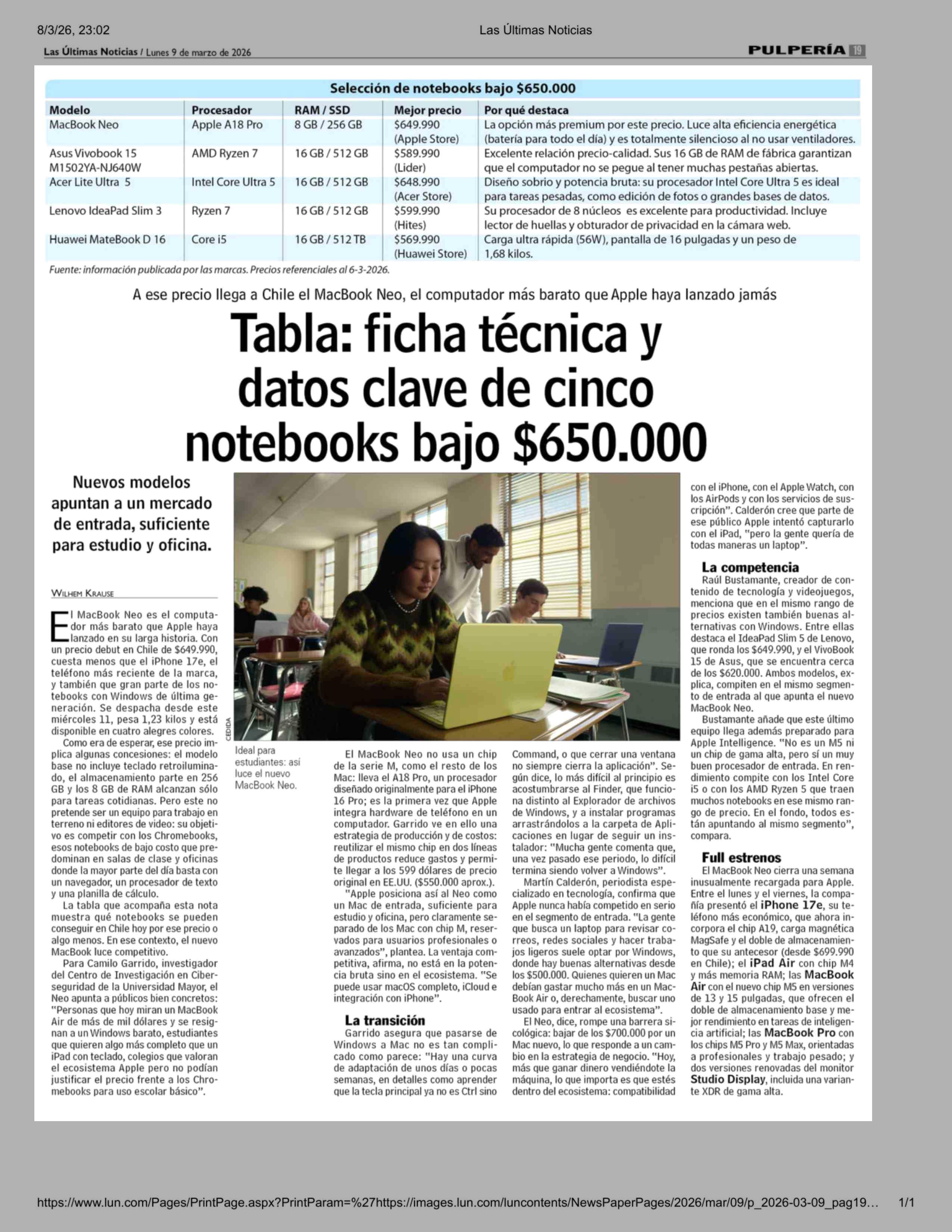 Tabla: ficha técnica y datos clave de cinco notebooks bajo $650.000 09-03-2026 Las Últimas Noticias |