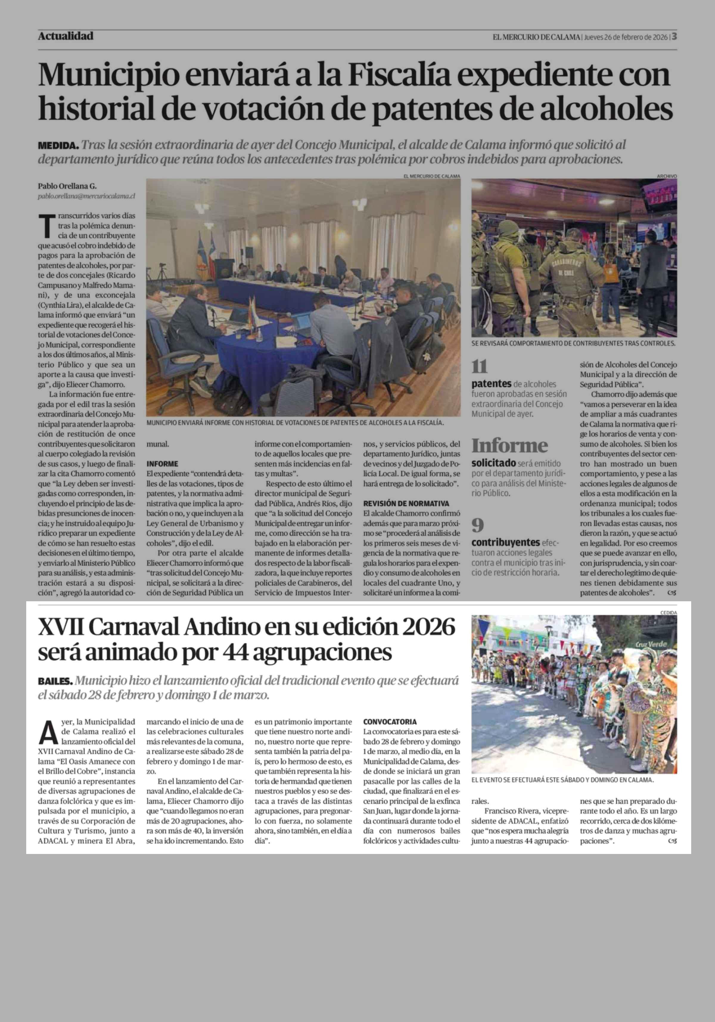 XVII Carnaval Andino en su edición 2026 será animado por 44 agrupaciones 26-02-2026 El Mercurio de Calama |