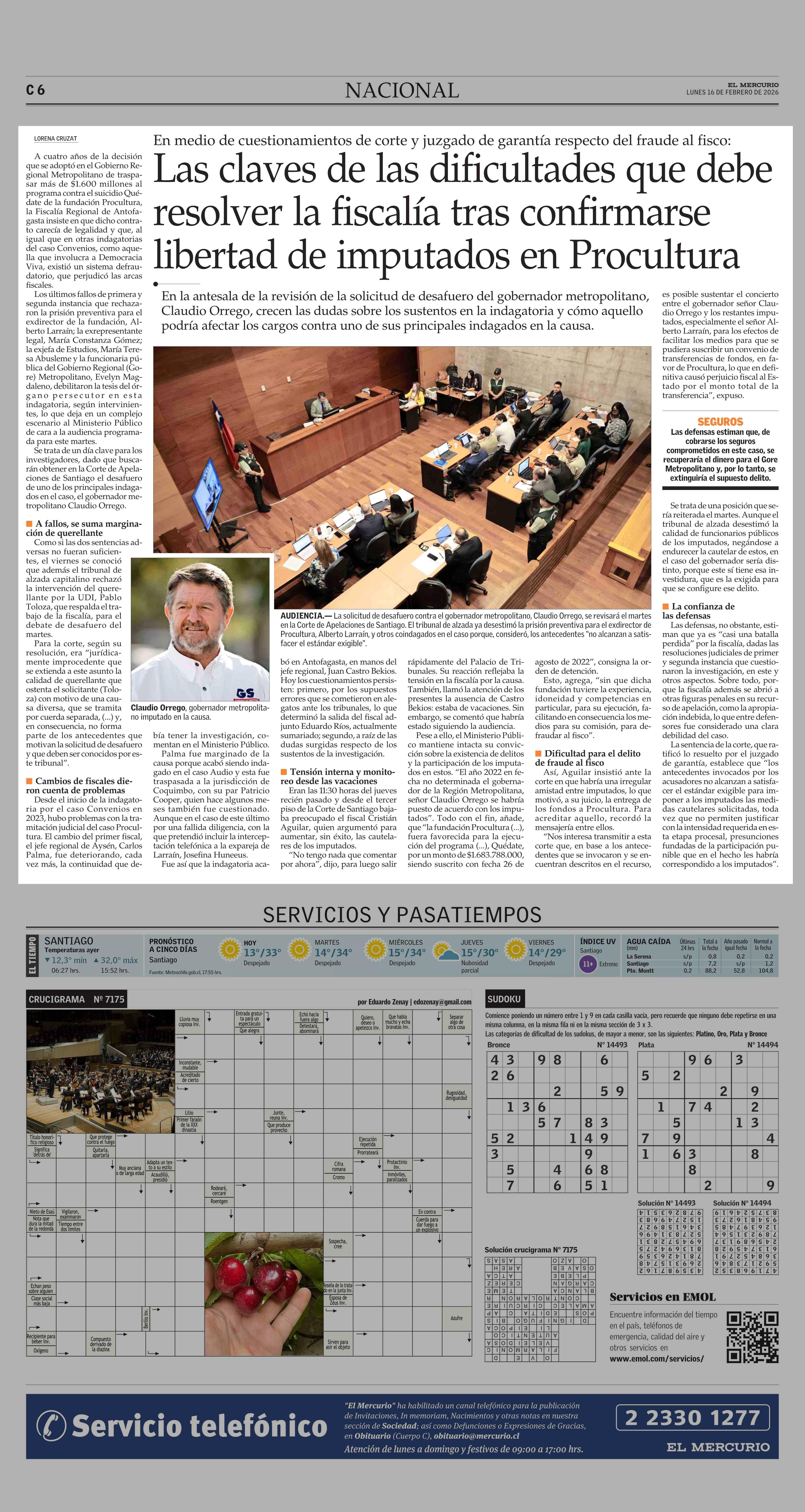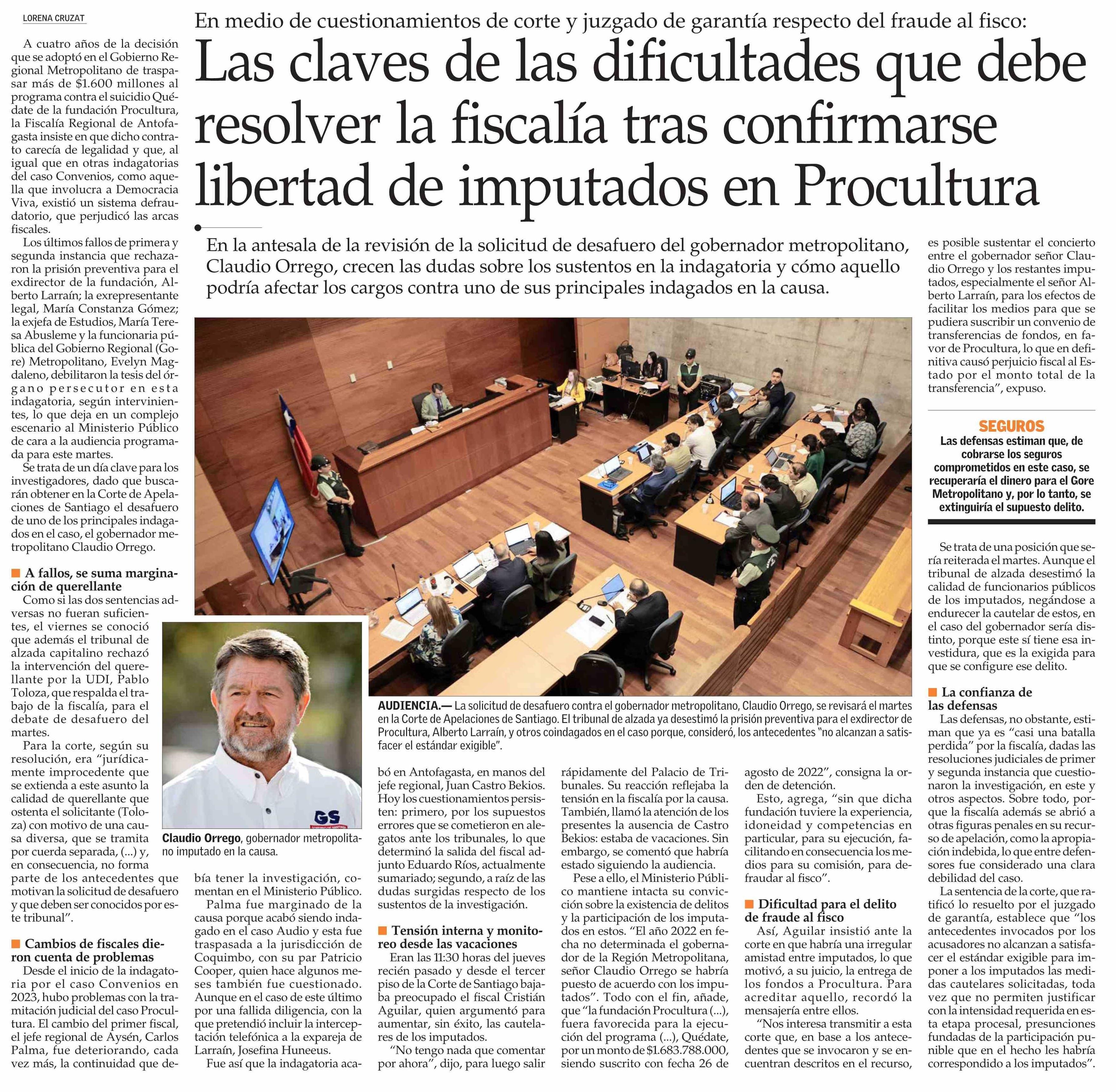 Las claves de las dificultades que debe resolver la fiscalía tras confirmarse libertad de imputados en Procultura 16-02-2026 El Mercurio |