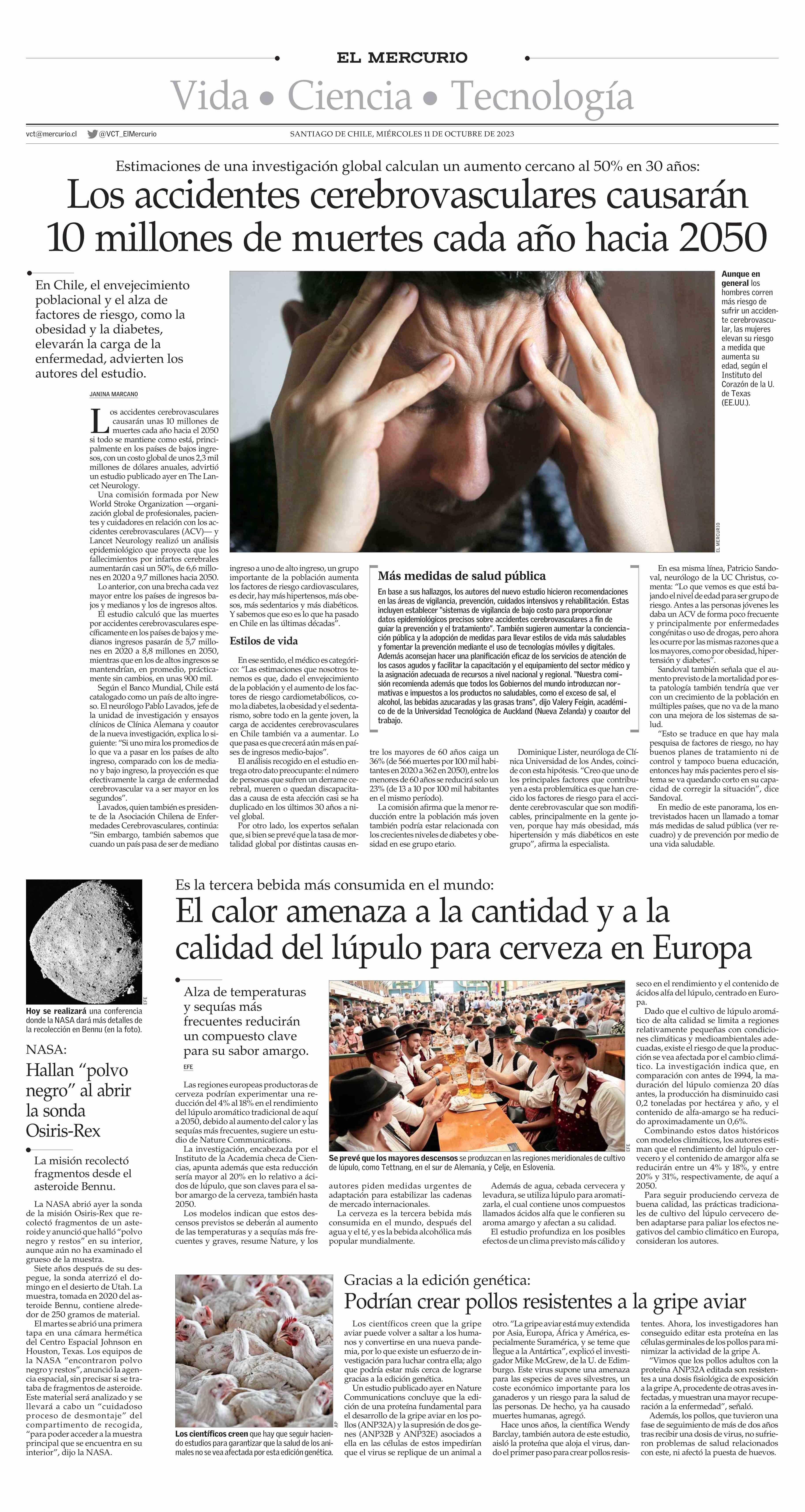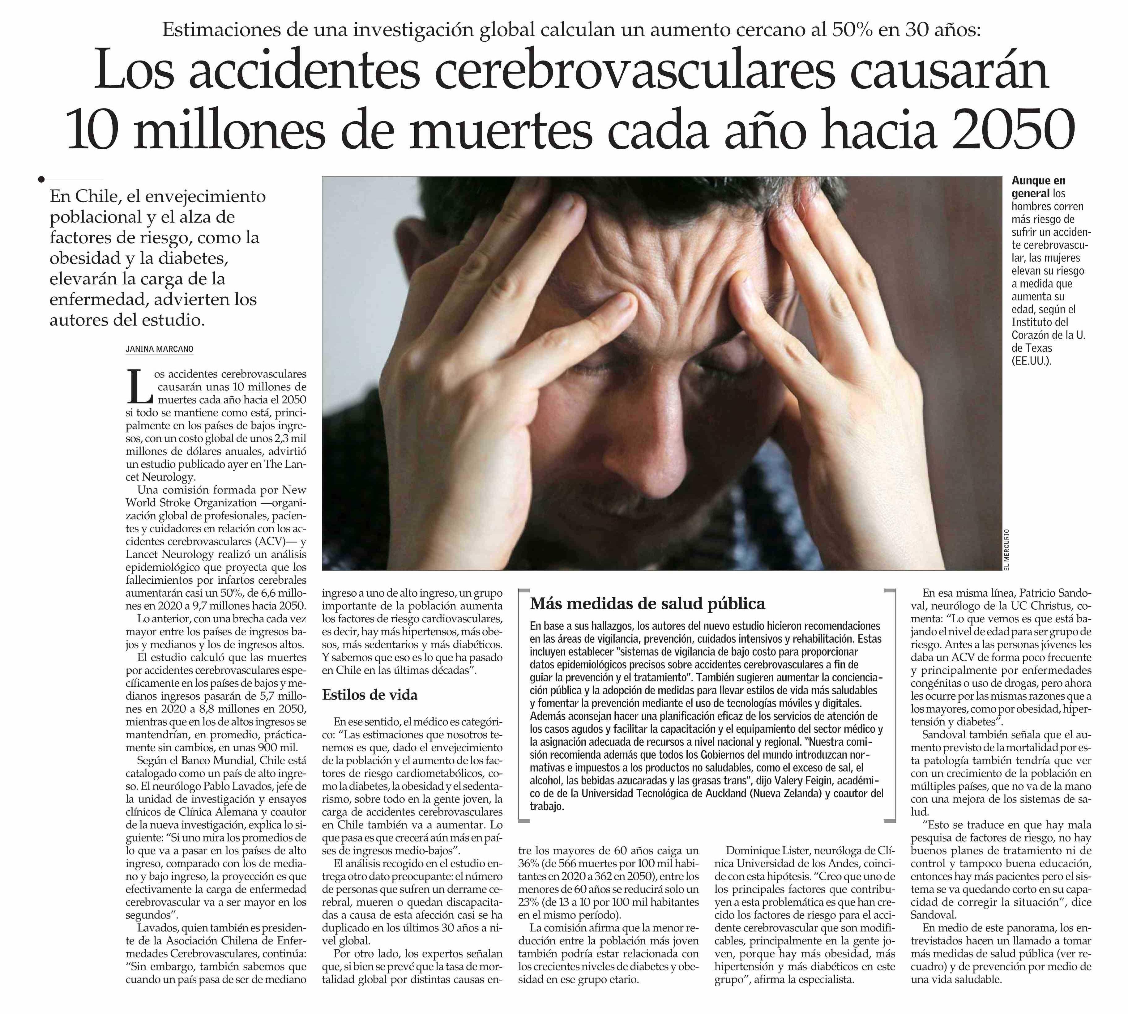 Los accidentes cerebrovasculares causarán 10 millones de muertes cada año hacia 2050 11-10-2023 El Mercurio |
