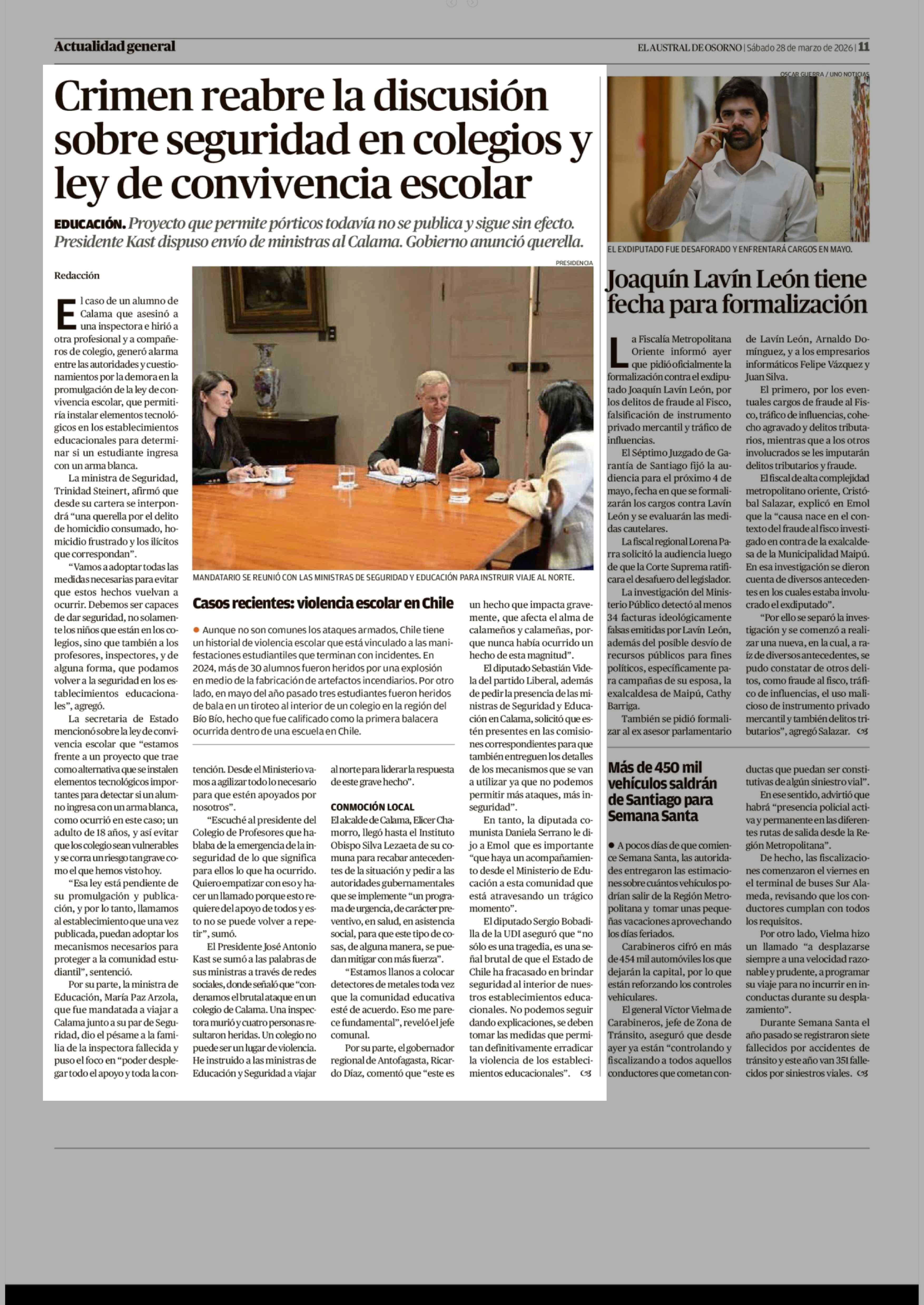 Crimen reabre la discusión sobre seguridad en colegios y ley de convivencia escolar 28-03-2026 El Austral de Osorno |