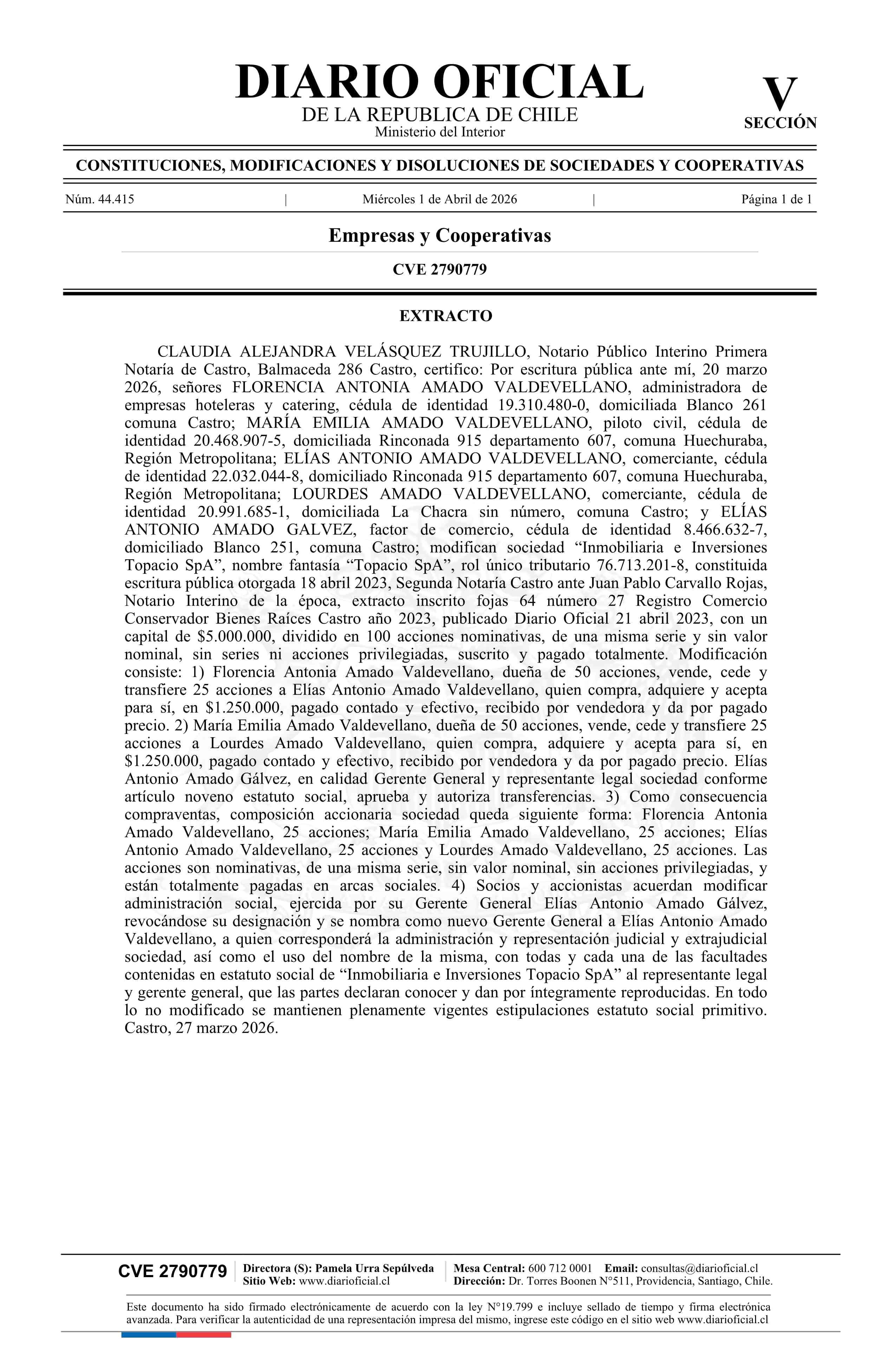 INMOBILIARIA E INVERSIONES TOPACIO SpA 76.713.201-8* 01-04-2026 Diario Oficial Edición Electrónica |