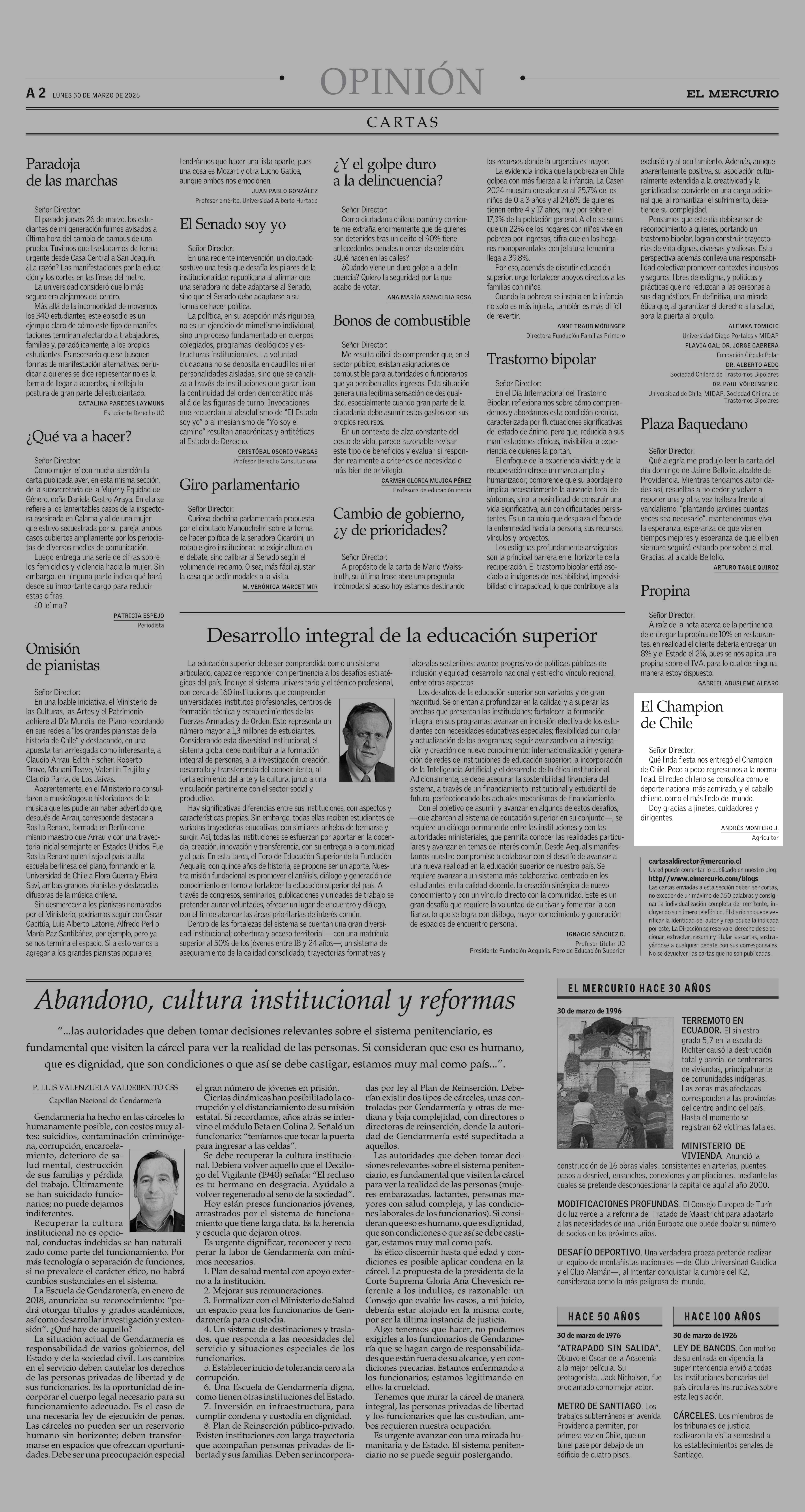 Cartas: El Champion de Chile 30-03-2026 El Mercurio |
