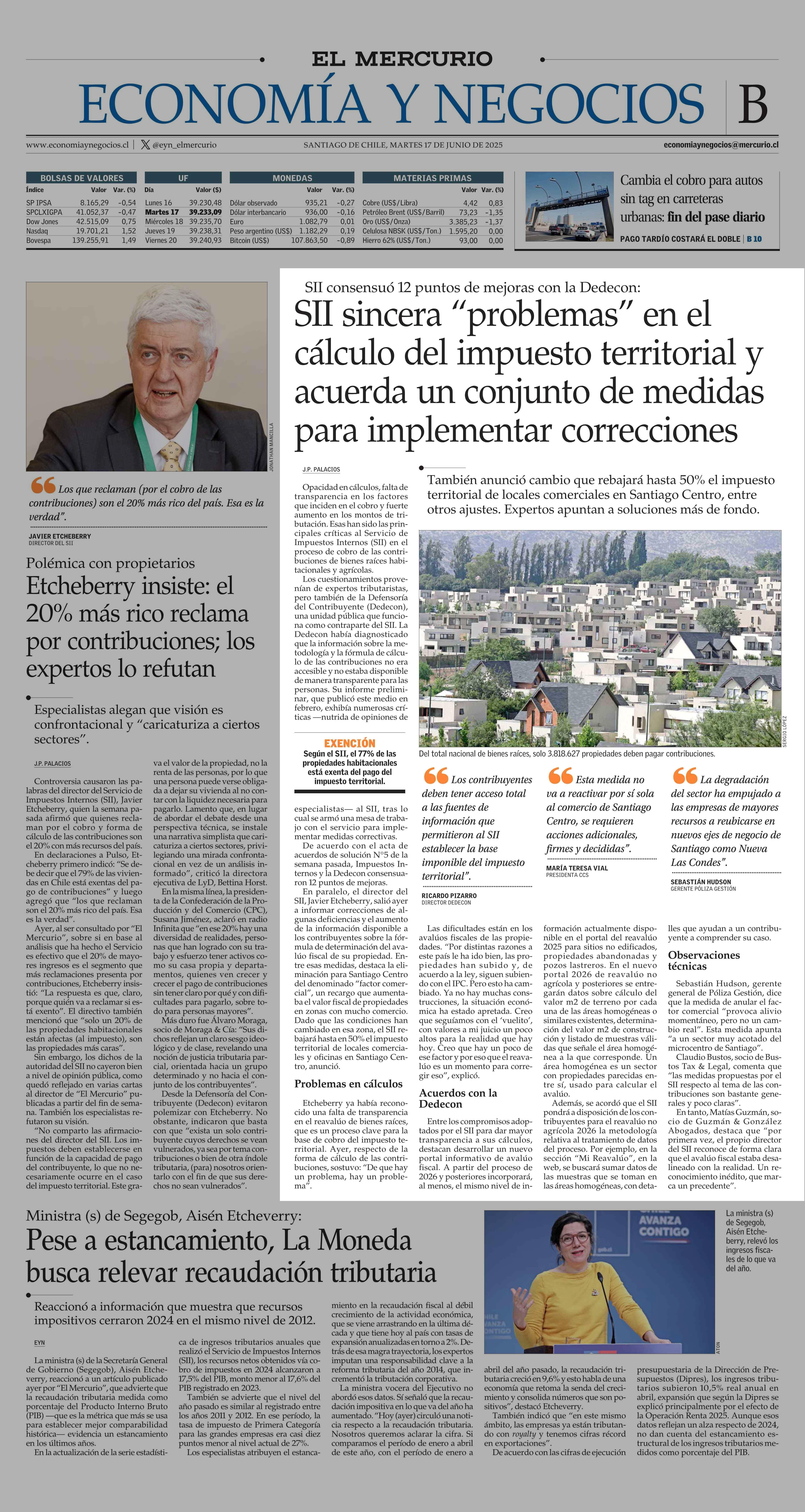 SII sincera “problemas” en el cálculo del impuesto territorial y acuerda un conjunto de medidas para implementar correcciones 17-06-2025 El Mercurio |