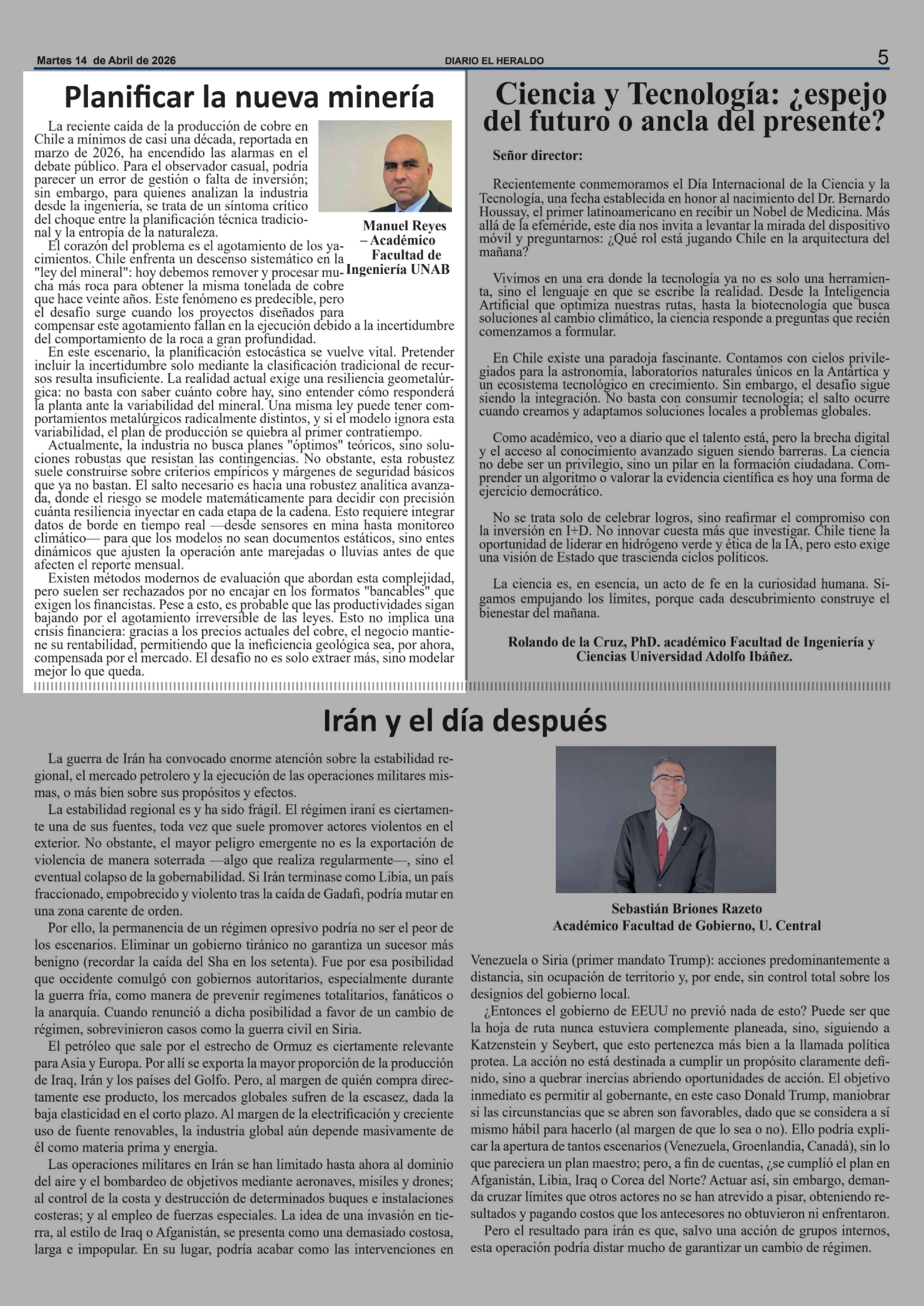 Columnas de Opinión: Planificar la nueva minería 14-04-2026 El Heraldo |