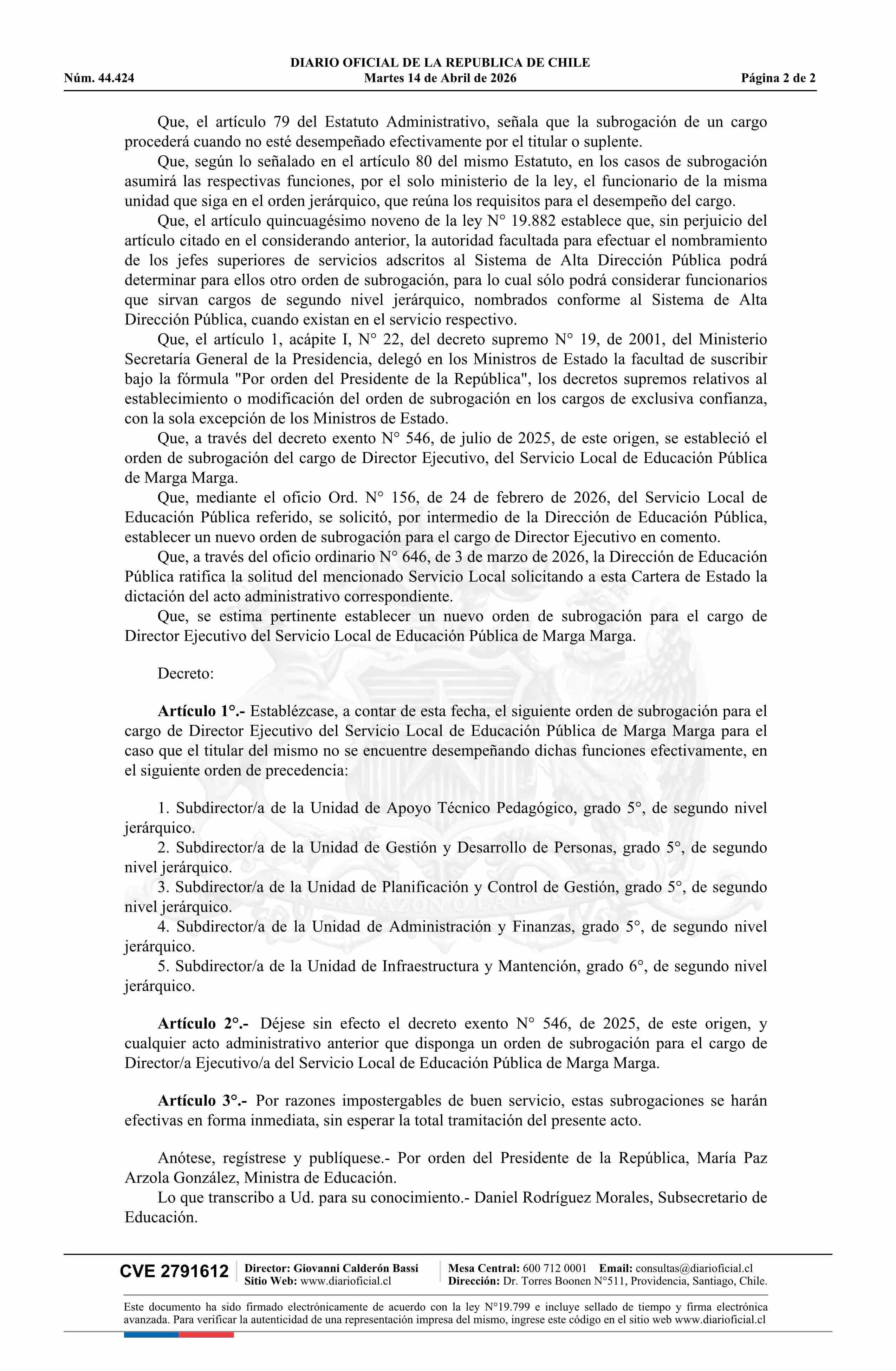Título: Decreto exento número 218, de 2026.- Establece nuevo orden de subrogación del cargo de Director/a Ejecutivo/a del Servicio Local de Educación Pública de Marga Marga