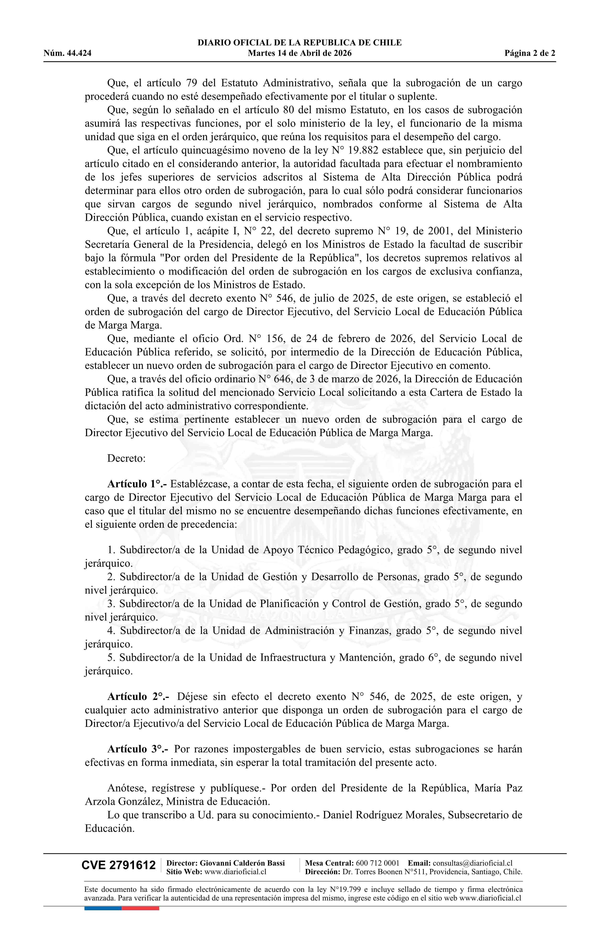 Decreto exento número 218, de 2026.- Establece nuevo orden de subrogación del cargo de Director/a Ejecutivo/a del Servicio Local de Educación Pública de Marga Marga 14-04-2026 Diario Oficial Edición Electrónica |