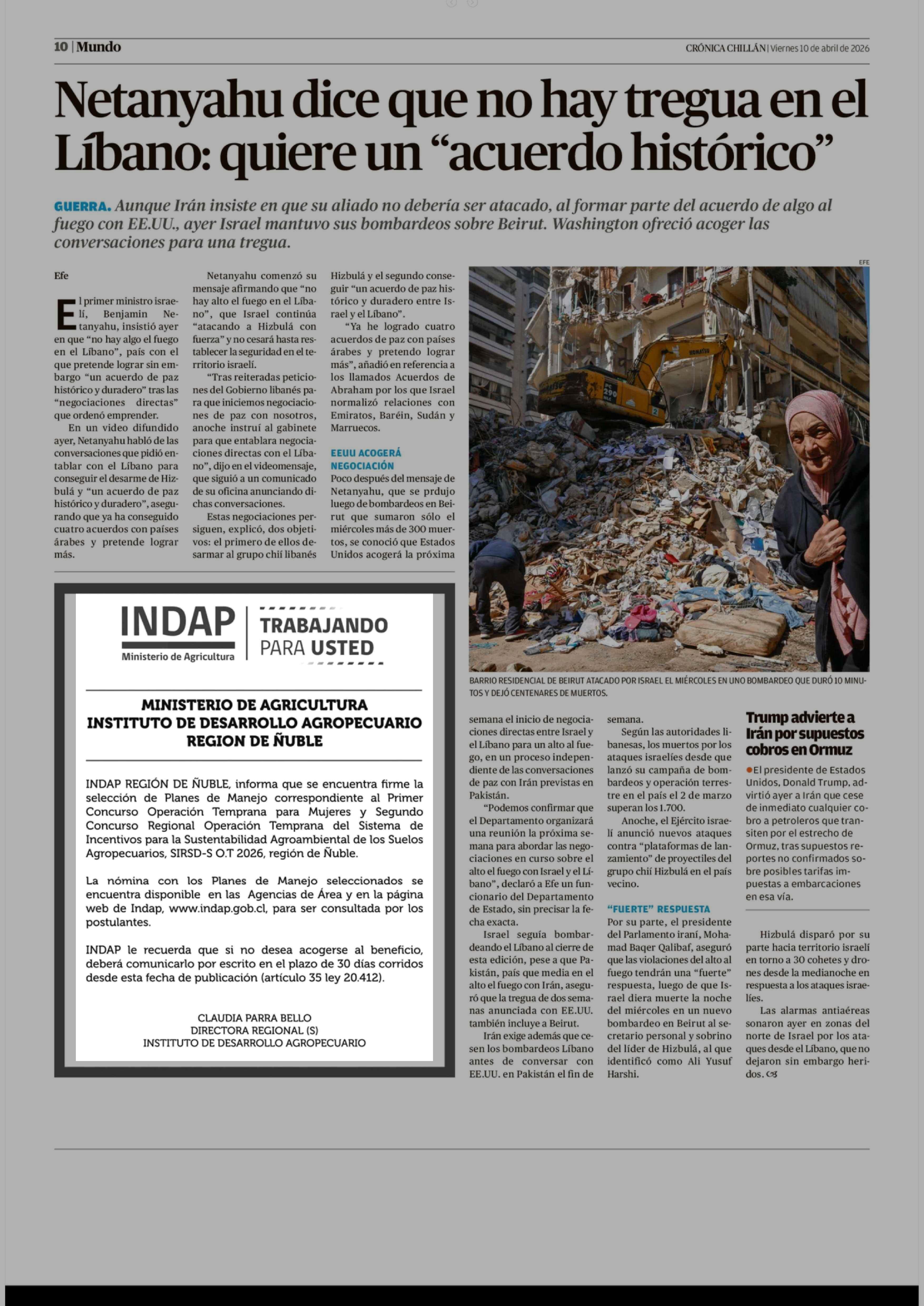 Extractos: MINISTERIO DE AGRICULTURA INSTITUTO DE DESARROLLO AGROPECUARIO REGION DE ÑUBLE 10-04-2026 Crónica de Chillán |