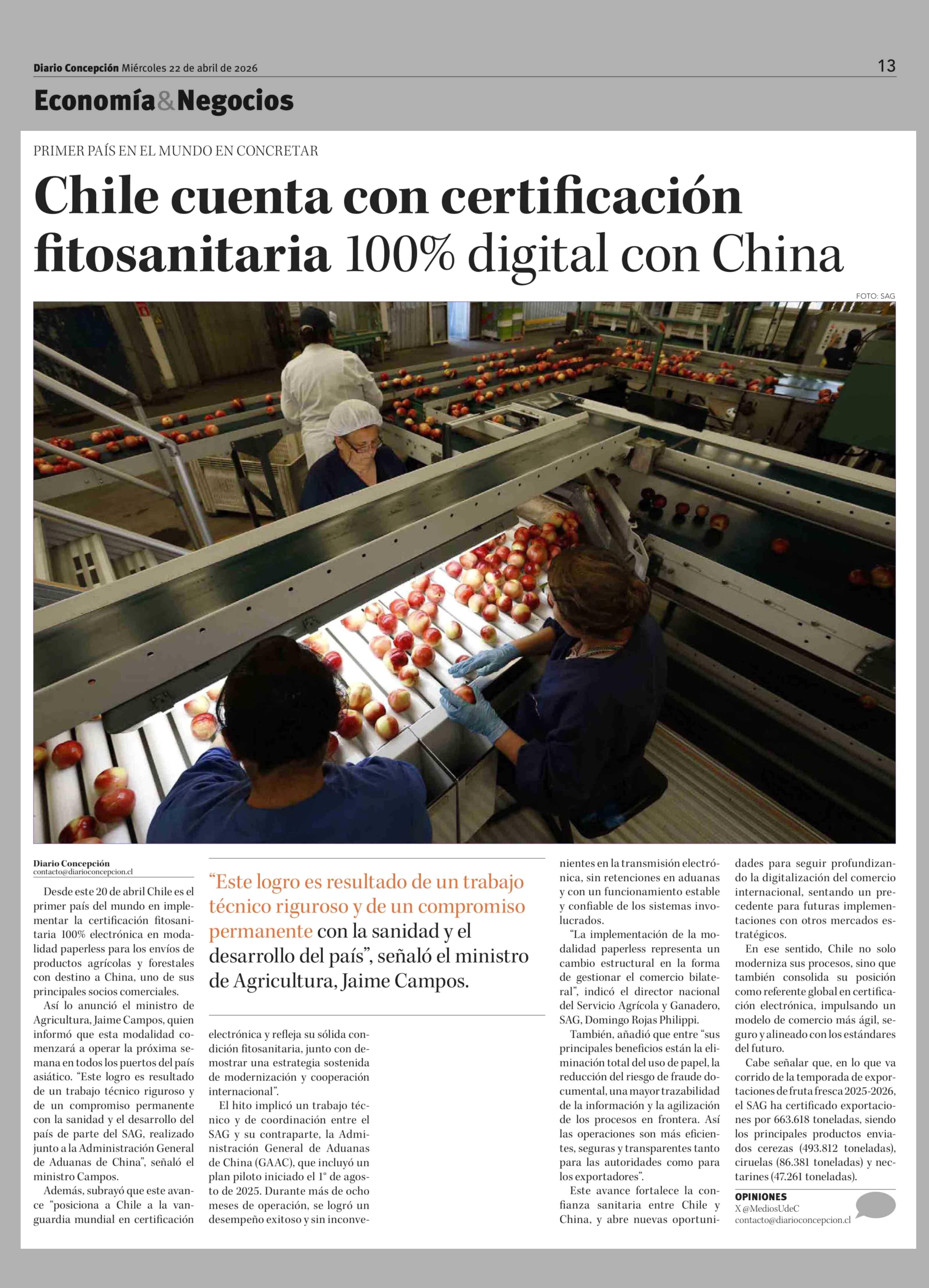 Chile cuenta con certificación fitosanitaria 100% digital con China 22-04-2026 Diario Concepción |