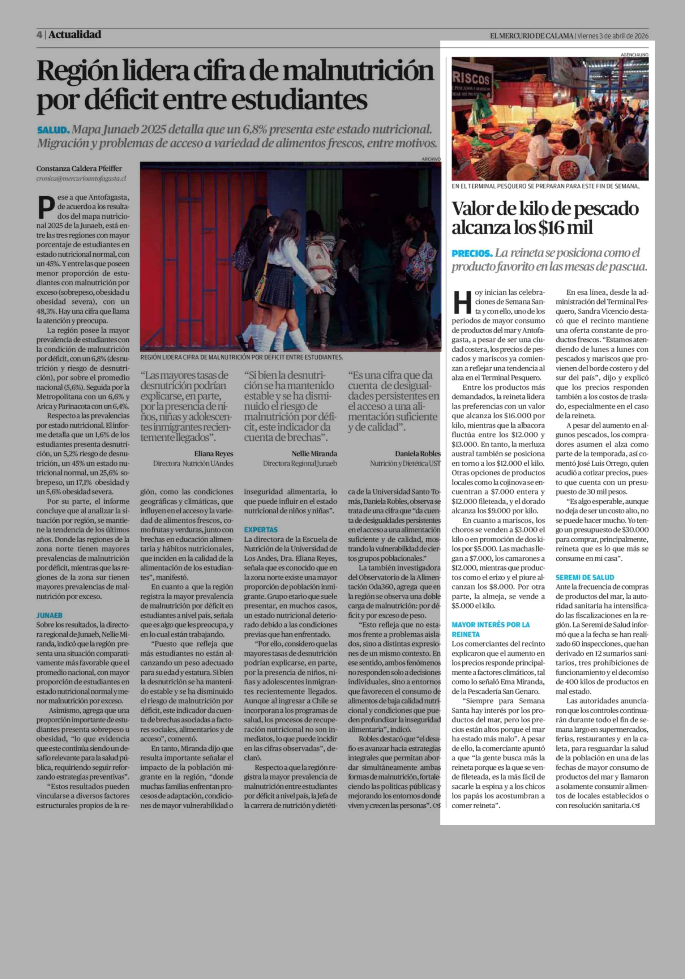 Valor de kilo de pescado alcanza los $16 mil 03-04-2026 El Mercurio de Calama |