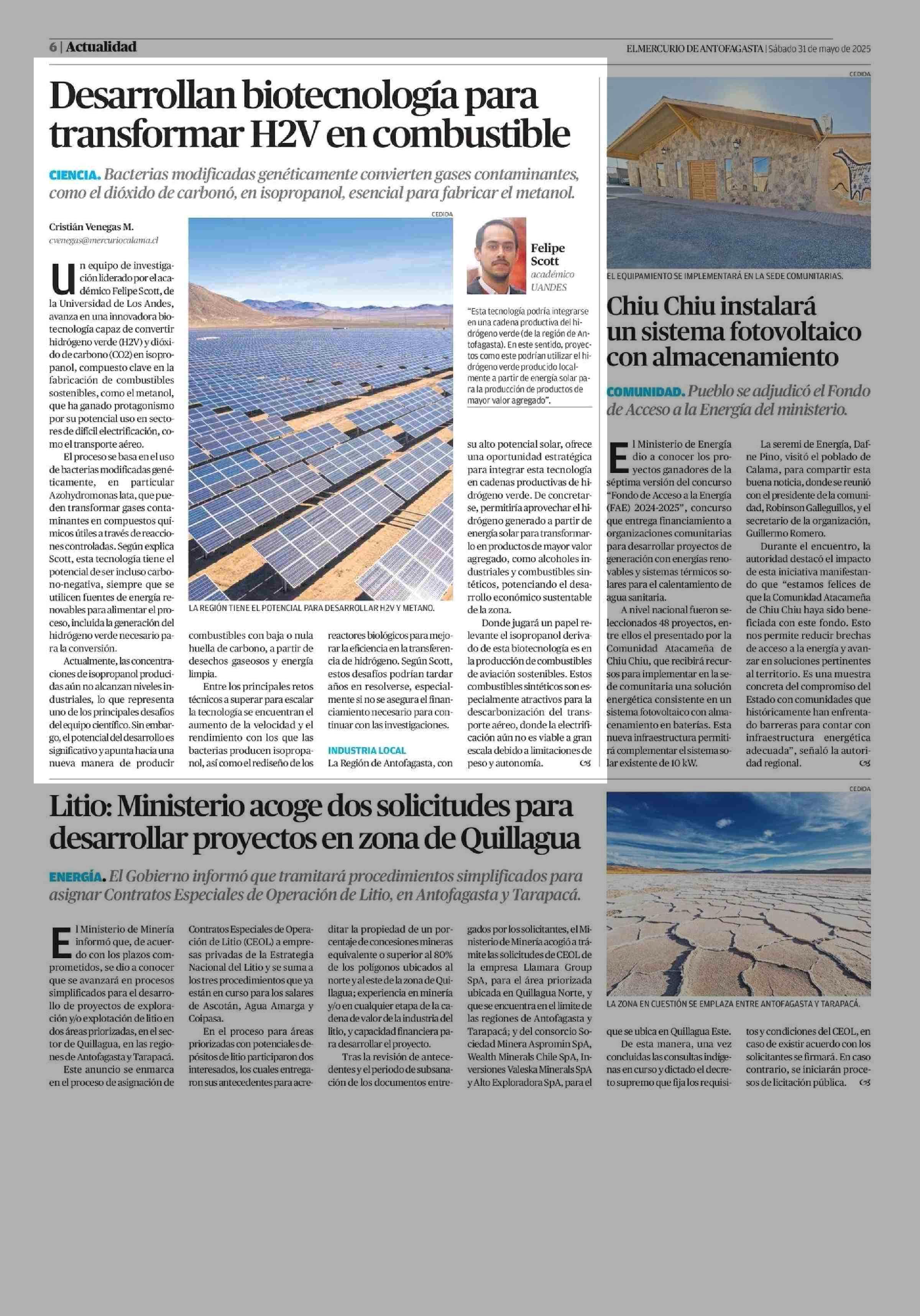 Desarrollan biotecnología para transformar H2V en combustible 31-05-2025 El Mercurio de Antofagasta |
