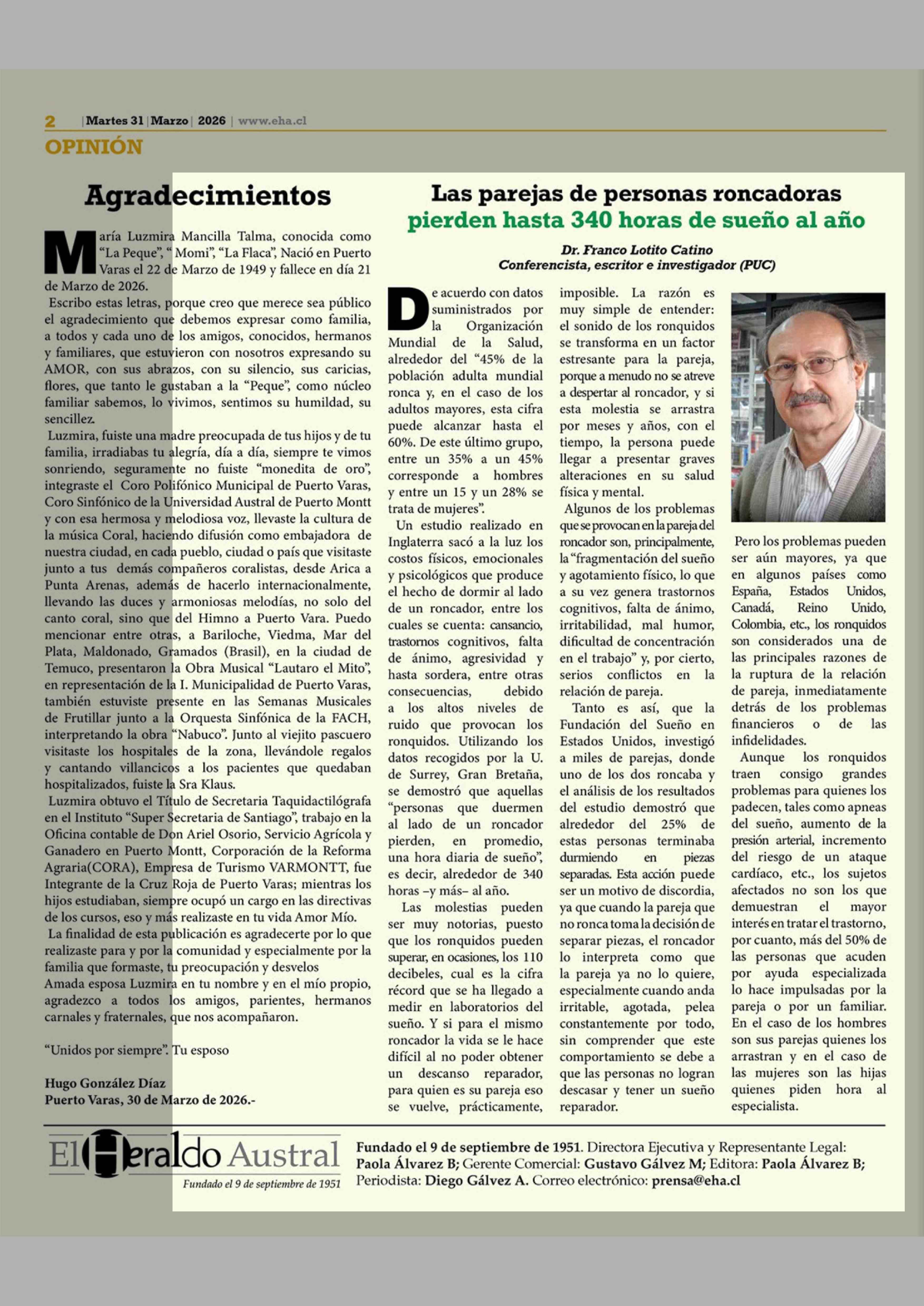 Columnas de Opinión: Las parejas de personas roncadoras pierden hasta 340 horas de sueño al año 31-03-2026 El Heraldo Austral |